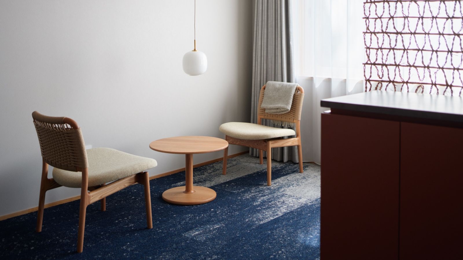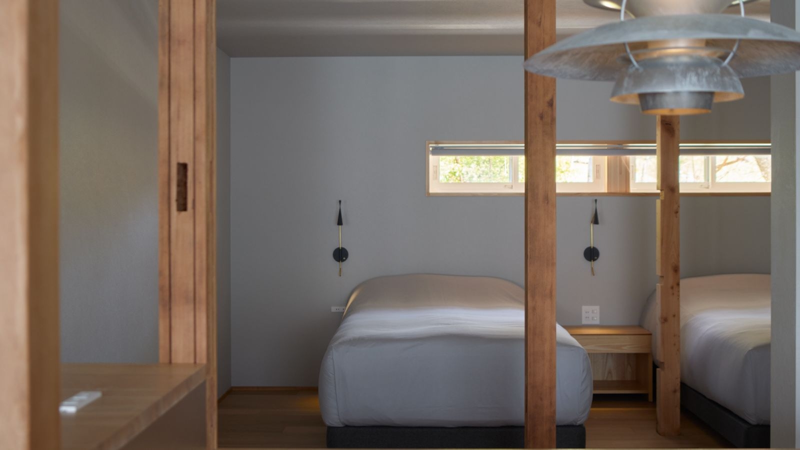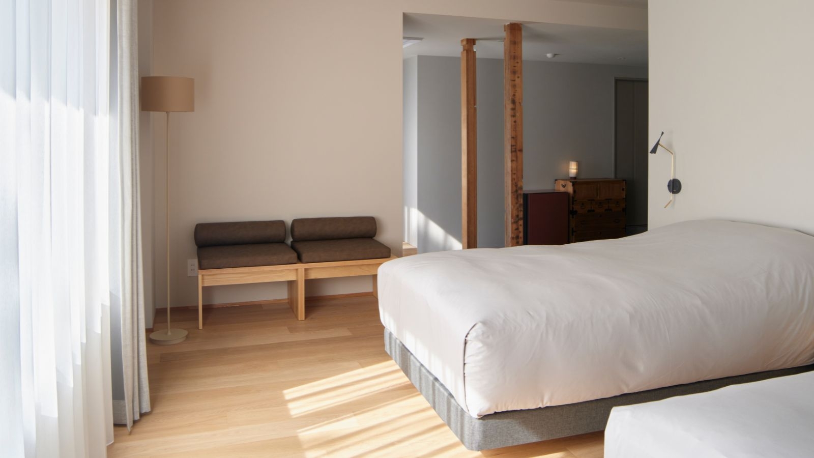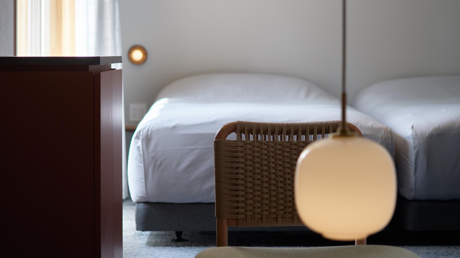 柔らかな光が差し込む、明るいツインルーム。 このクリエイターズ・ツインは、仕事や創作活動に集中できる空間です。 デスクが完備され、PC作業や書類を広げることも。