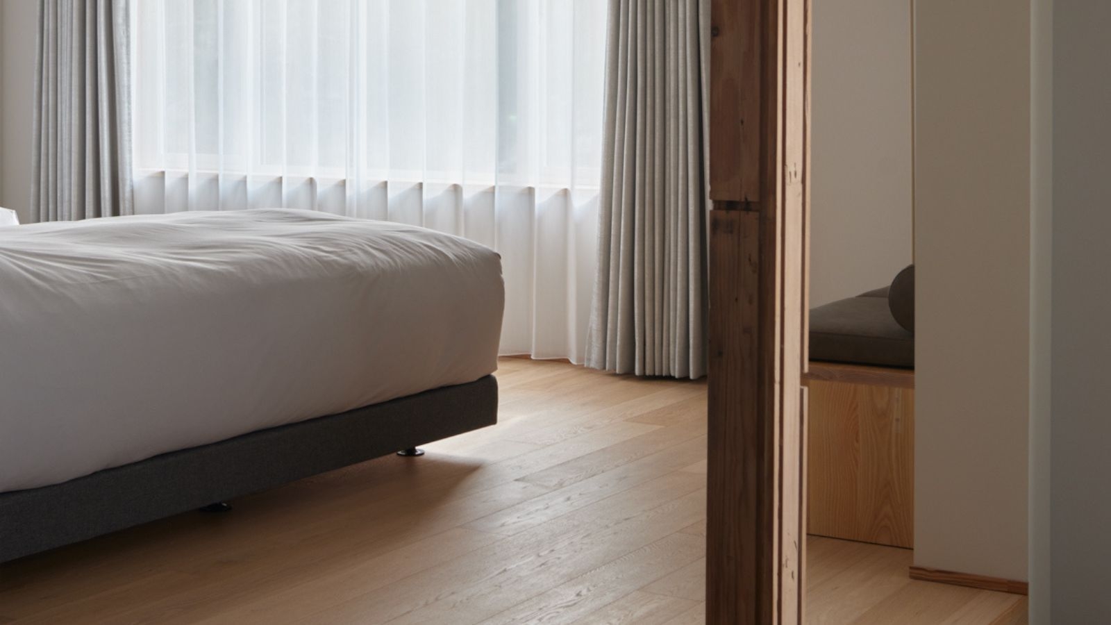 大きな窓辺で景色を楽しむ、2階のツインルーム。 窓辺のベンチでは、刻々と移り変わる景色を眺めながら、静かなひとときをお楽しみください。