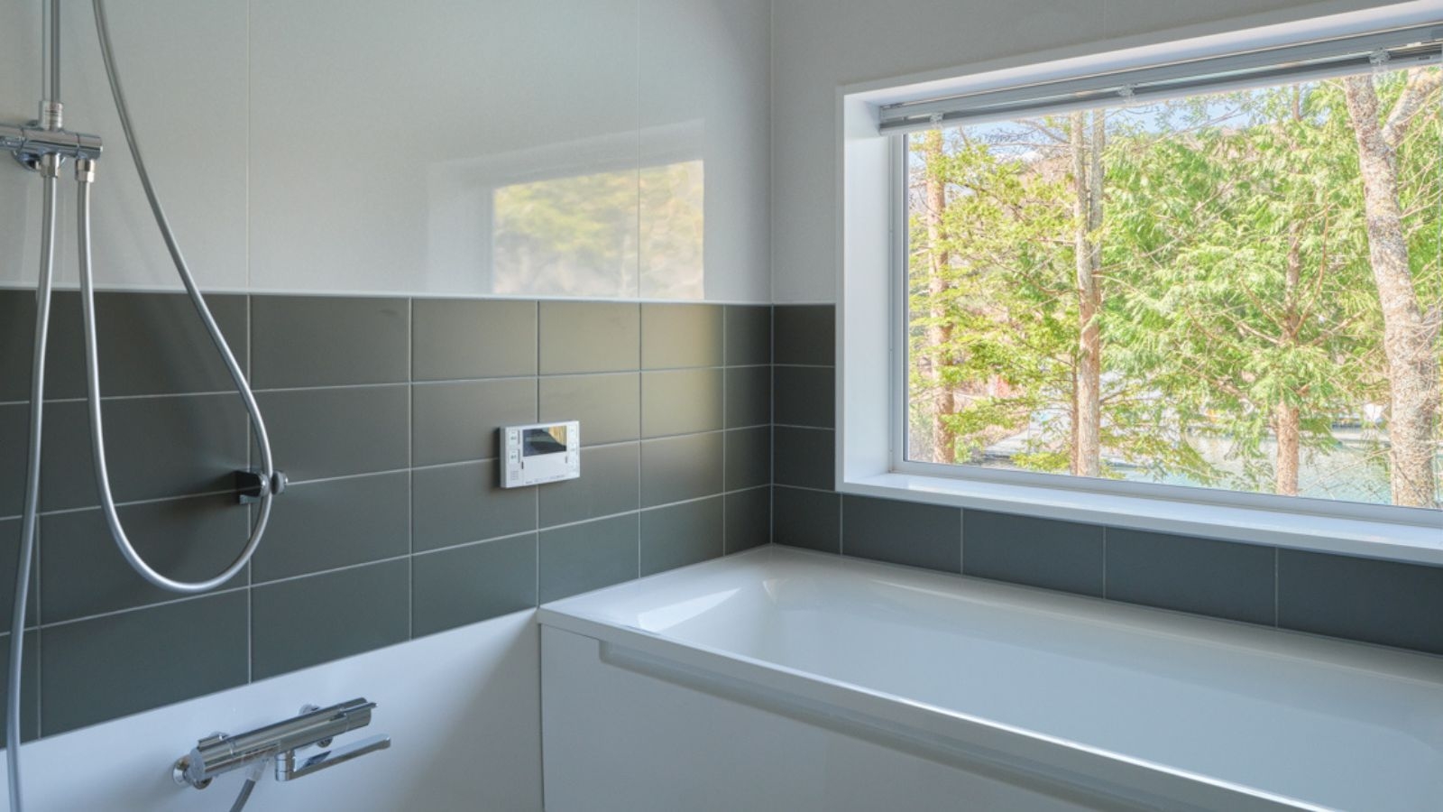 大きな窓辺で景色を楽しむ、2階のツインルーム。 窓からは光が差し込み、湖や森、山々の景色が広がります。 バスルームからも湖が望める開放的な設計となっています。