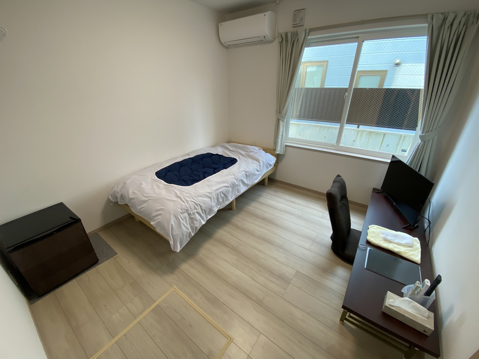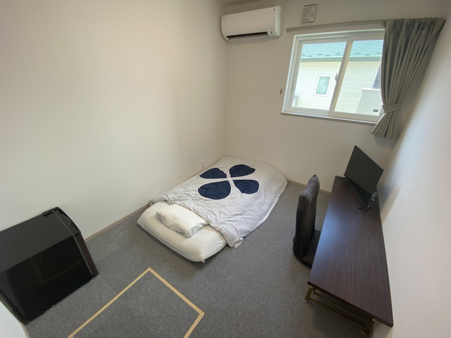 2025年10月新築オープン! 新館のお1人様専用お布団タイプのお部屋です。(二名様まで宿泊可能です)冷蔵庫、ネット対応テレビ、無料Wi-Fi、エアコン完備。