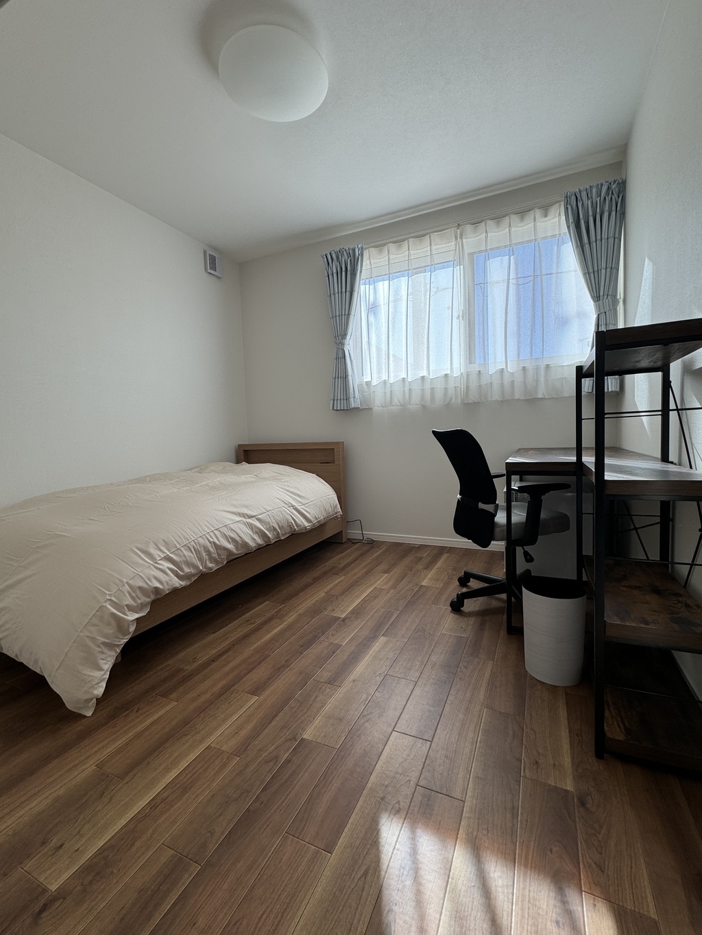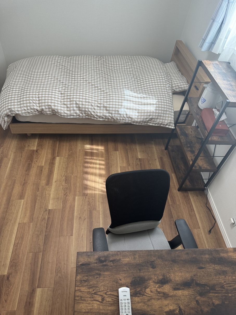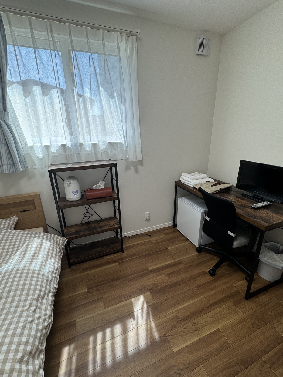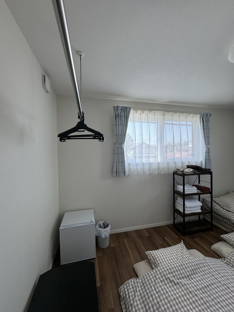幅1mのシングルベッドが1つのお部屋です。ベッドのとなりにお布団をひいて、ツイン使用もできます。