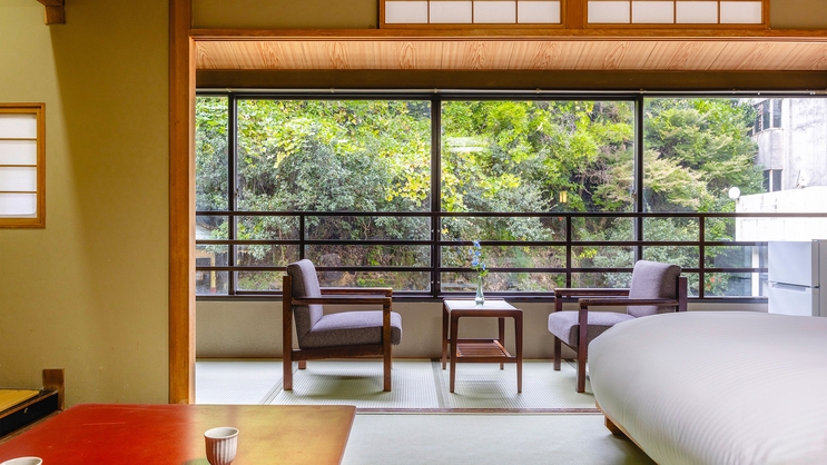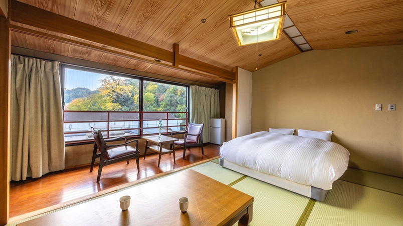畳の趣とローベッドの和洋室/フランス社製クイーンベッド(160cm幅)×1 /27平米/ユニットバス/ローテーブル・チェア・座卓・座布団