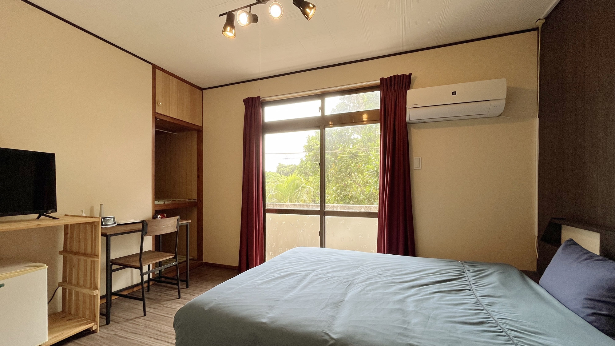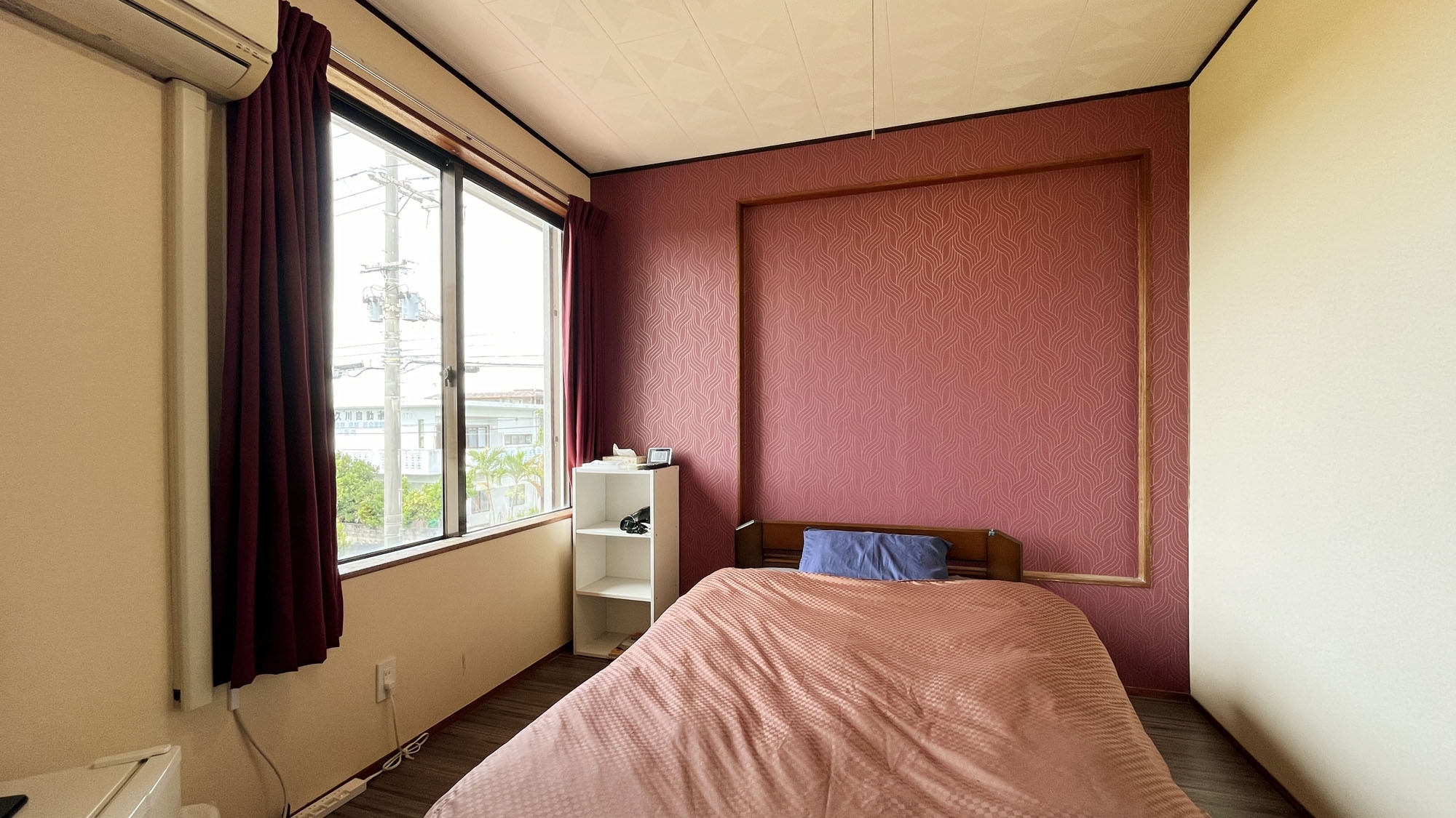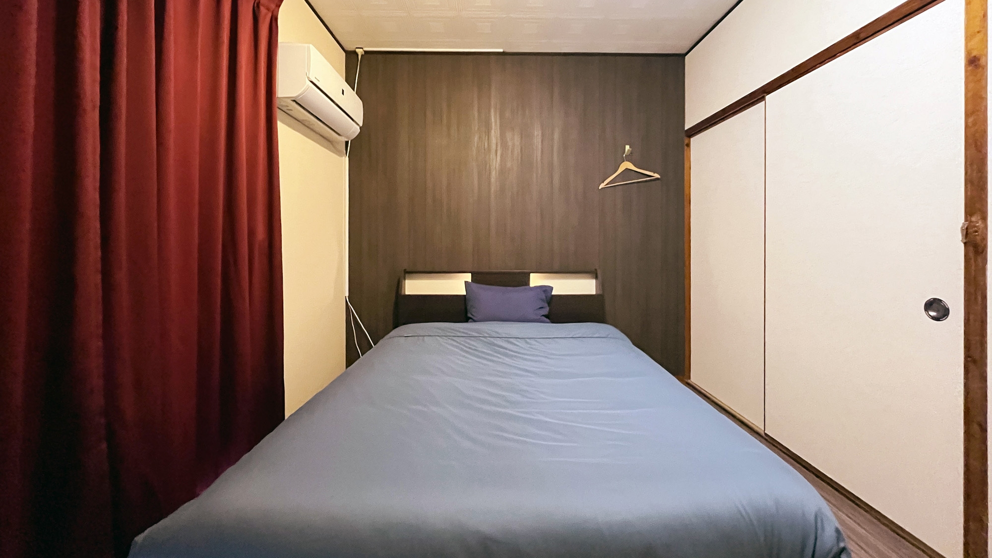 約5.5畳程度のお部屋にダブルベッド1台のお部屋です。 朝日が入るお部屋ですので、寝覚めはスッキリ起きることができますよ。