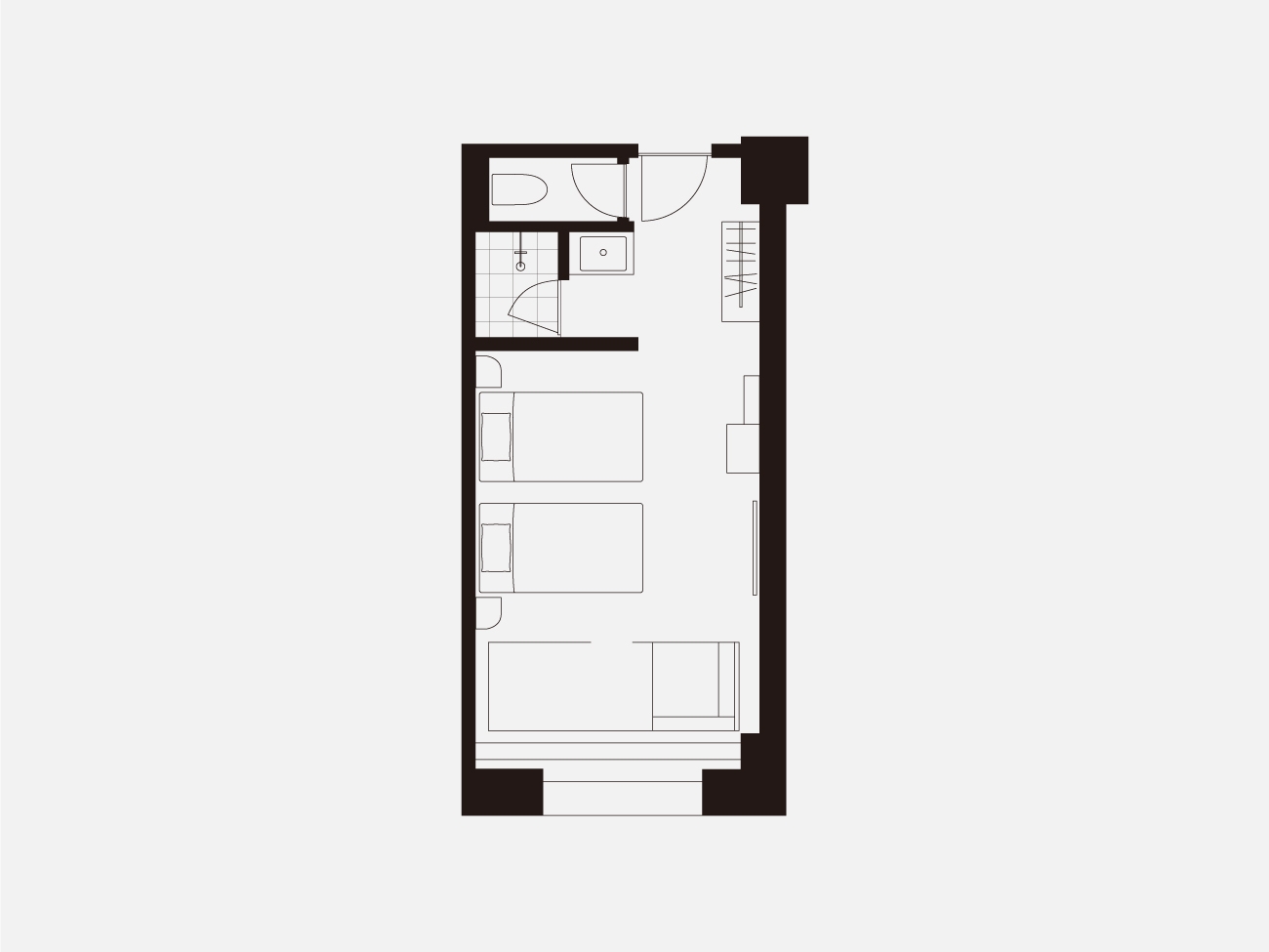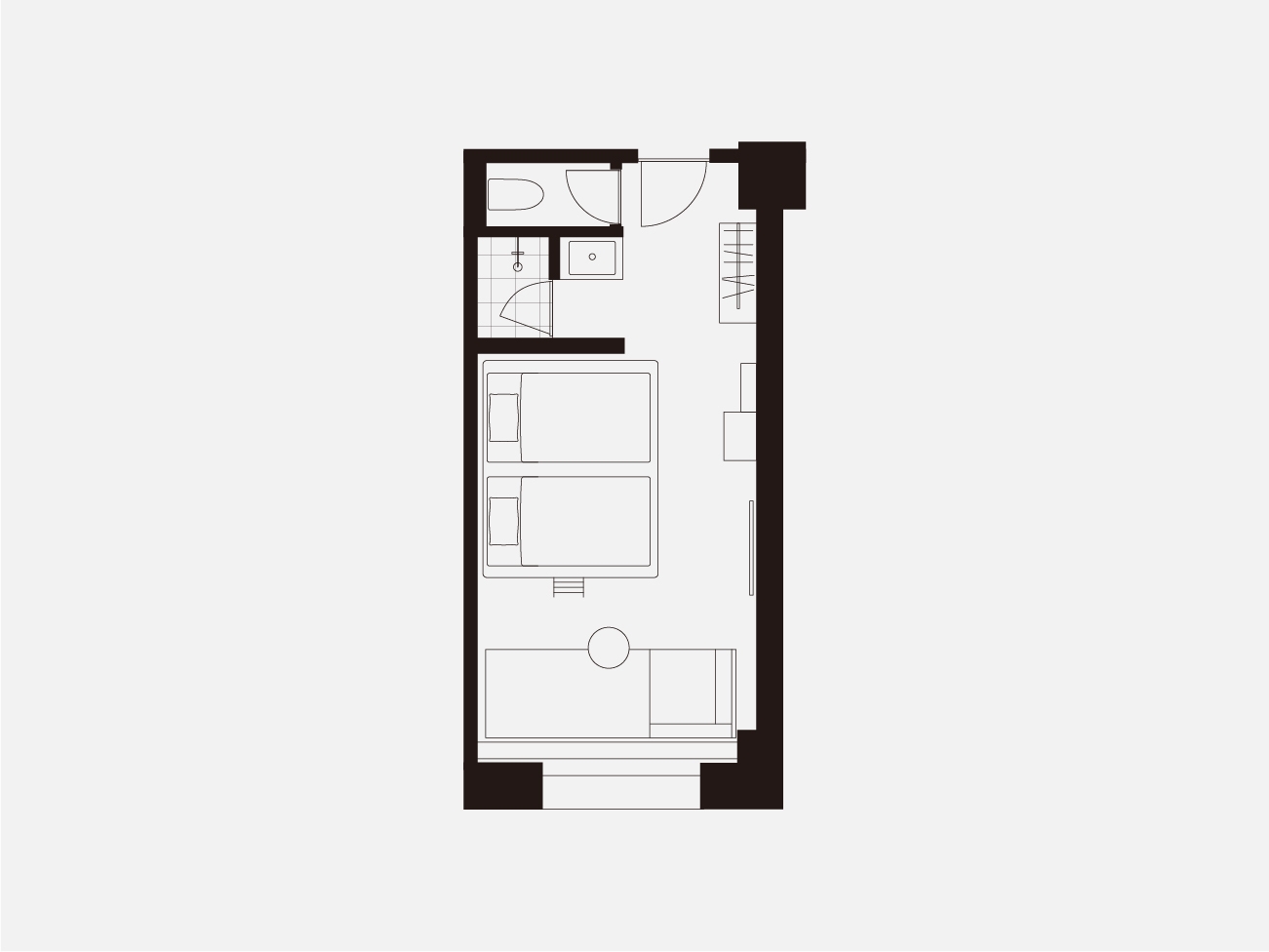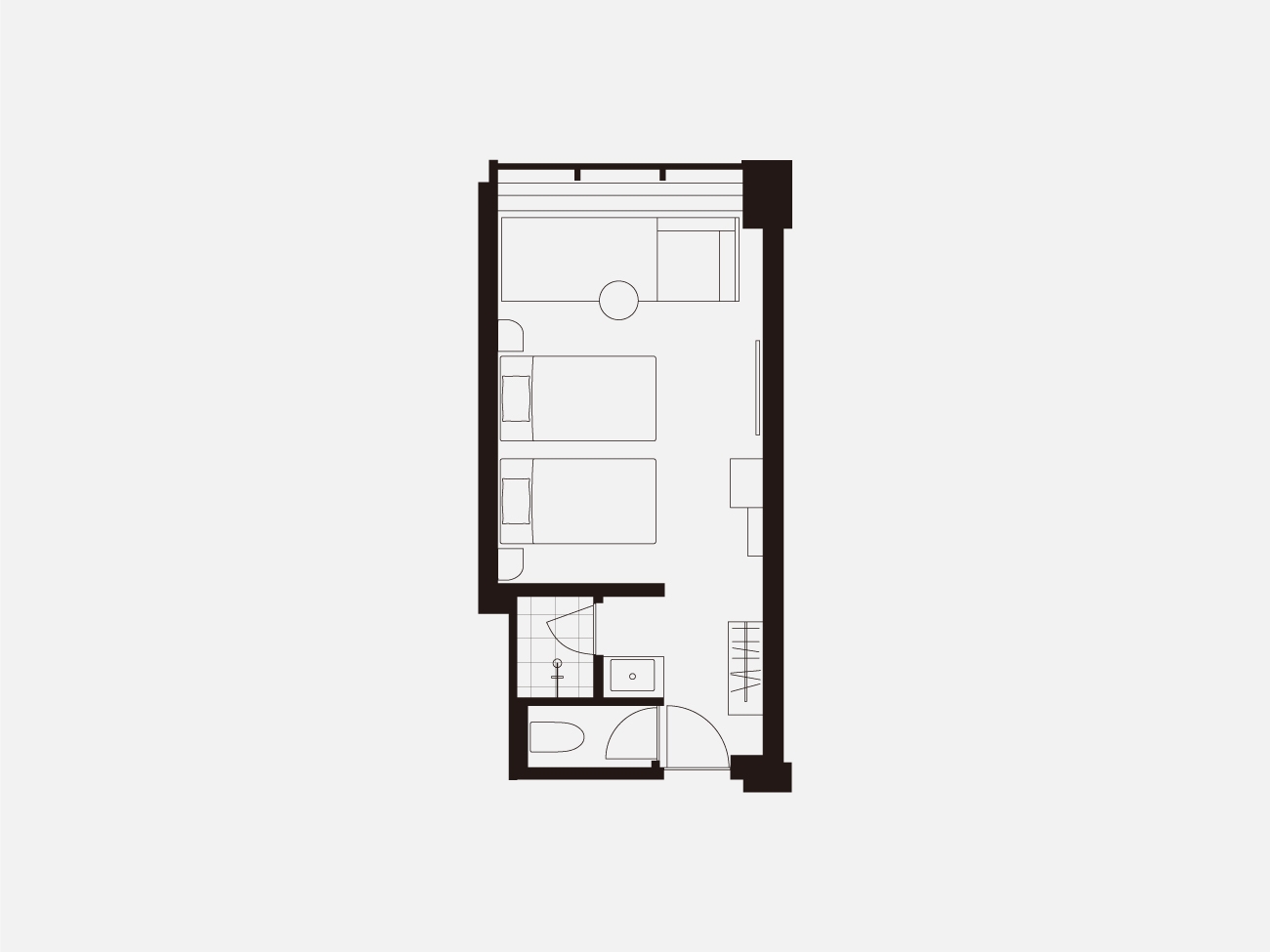 高層階に位置するツインルーム。 ゆったりと眠りにつけるダブルベッド2台を用意したお部屋です。 長期滞在や出張時にも嬉しい洗濯乾燥機完備。