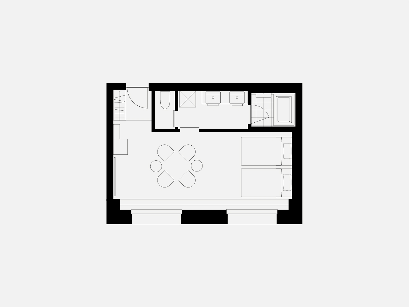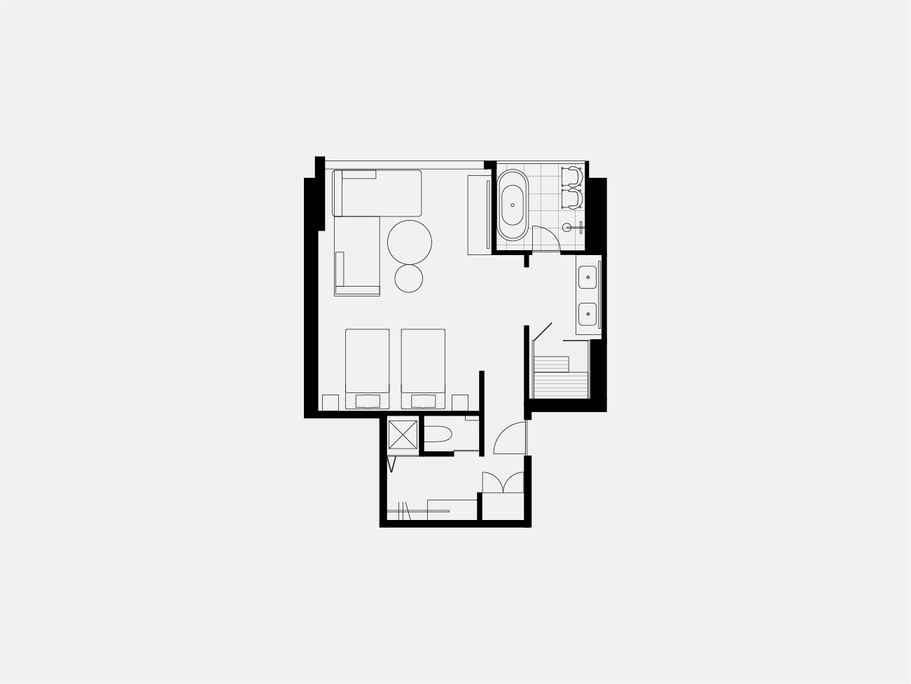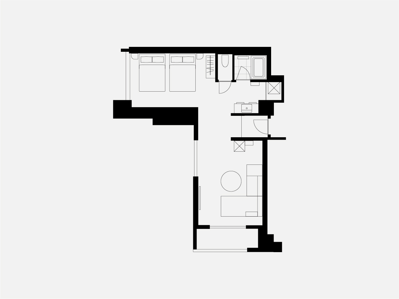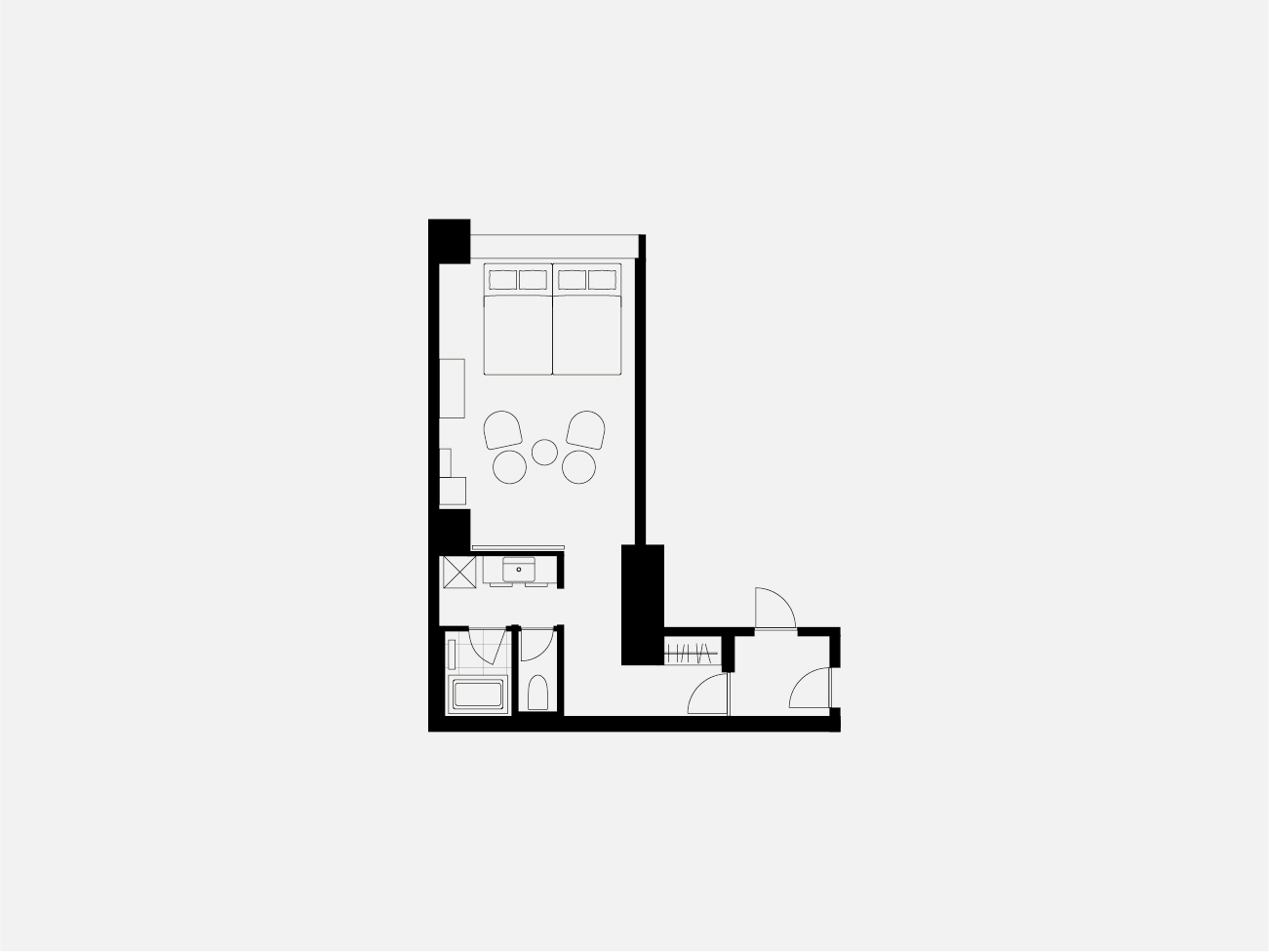 高層階に位置するツインルーム。 ゆったりと眠りにつけるダブルベッド2台を用意したお部屋です。 長期滞在や出張時にも嬉しい洗濯乾燥機完備。