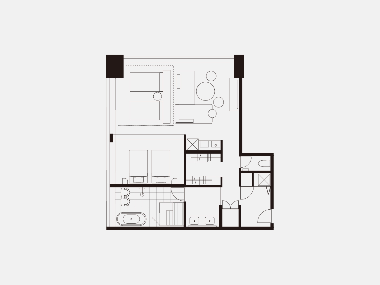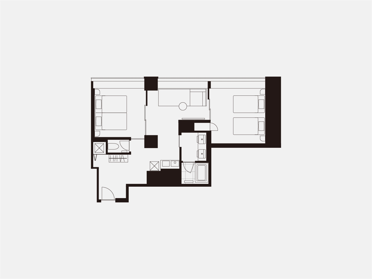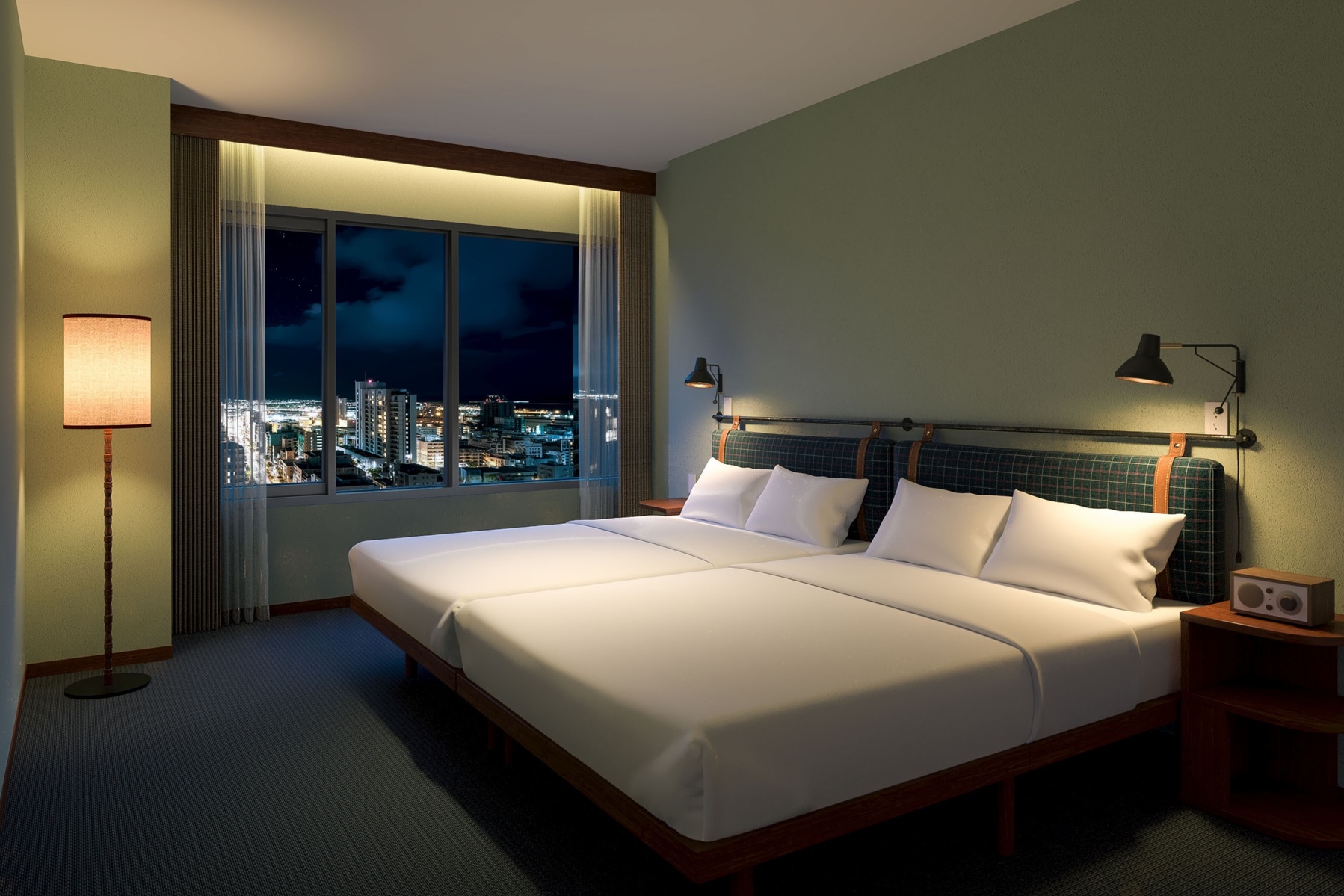 高層階に位置するプレミアムコーナールーム。 2ベッドルームに4台のベッドを用意したお部屋です。 長期滞在や出張時にも嬉しい洗濯乾燥機完備。