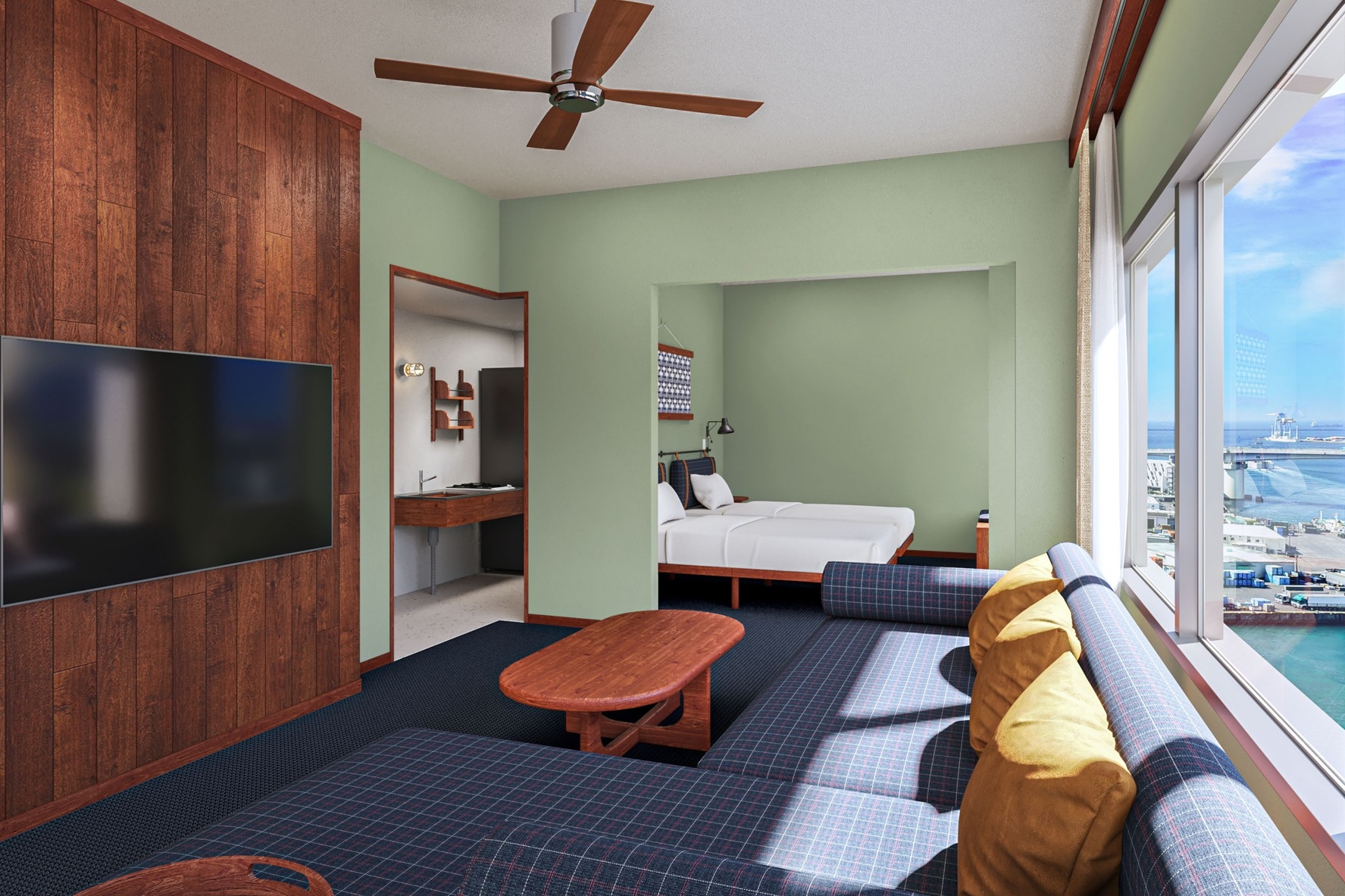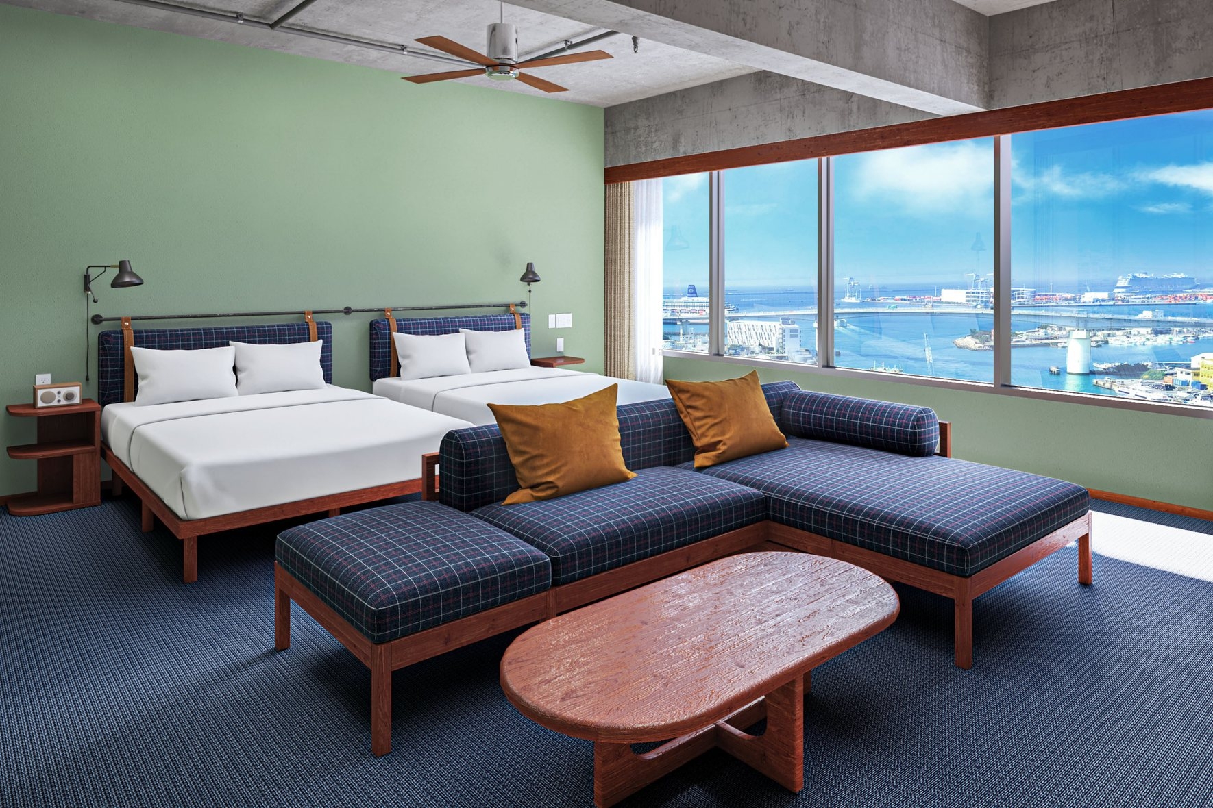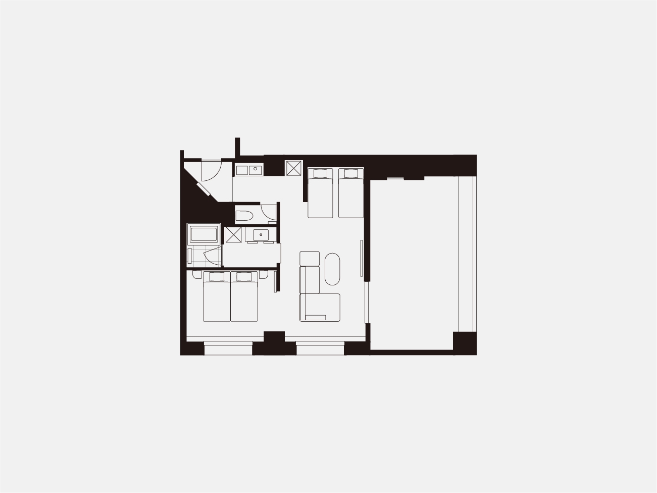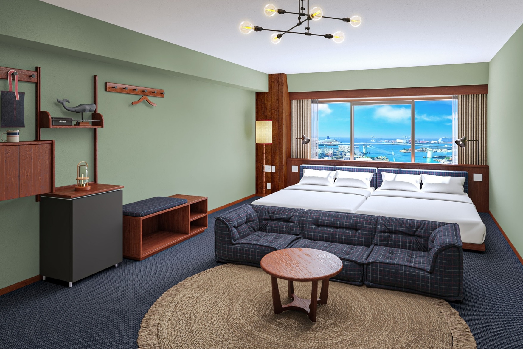 高層階に位置するプレミアムコーナールーム。 2ベッドルームに4台のベッドを用意したお部屋です。 長期滞在や出張時にも嬉しい洗濯乾燥機完備。