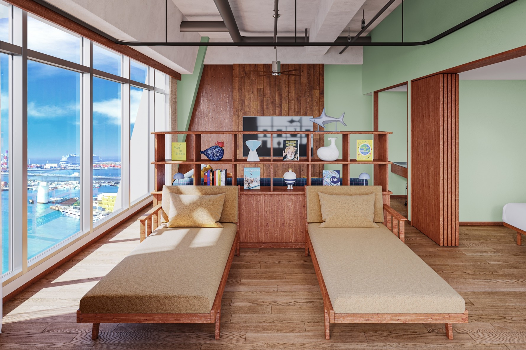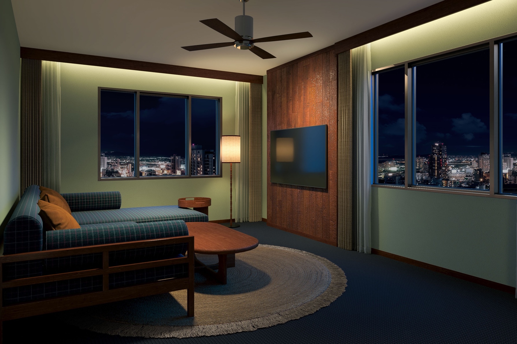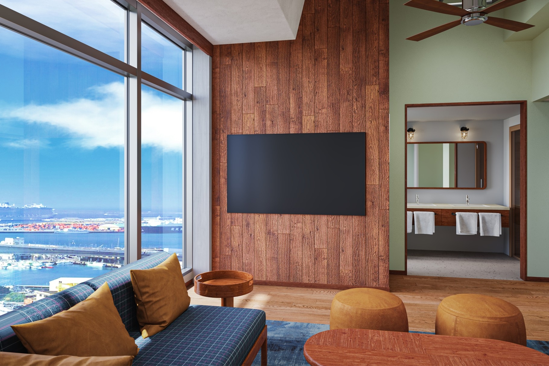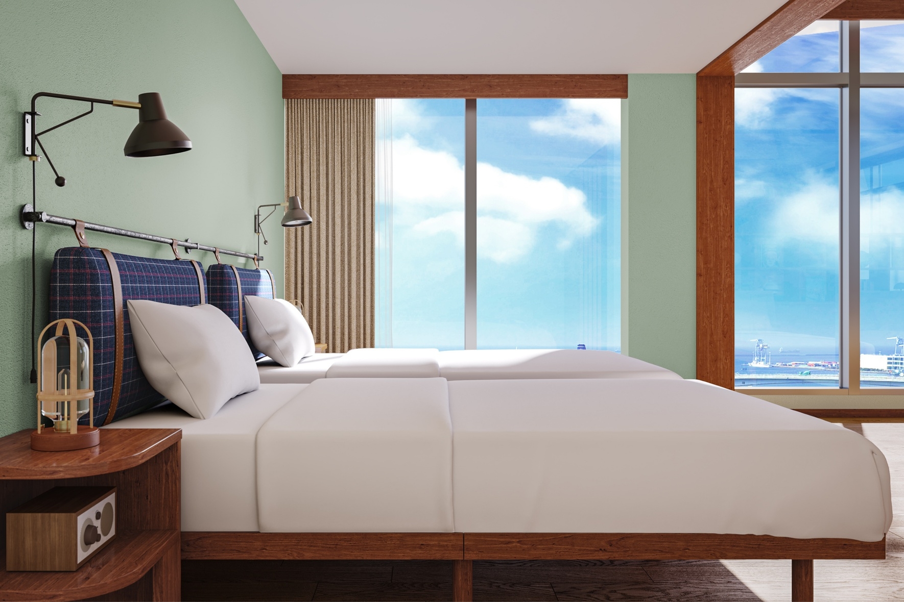 高層階に位置し開放的なテラスを兼ね備えて、パノラマビューがお楽しいただけるコーナールーム。 2ベッドルームに4台のベッドを用意したお部屋です。