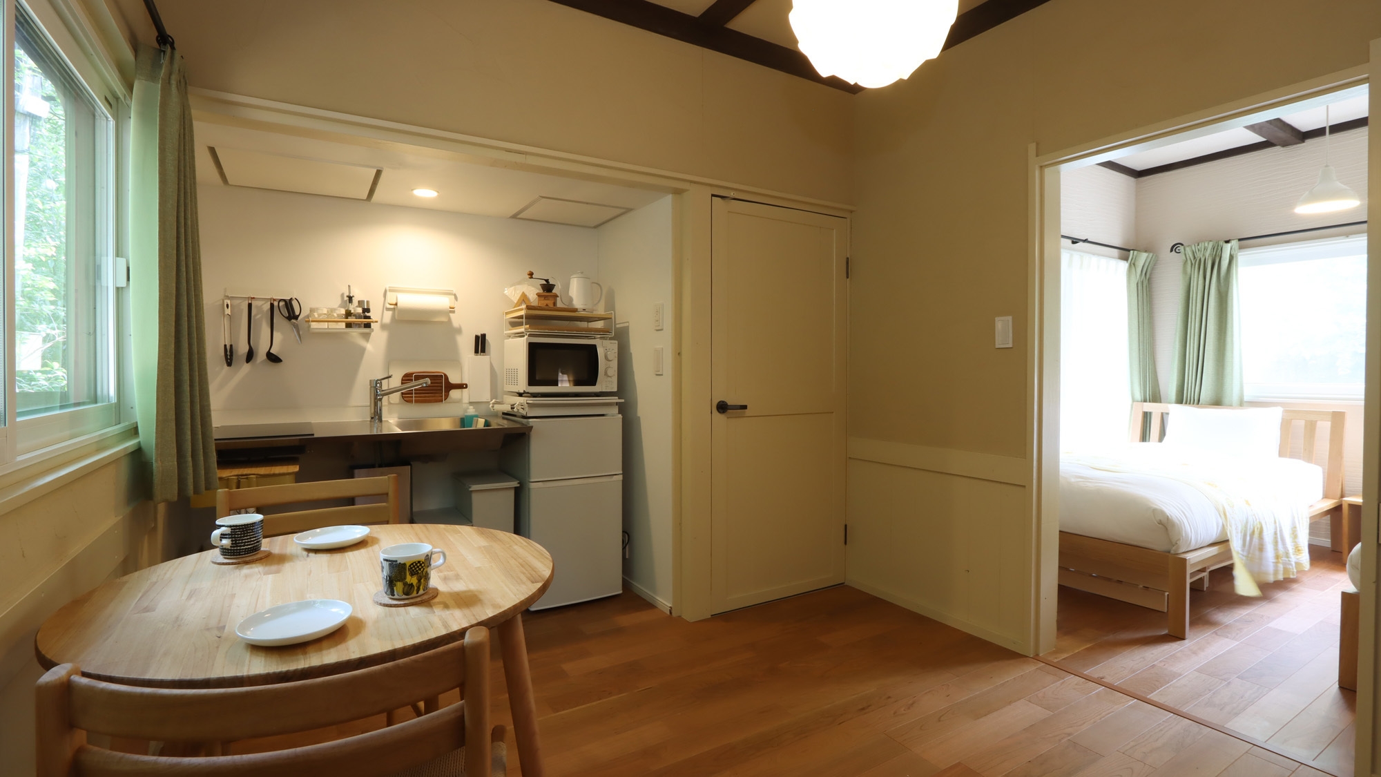 ダブルベッド、電子レンジ・冷蔵庫・ケトル・カトラリー・食器類・ミル・ドリッパー等