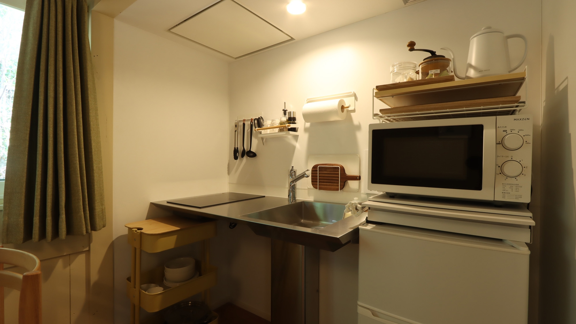 ツイン+エキストラ、ミニキッチン(IH)・電子レンジ・冷蔵庫・ケトル・カトラリー・食器類・ミル・ドリッパー等