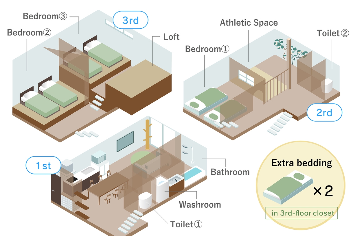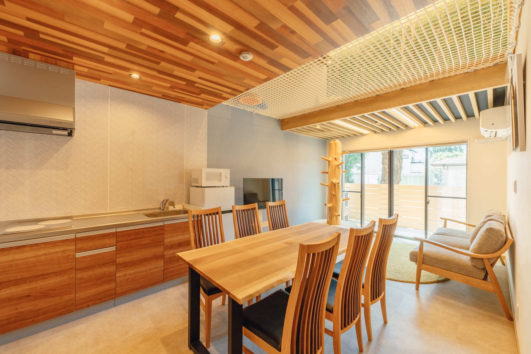8名様まで宿泊できるグループ向けのお部屋です。3階に分かれた室内には「tree house」をモチーフとした、お子様から大人までワクワクする楽しい仕掛けがいっぱい!寝室も3つ備えており、大人数でも快適にご滞在いただけます。