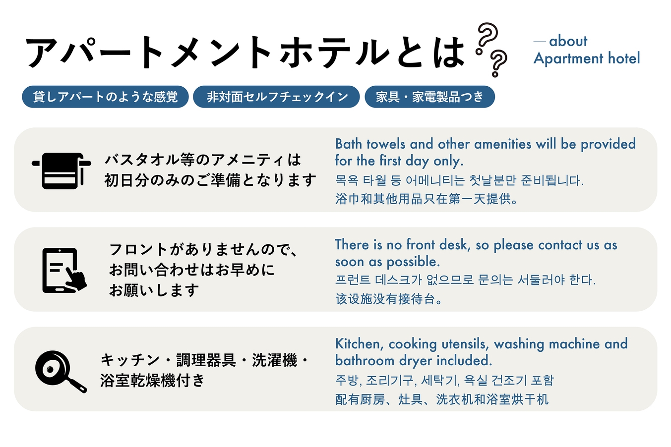 ☆アパートメントホテルとは...キッチンや洗濯機が部屋ごとに付いた、暮らしながら滞在できる宿泊施設です。