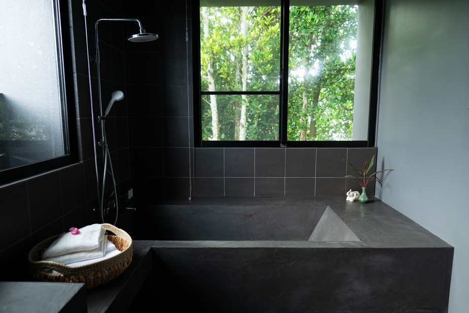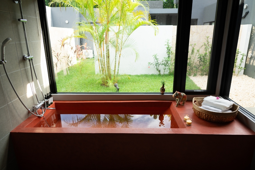 中庭を一望できる大きな窓が特徴の、開放的なバスルームです。