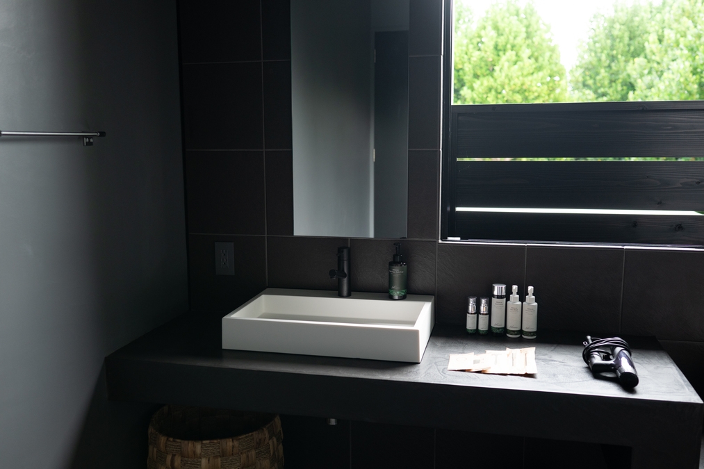 歴史あるフクギ並木を眺めることができる見晴らしの良いバスルームです。