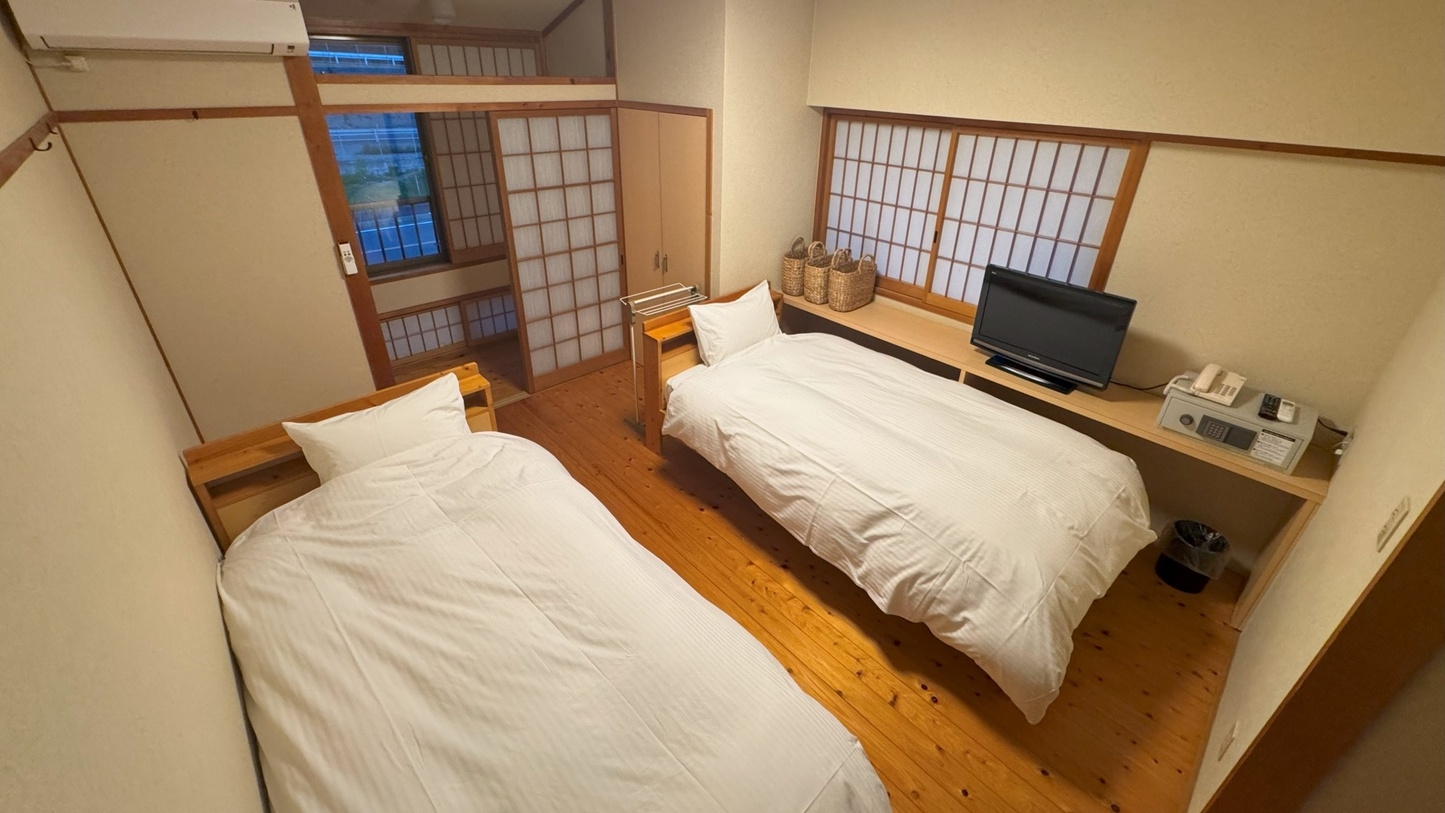 シングルベッド二台を設置した洋室ツインルーム。カップルやご夫婦でのご利用に最適な、バス無し・トイレ付きのお部屋でございます。