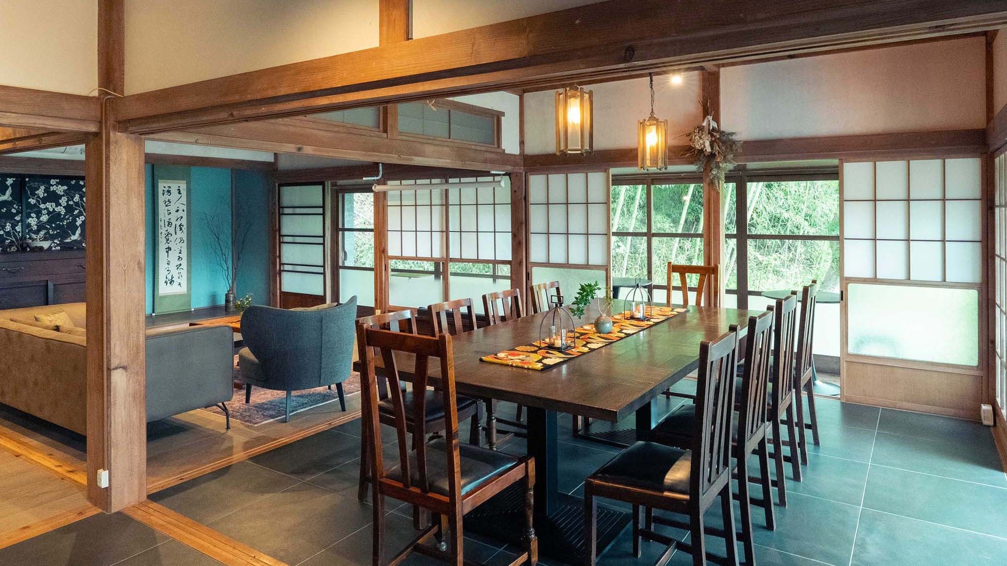 1日1組限定。骨董和家具とイギリスアンティーク家具が織りなす、和と洋が融合した洗練された空間が特徴の一棟貸し。懐かしさと快適さを同時に感じられる唯一無二の体験。