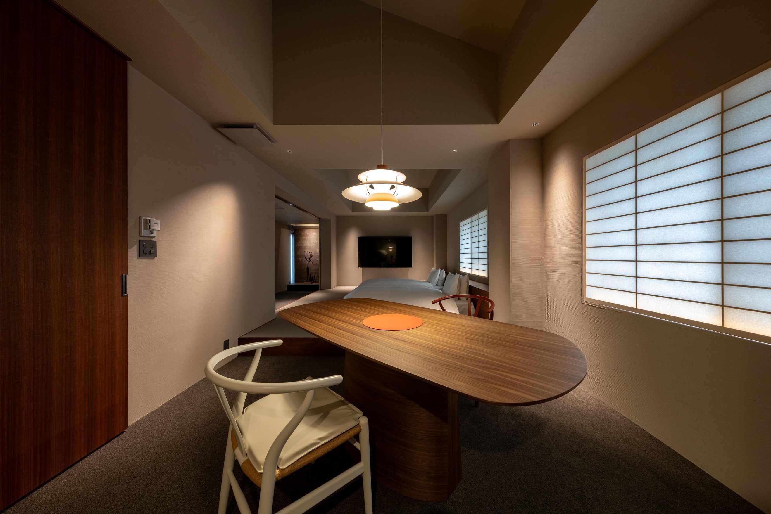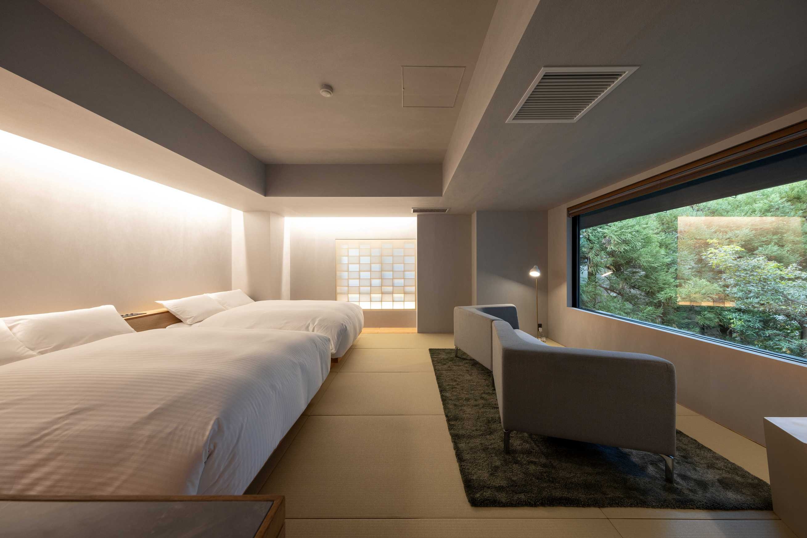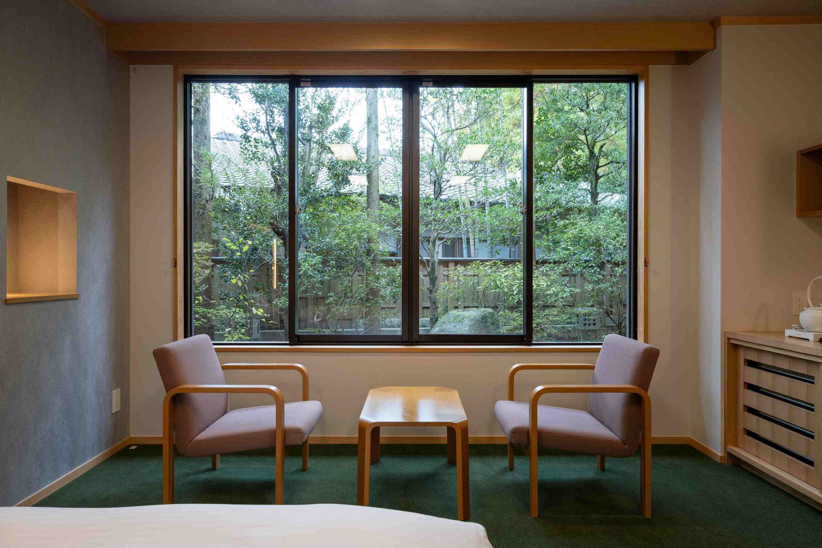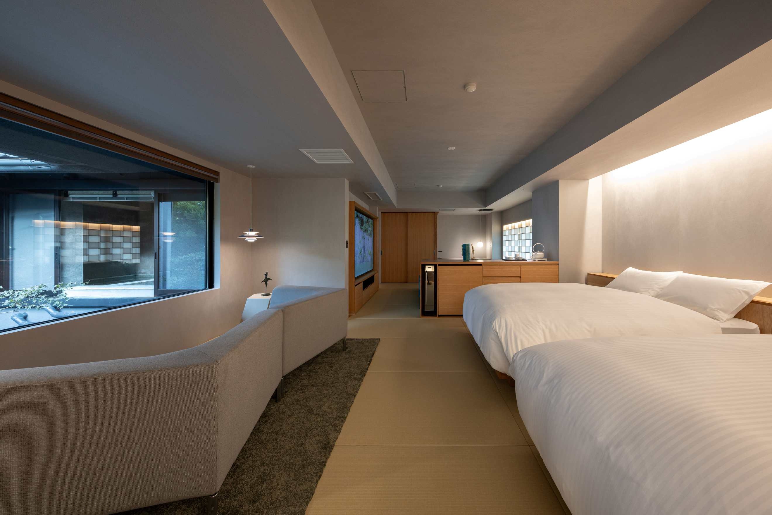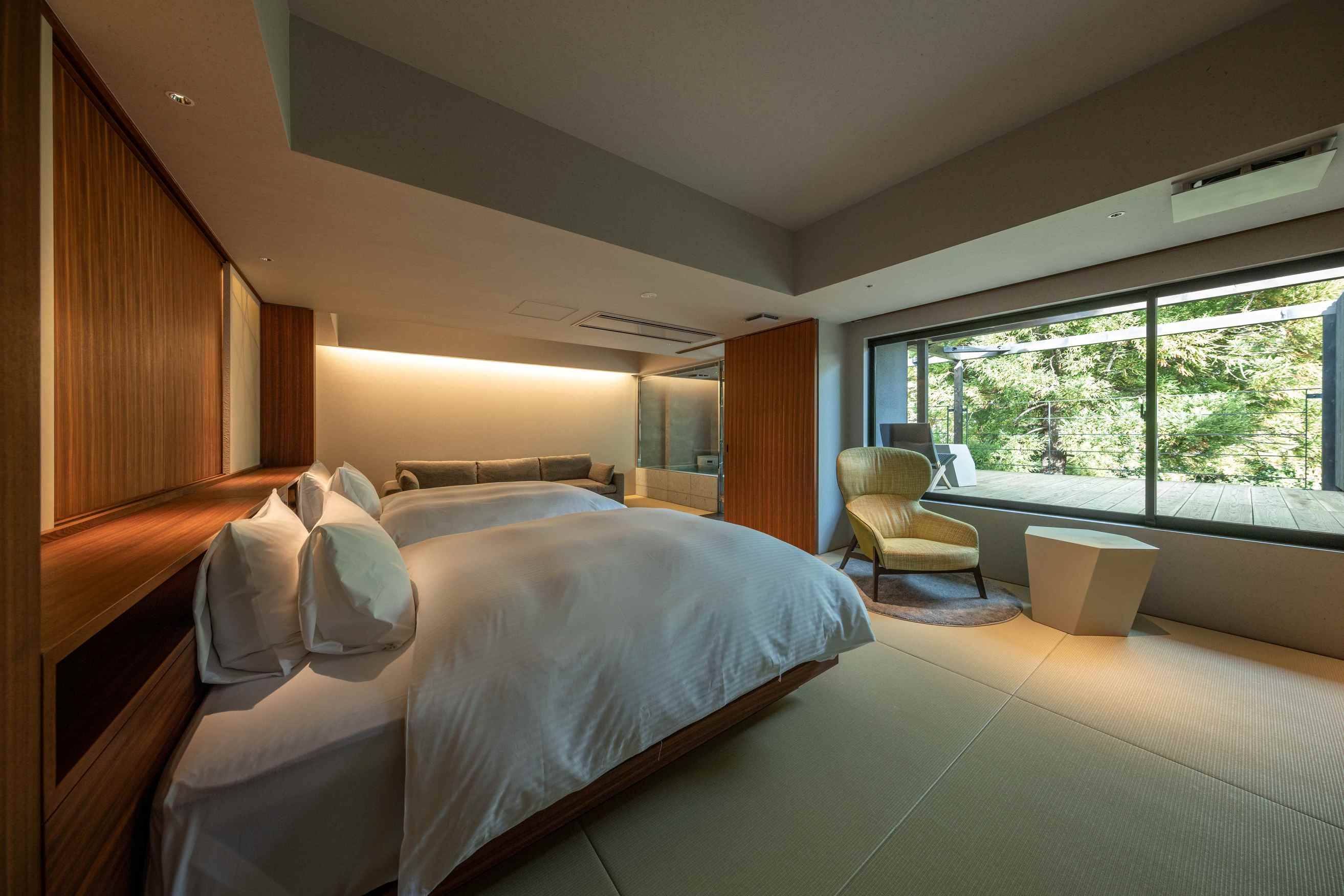 室内70平米デッキなし。角部屋に位置し、ベッド正面の窓からは静かな庭を望む客室。名のとおり「枯淡」の趣を感じる、端正で穏やかな空間で心静かにお過ごしください。