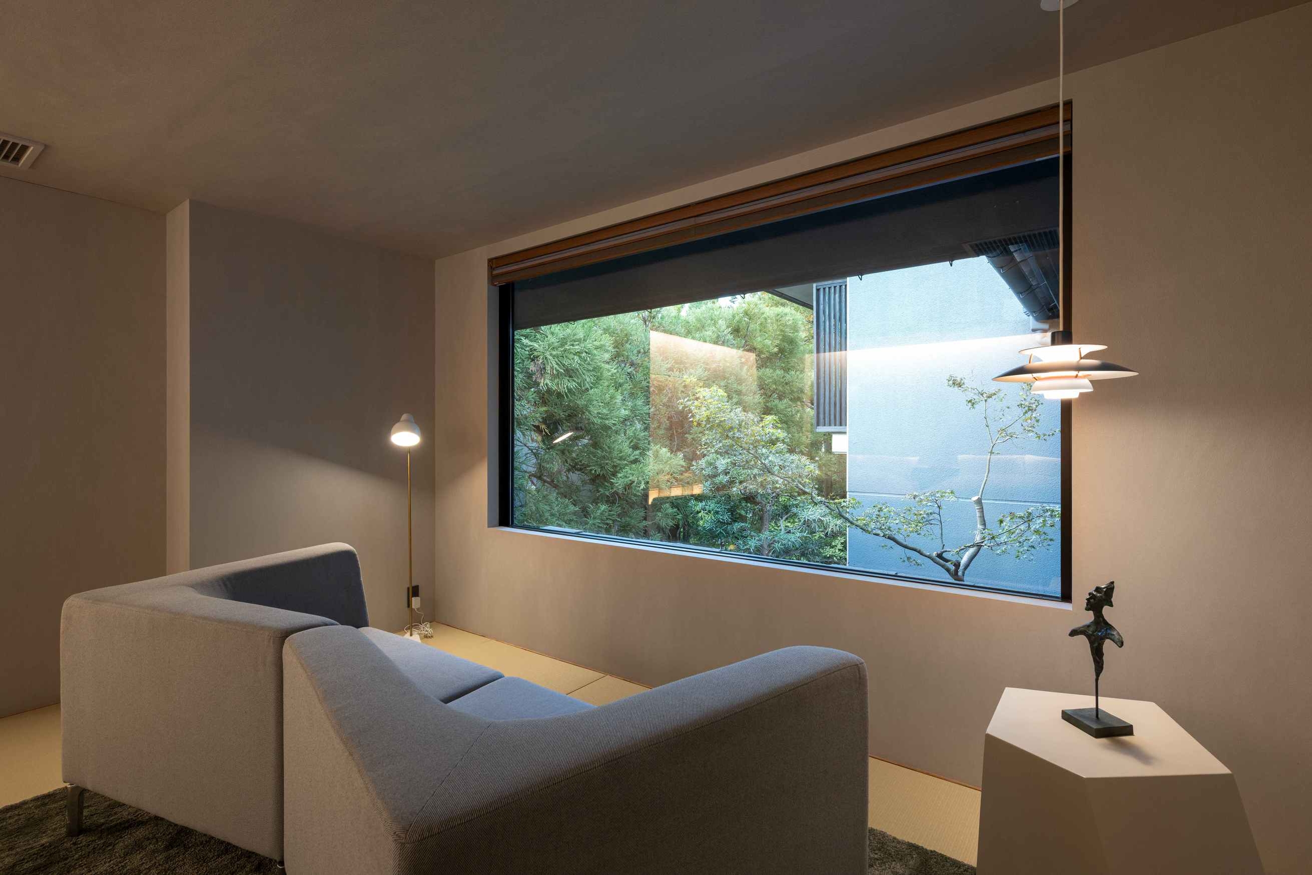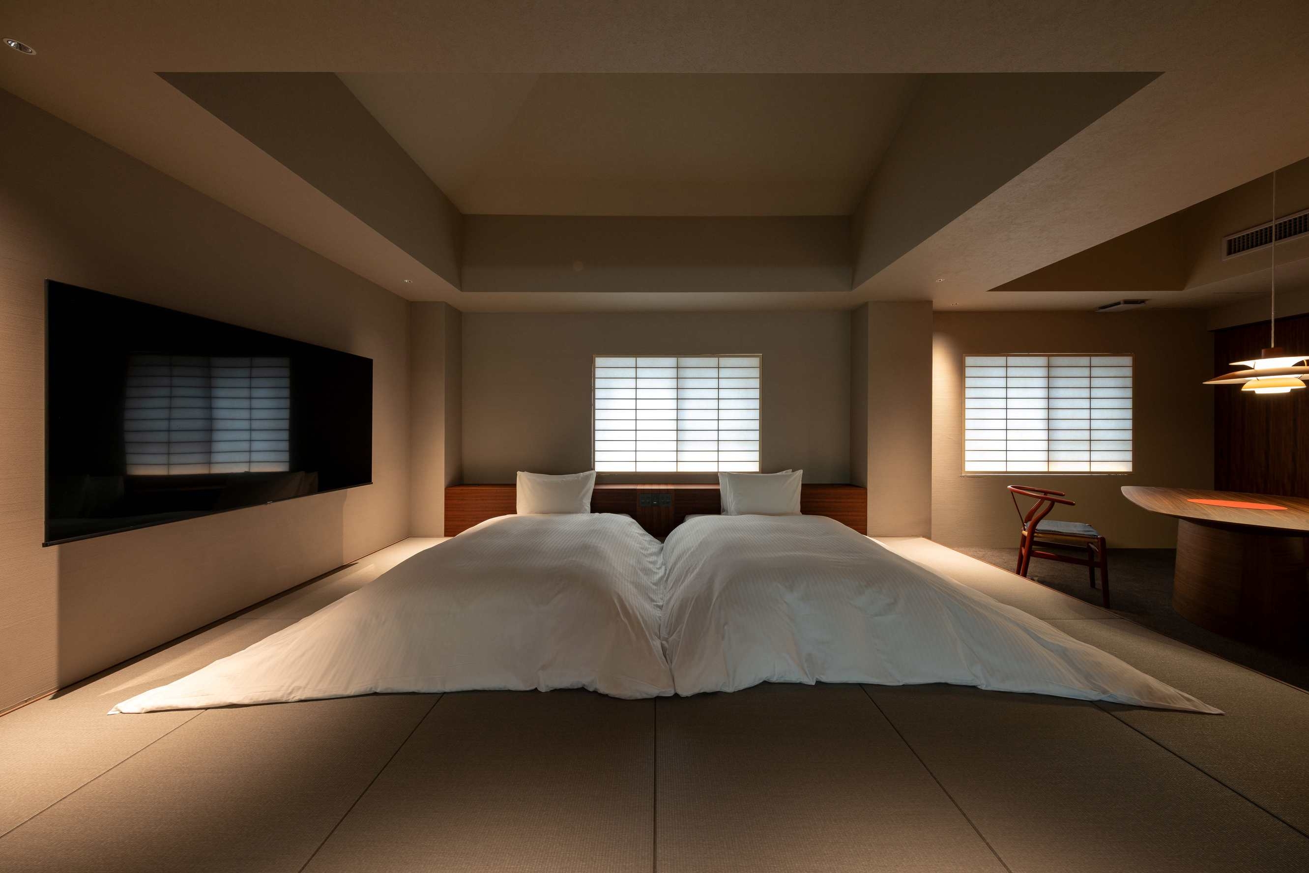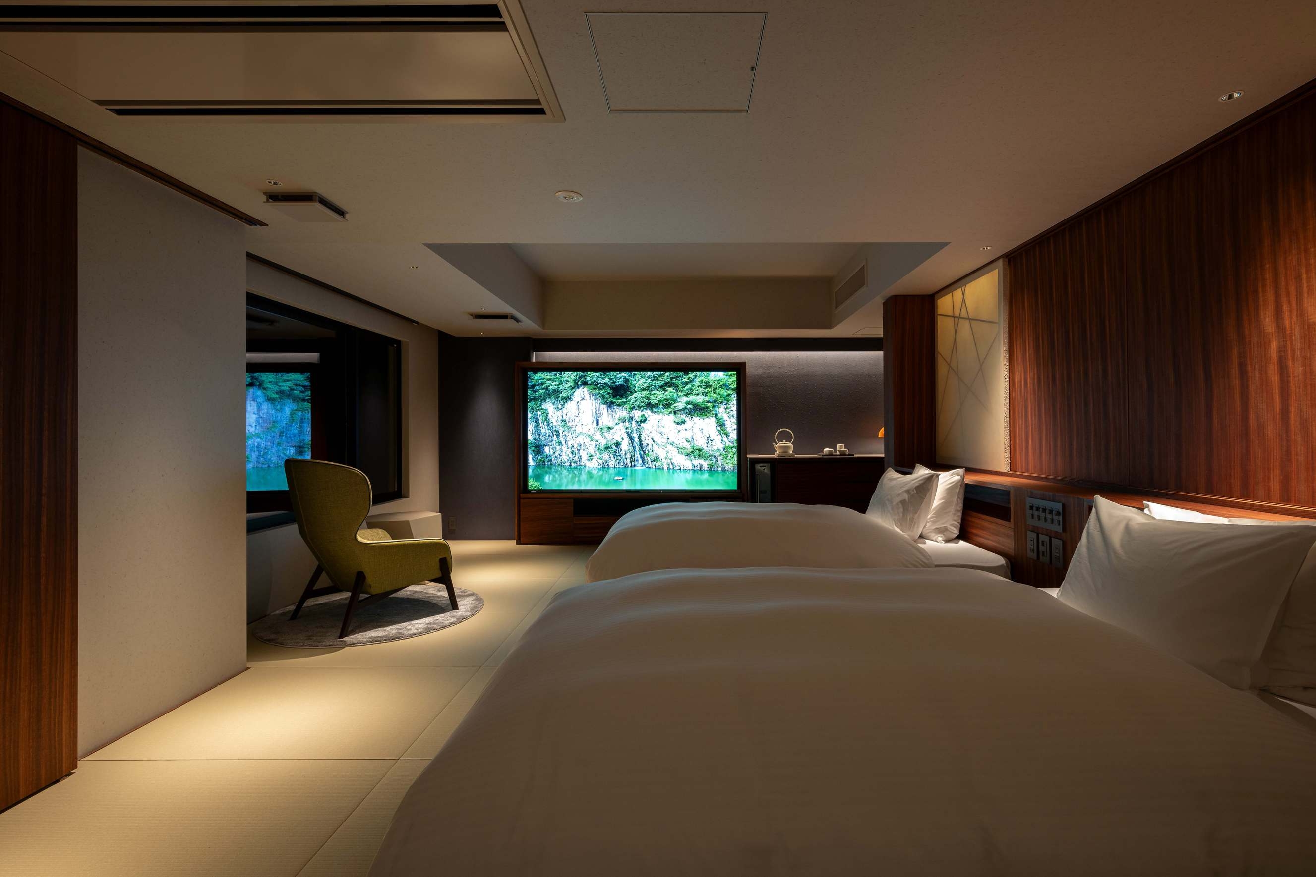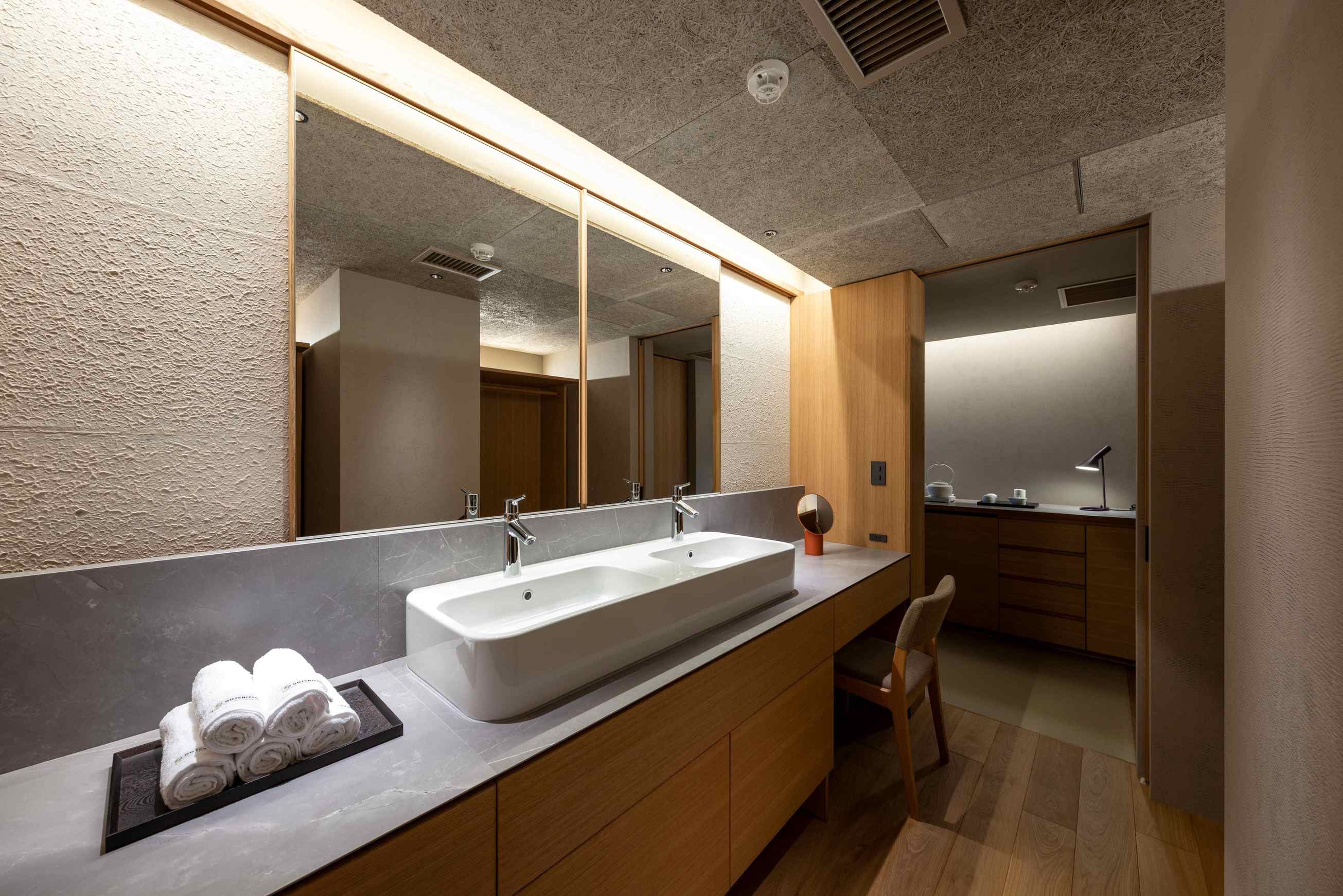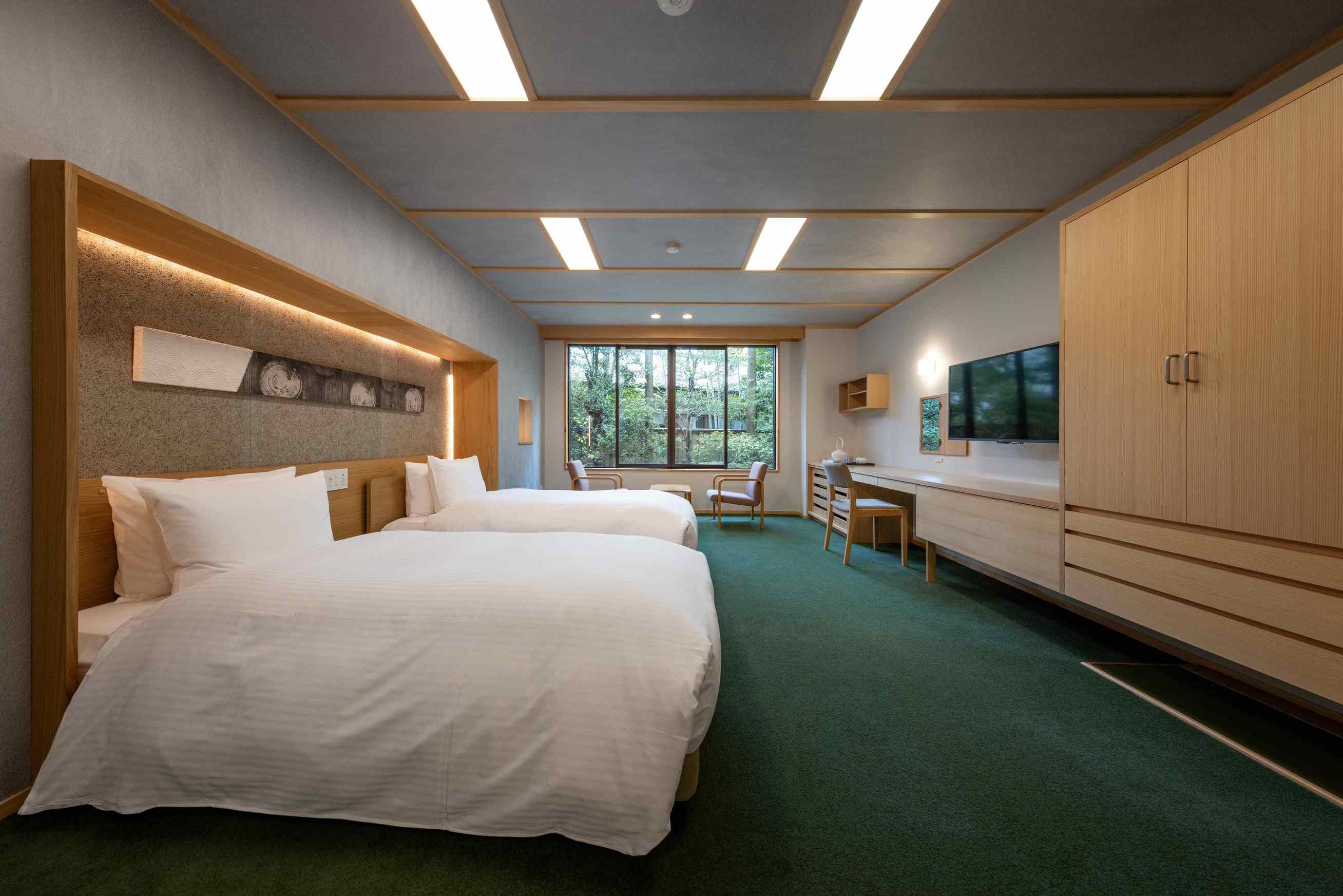 室内70平米デッキなし。角部屋に位置し、ベッド正面の窓からは静かな庭を望む客室。名のとおり「枯淡」の趣を感じる、端正で穏やかな空間で心静かにお過ごしください。