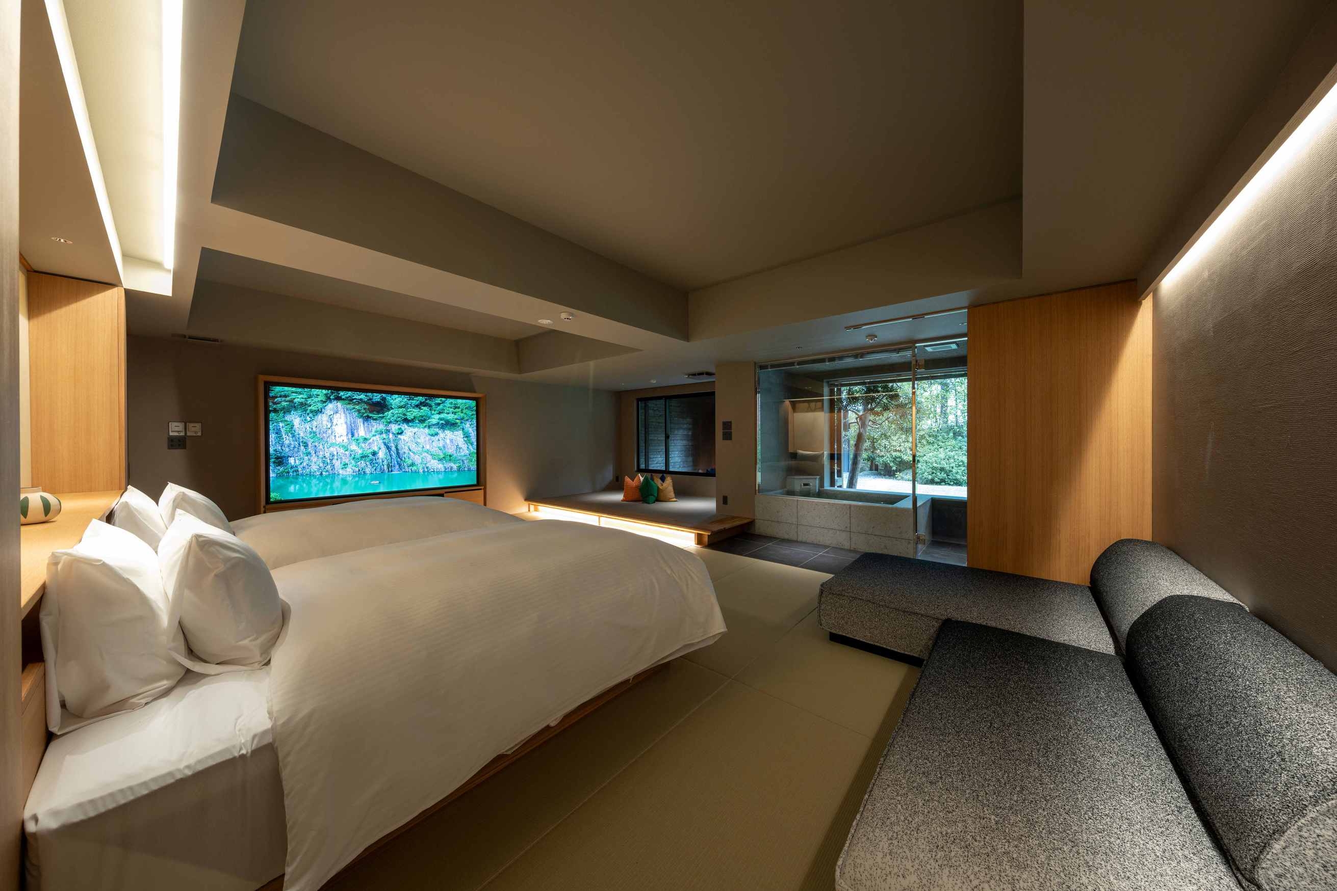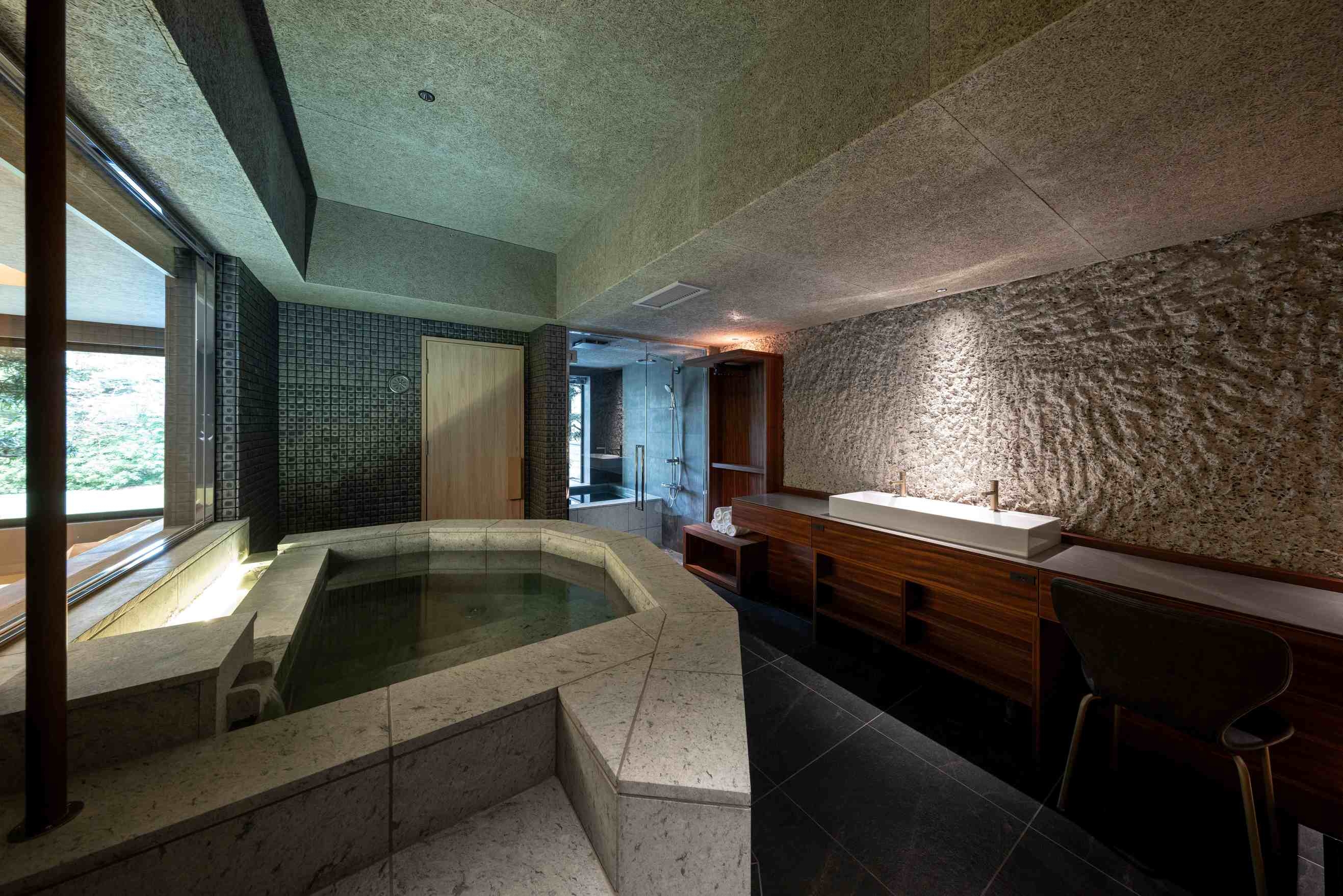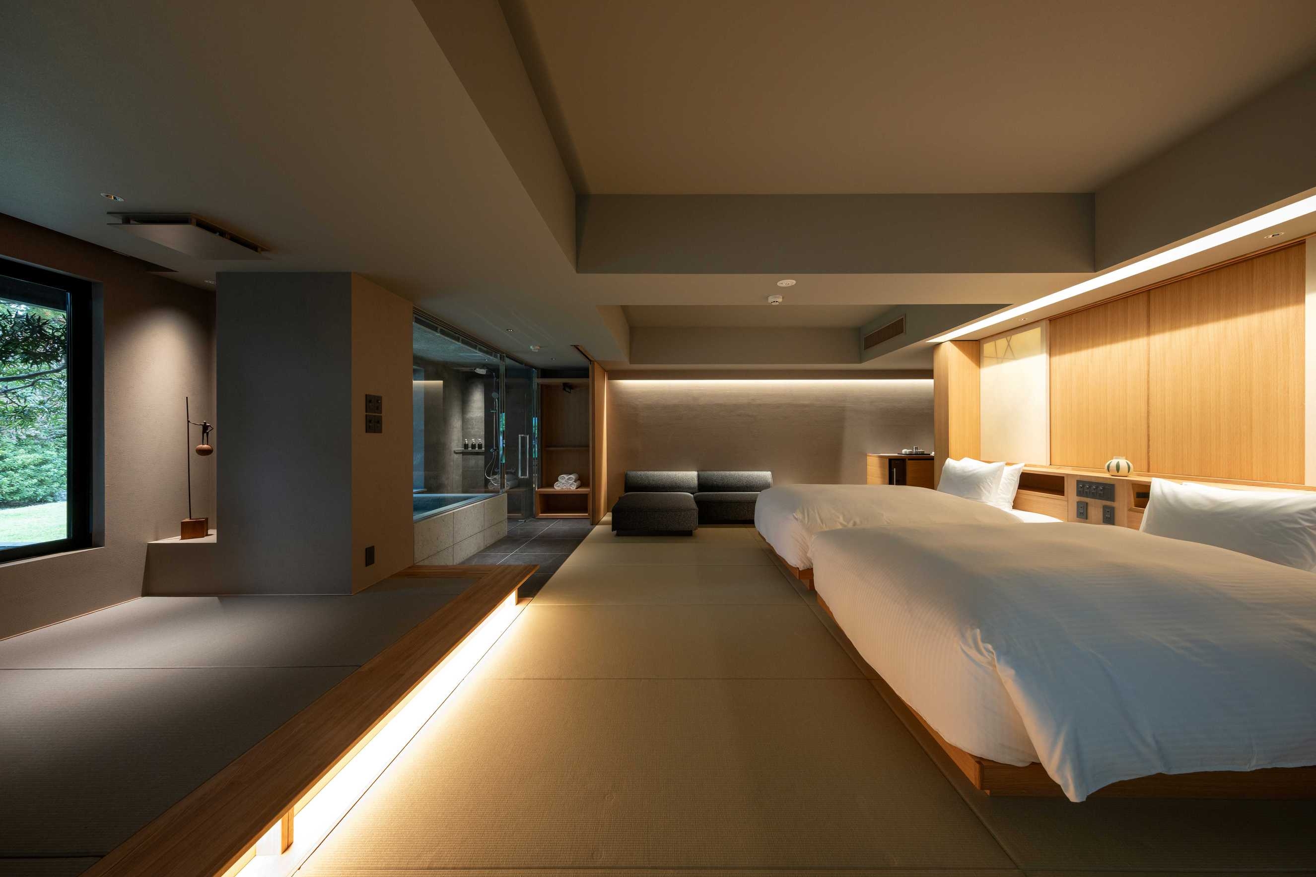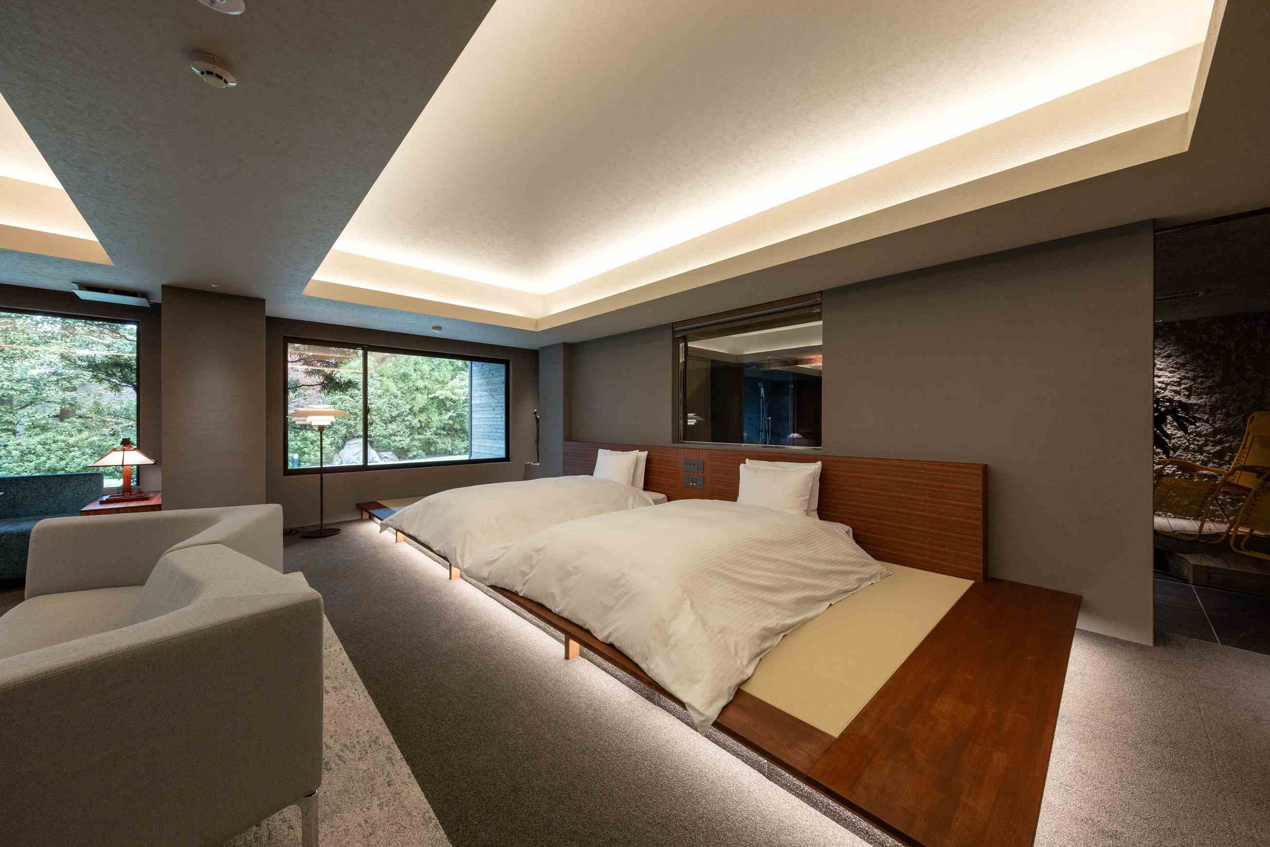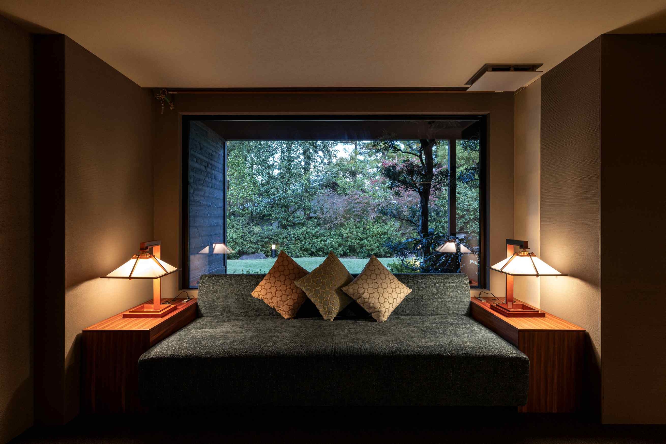 8室の客室温泉付きスイートのうち2室はプライベートサウナ付きで、心身をゆったり整える特別な滞在をお愉しみいただけます。フランク・ロイド・ライトのエッセンスを取り入れた設えが、和の趣と洗練された美しさを演出します。