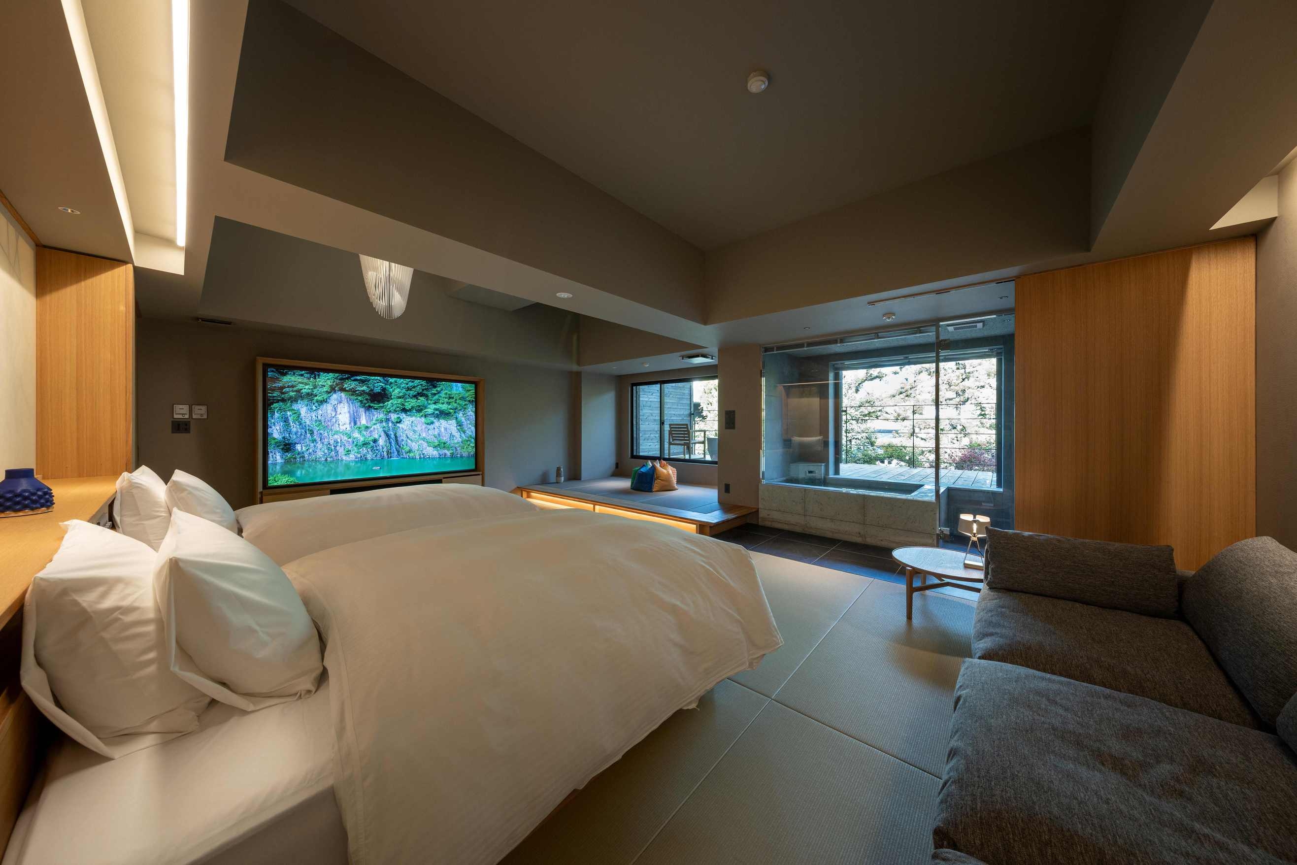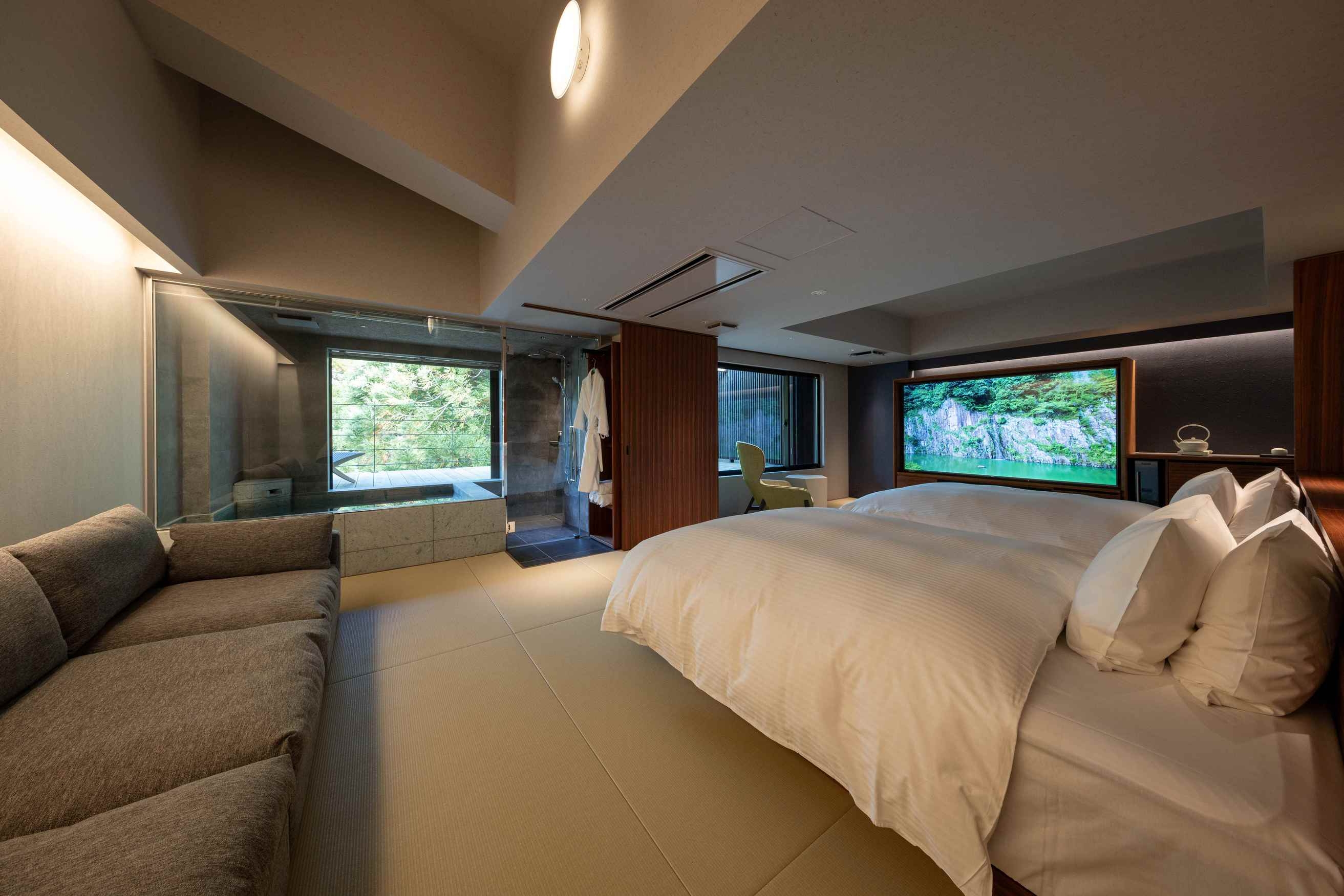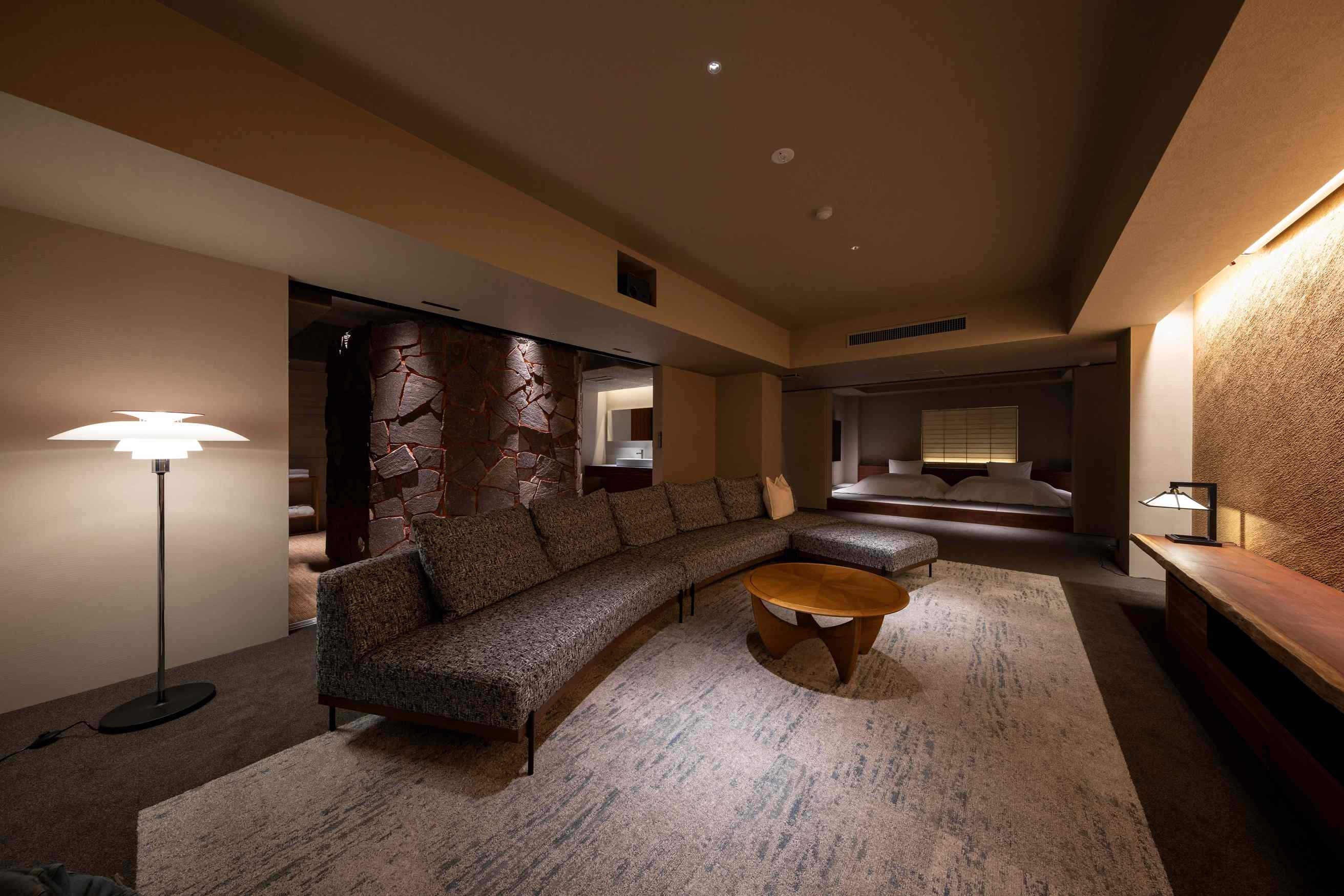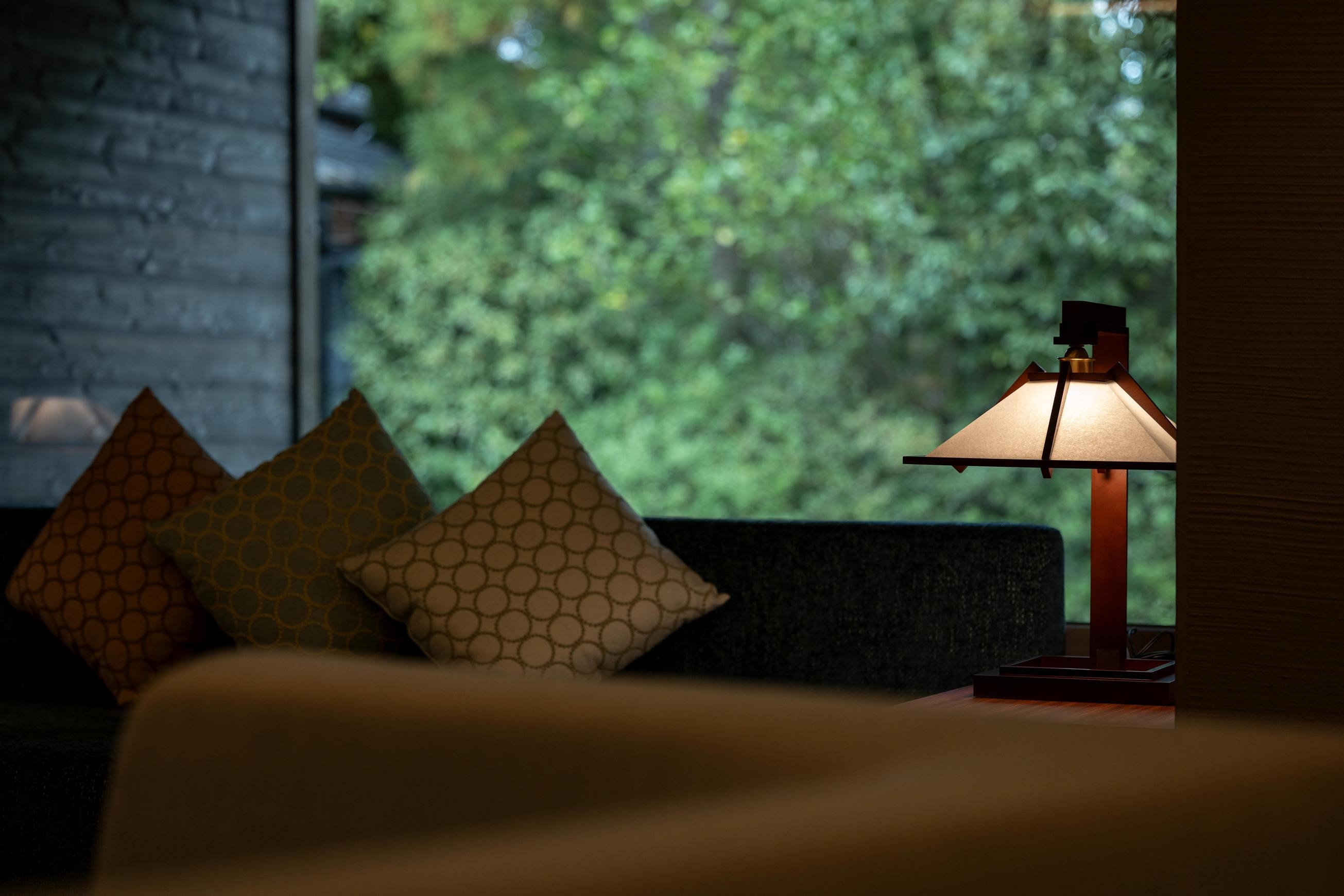 8室の客室温泉付きスイートのうち2室はプライベートサウナ付きで、心身をゆったり整える特別な滞在をお愉しみいただけます。フランク・ロイド・ライトのエッセンスを取り入れた設えが、和の趣と洗練された美しさを演出します。