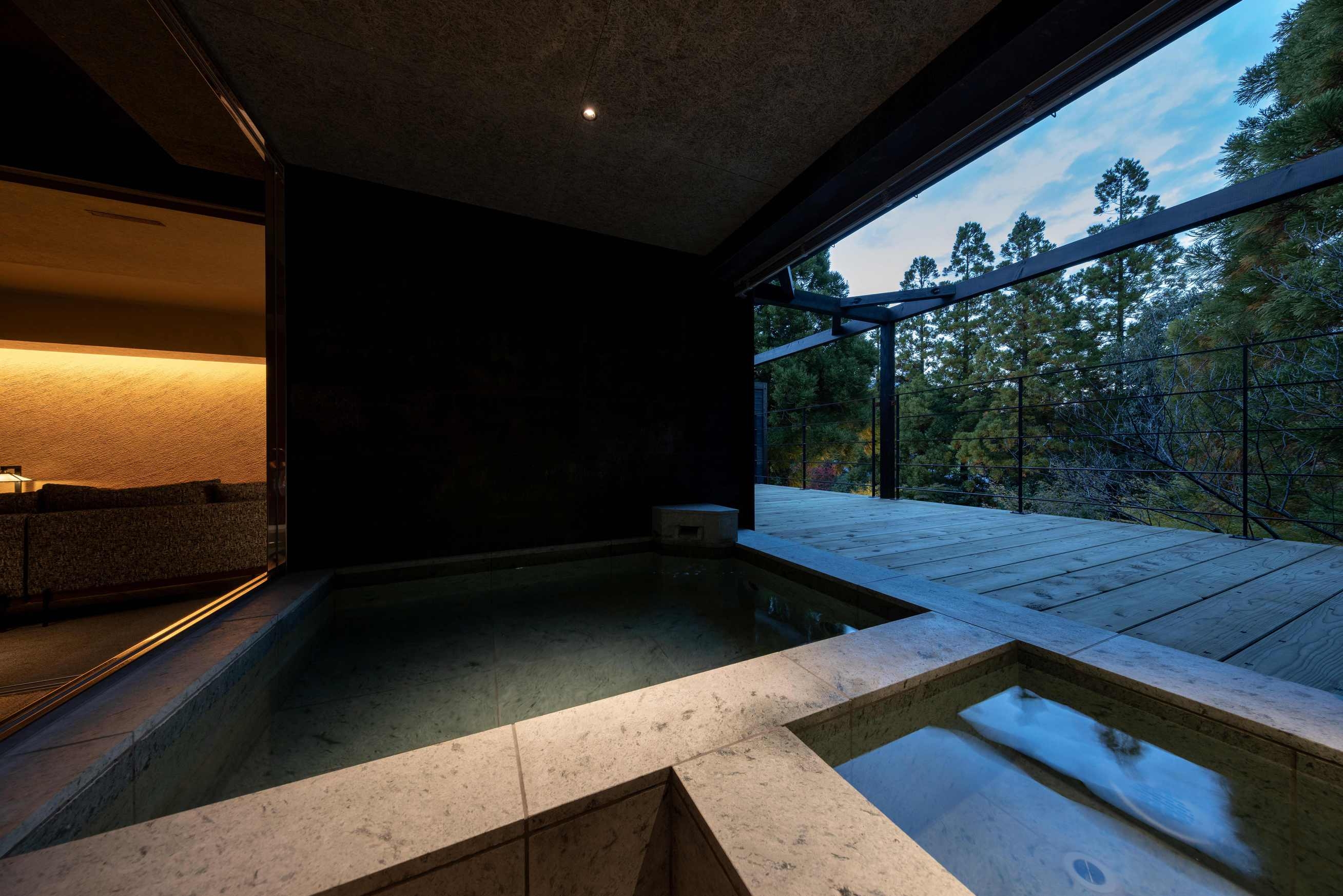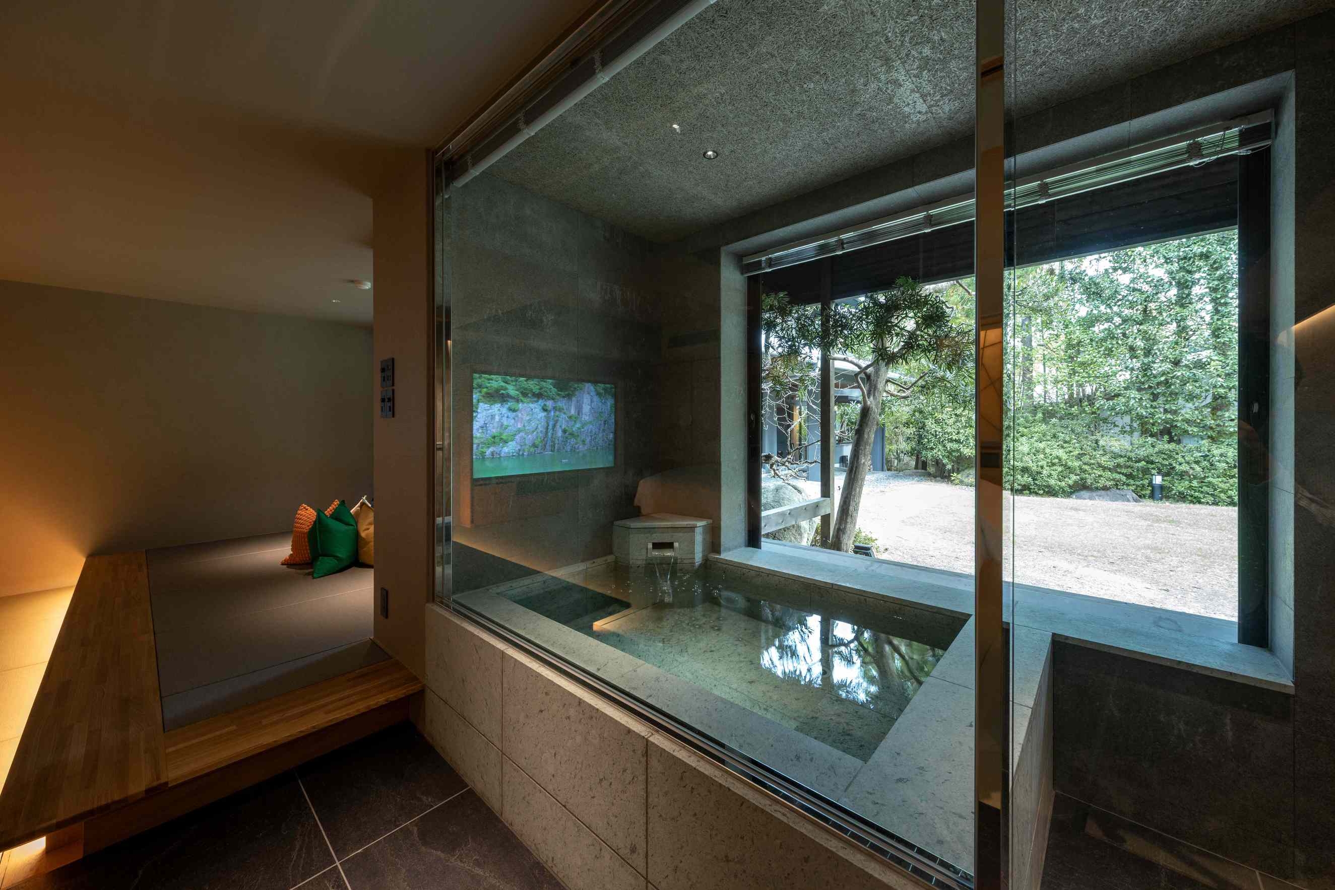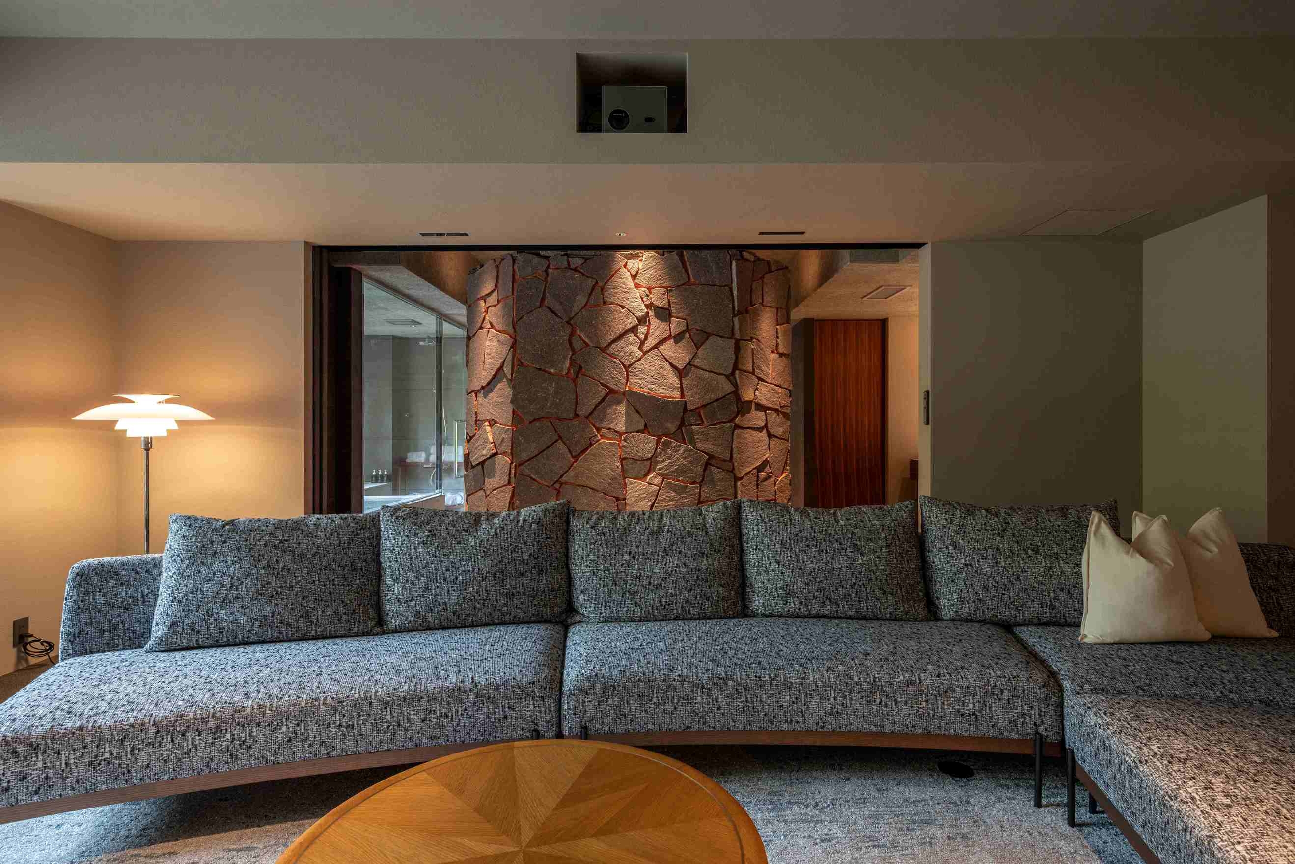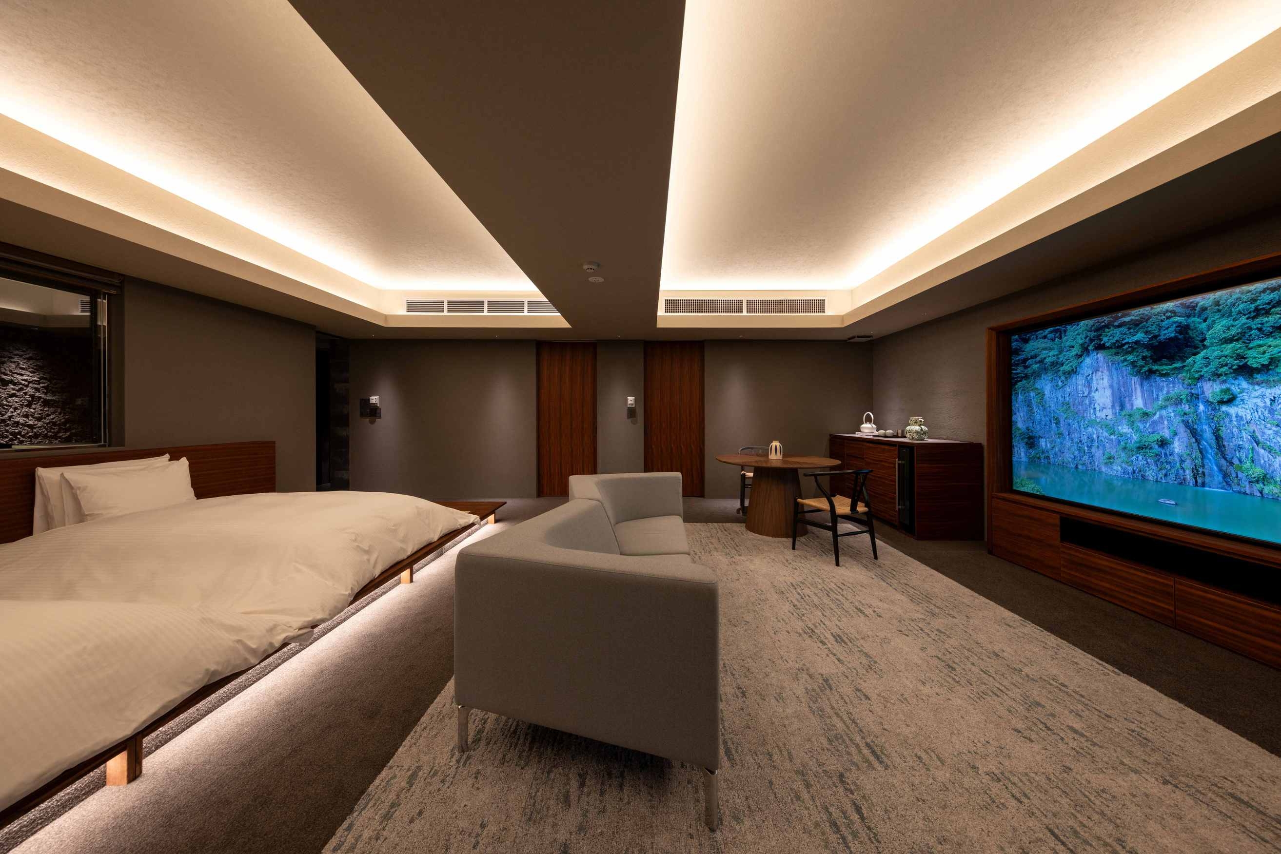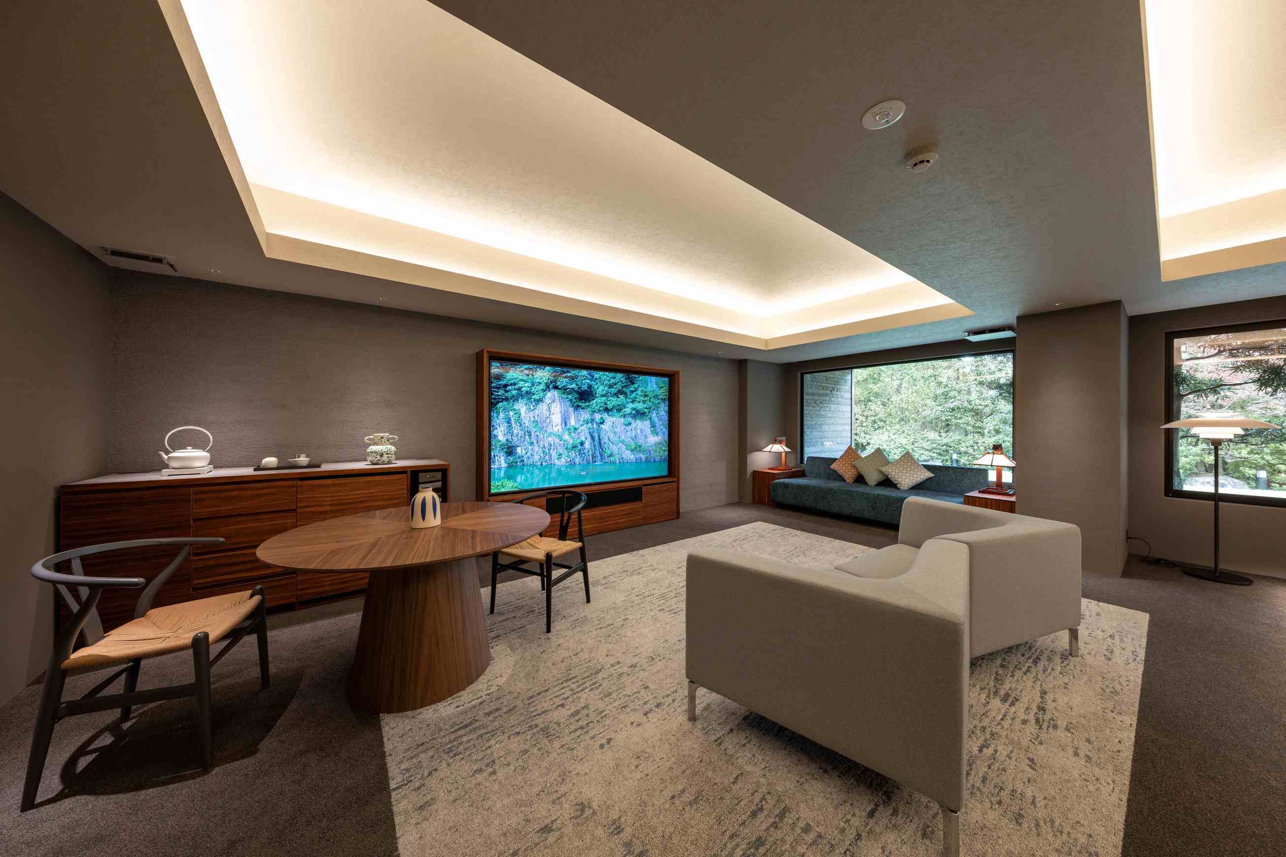 8室の客室温泉付きスイートのうち2室はプライベートサウナ付きで、心身をゆったり整える特別な滞在をお愉しみいただけます。フランク・ロイド・ライトのエッセンスを取り入れた設えが、和の趣と洗練された美しさを演出します。