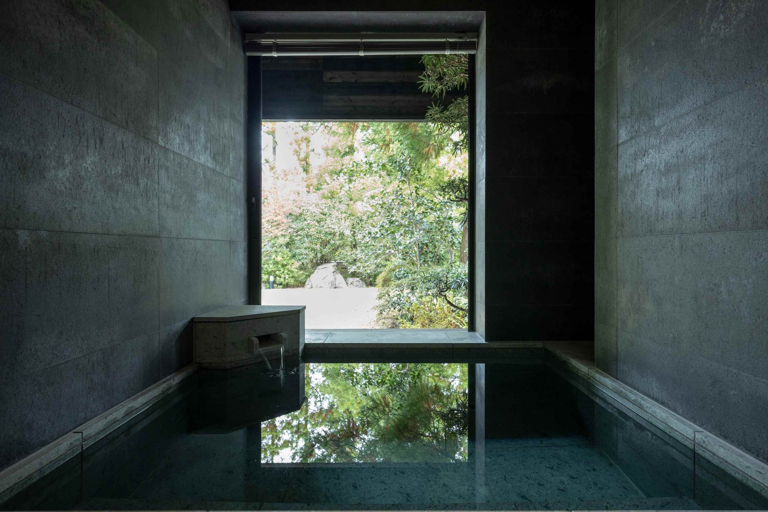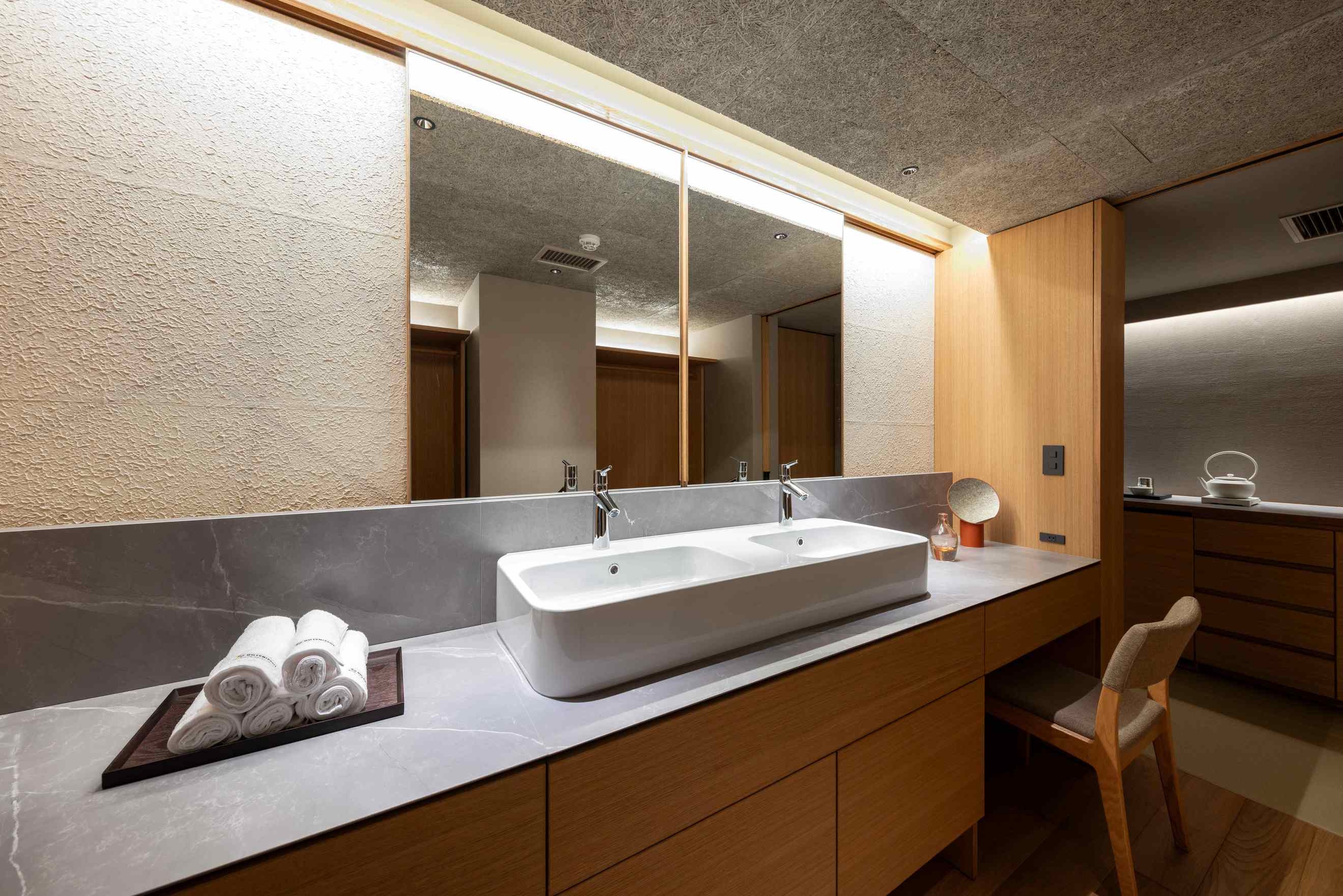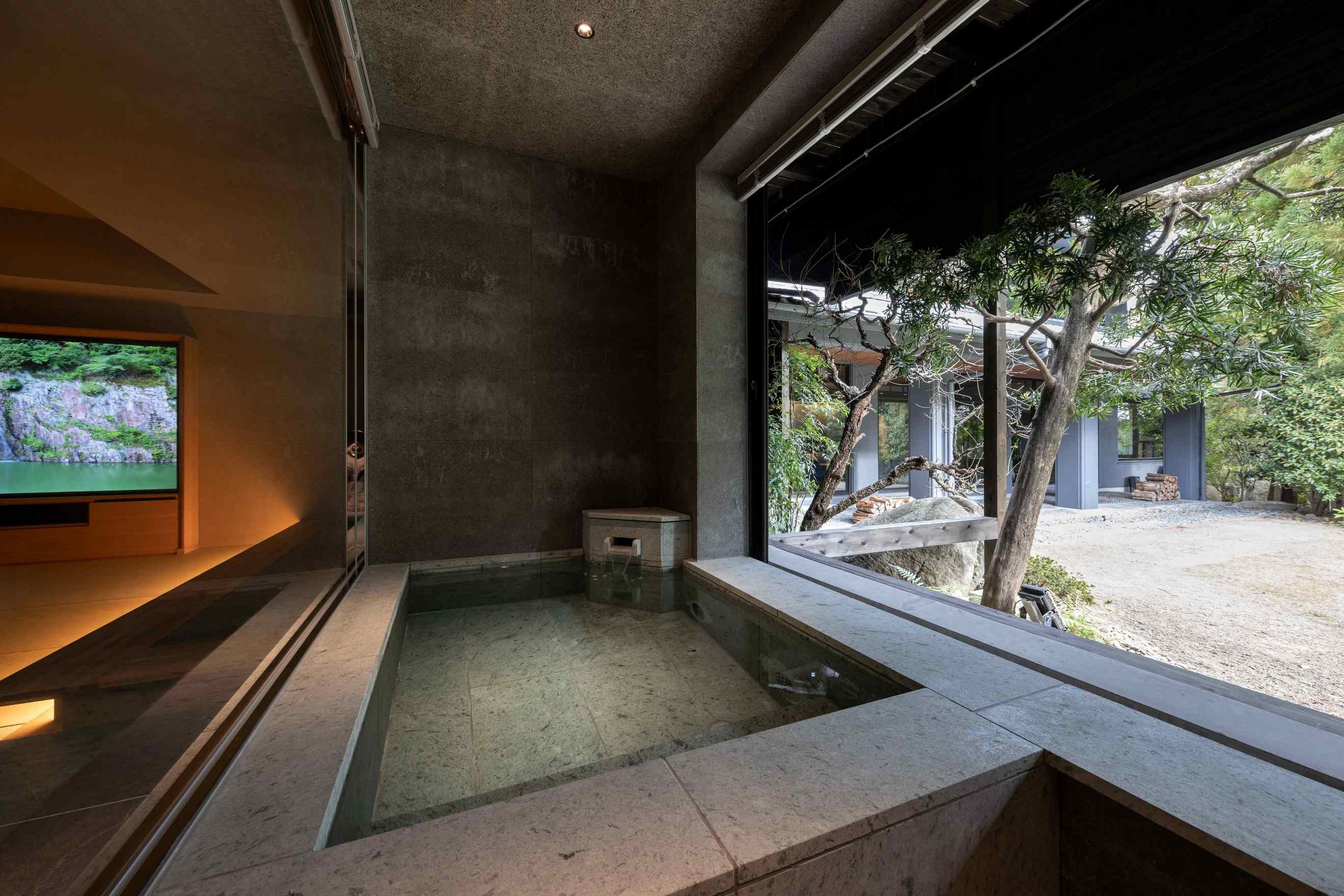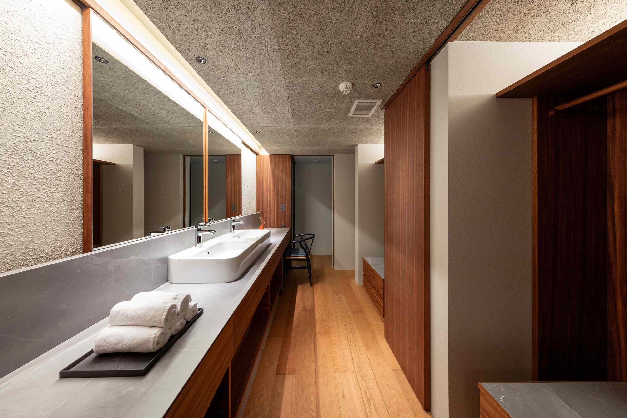 8室の客室温泉付きスイートのうち2室はプライベートサウナ付きで、心身をゆったり整える特別な滞在をお愉しみいただけます。フランク・ロイド・ライトのエッセンスを取り入れた設えが、和の趣と洗練された美しさを演出します。