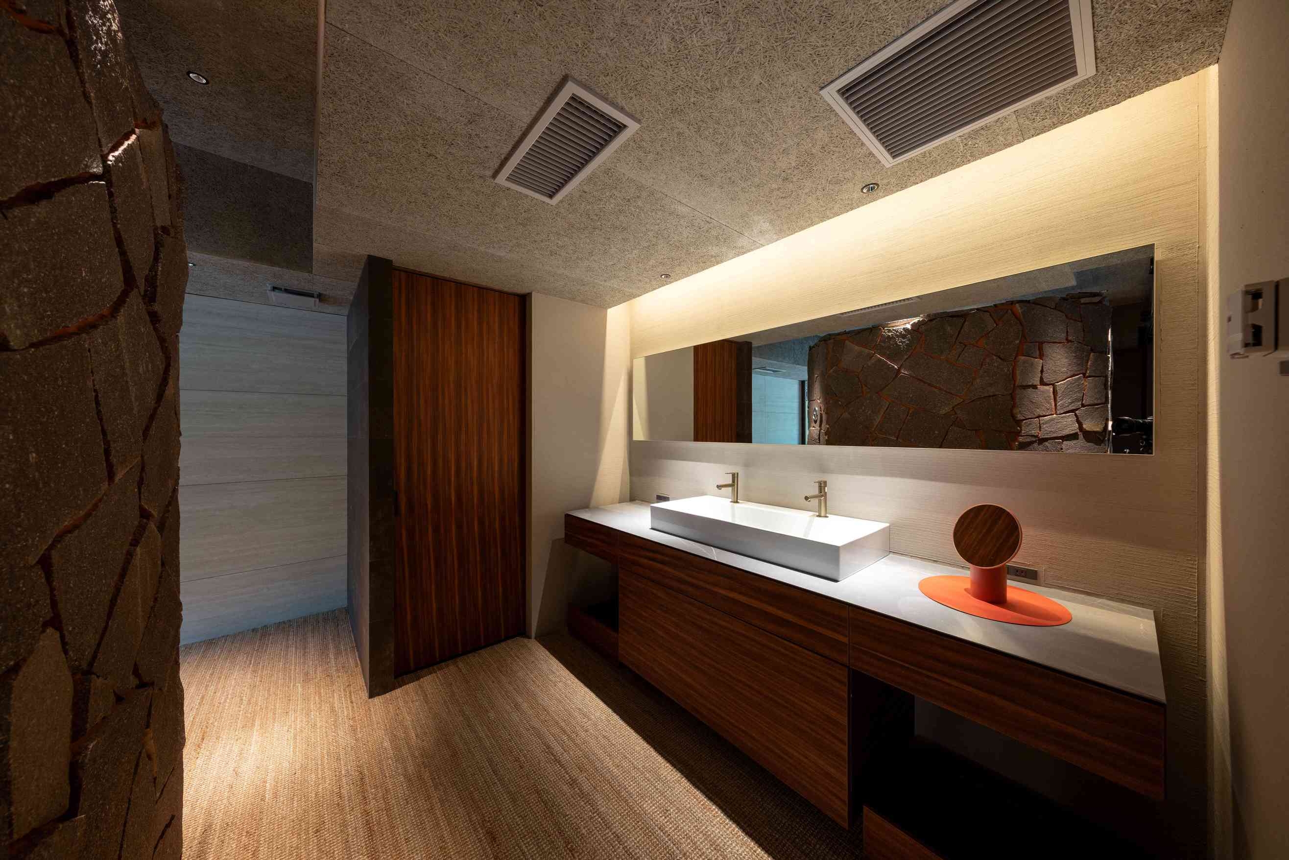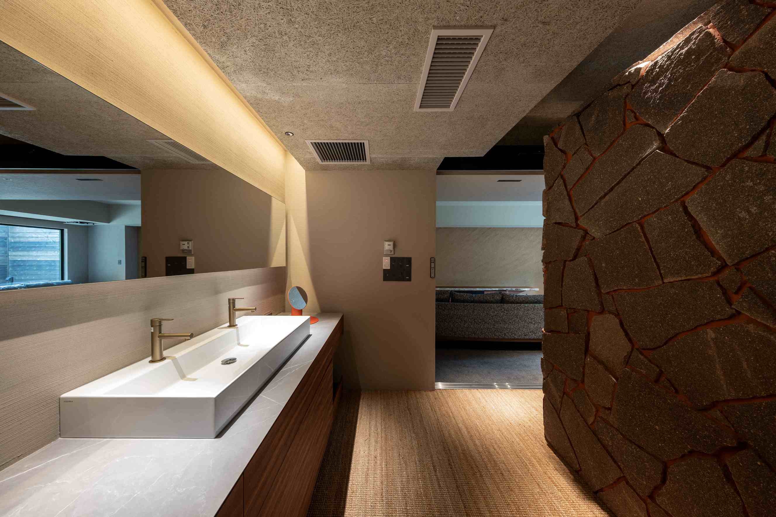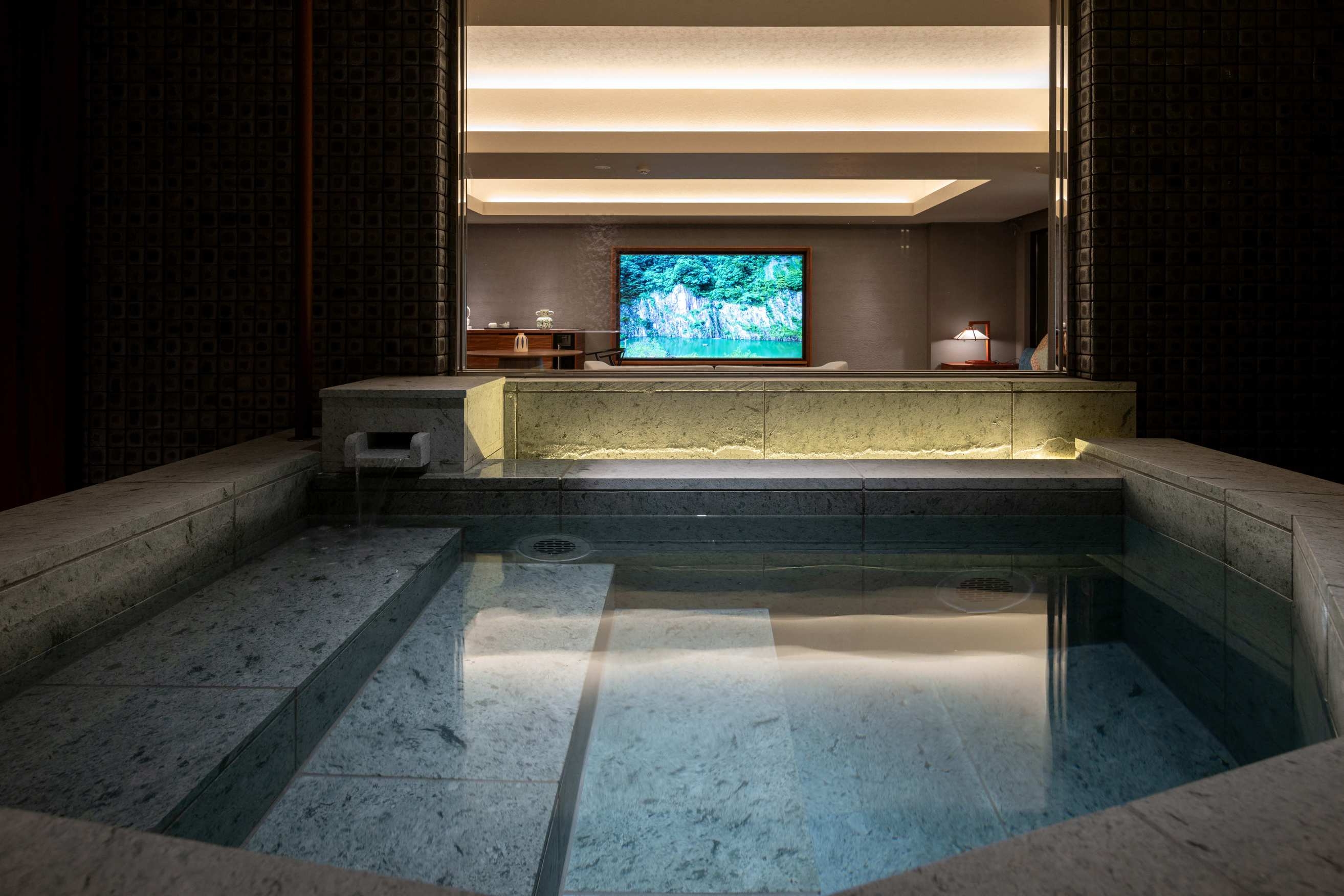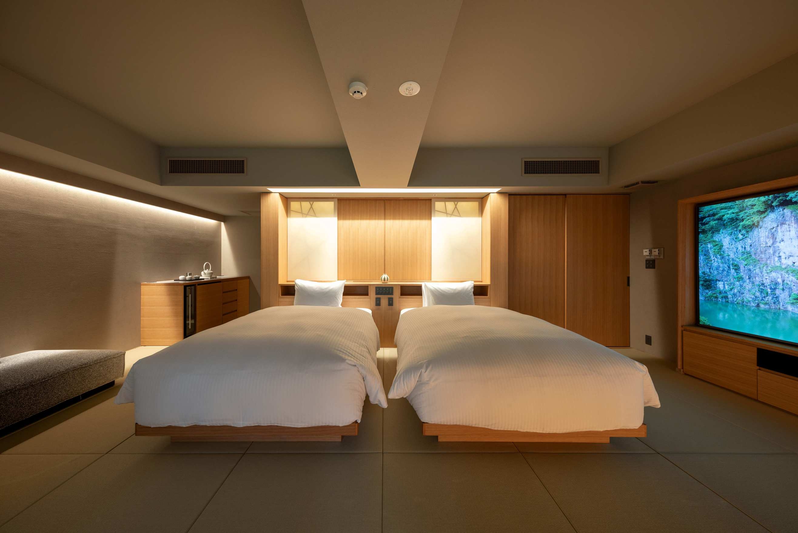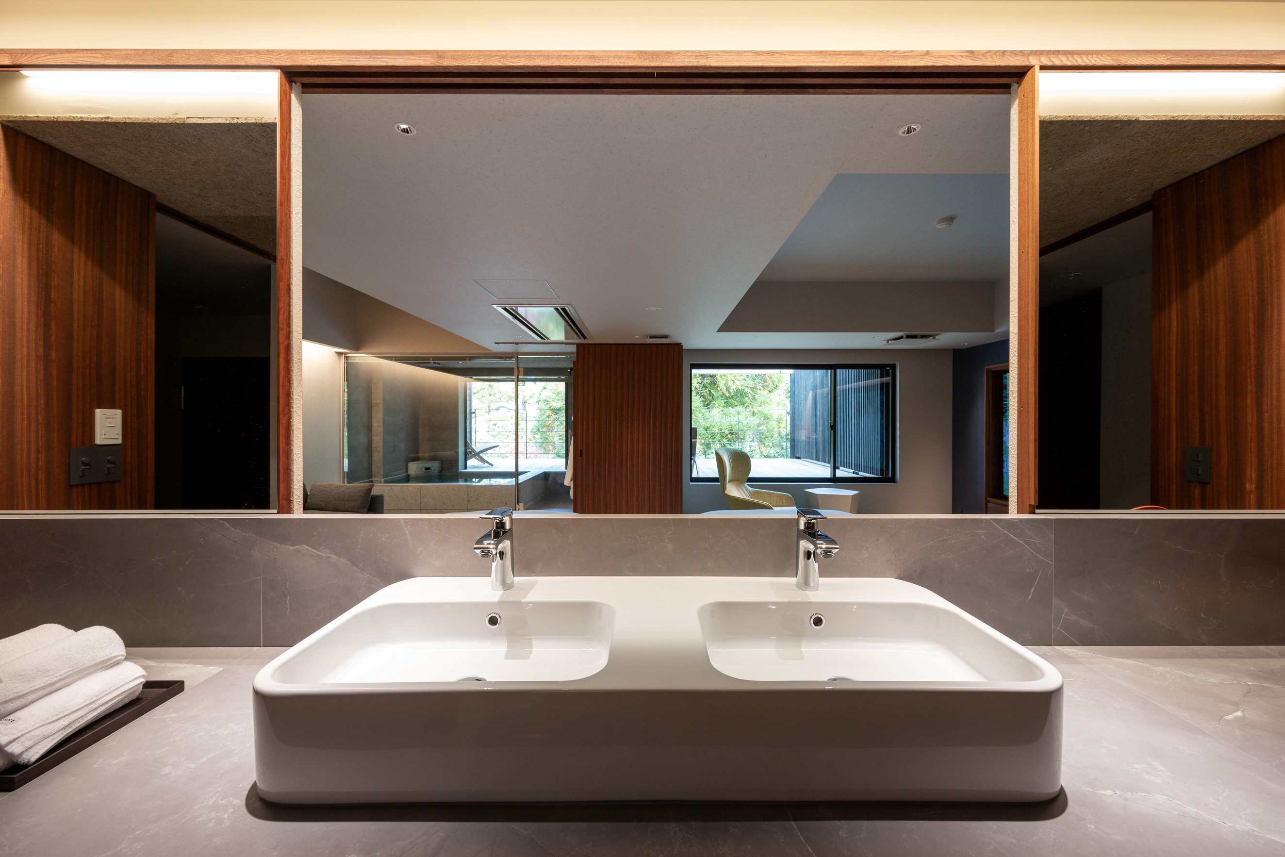 8室の客室温泉付きスイートのうち2室はプライベートサウナ付きで、心身をゆったり整える特別な滞在をお愉しみいただけます。フランク・ロイド・ライトのエッセンスを取り入れた設えが、和の趣と洗練された美しさを演出します。