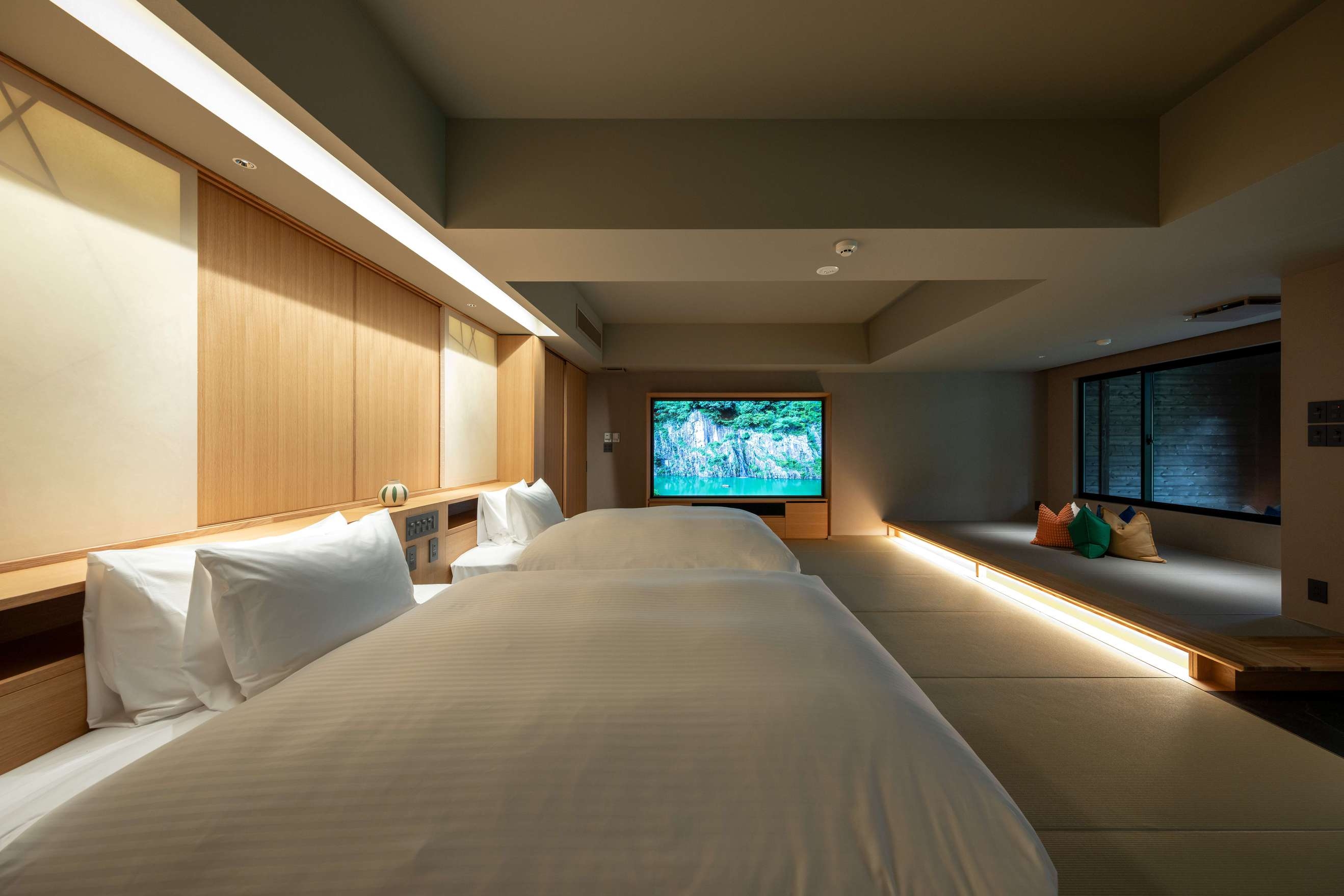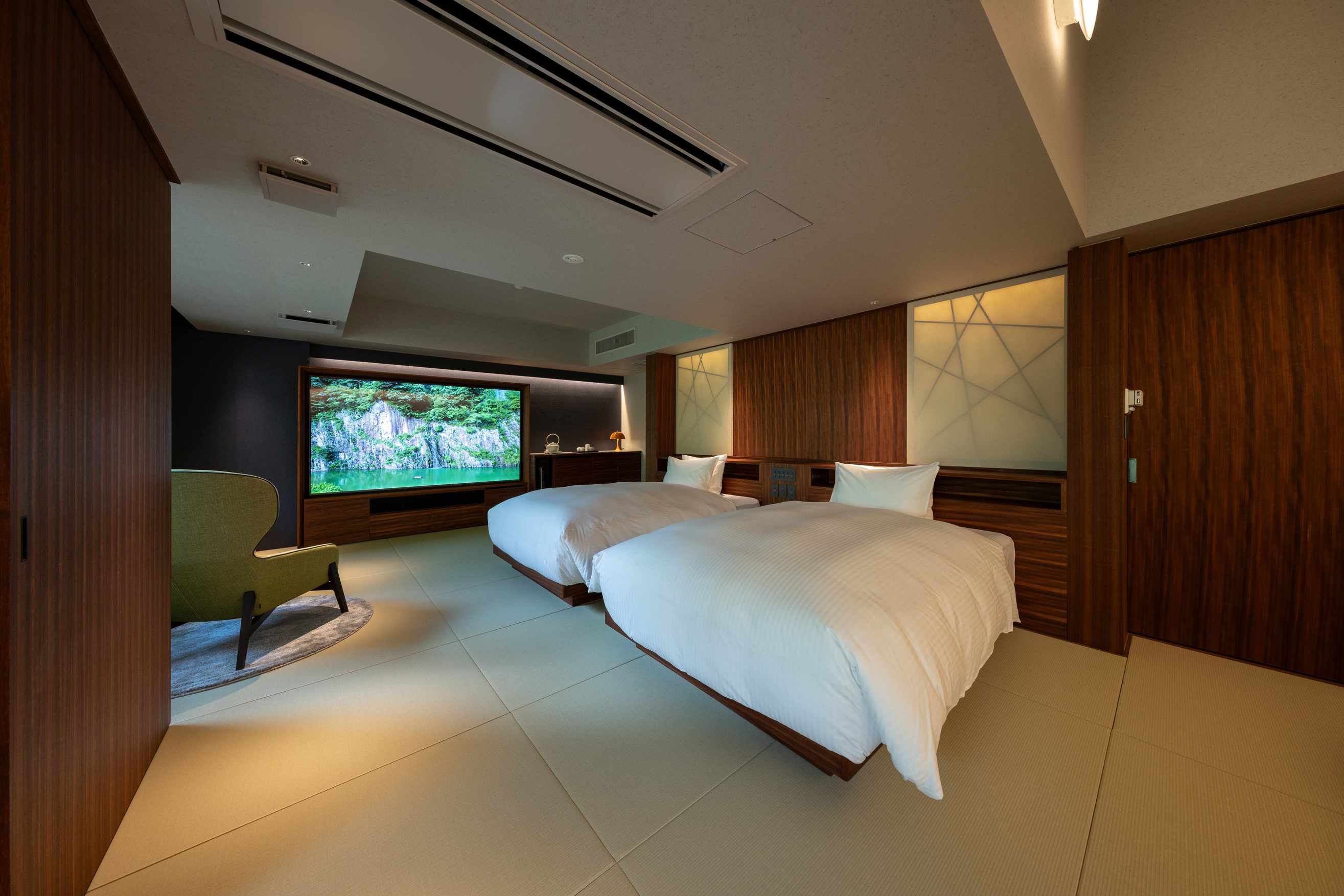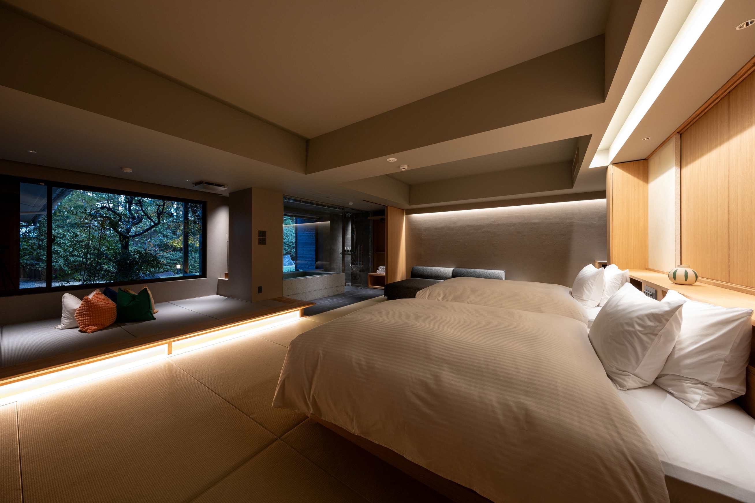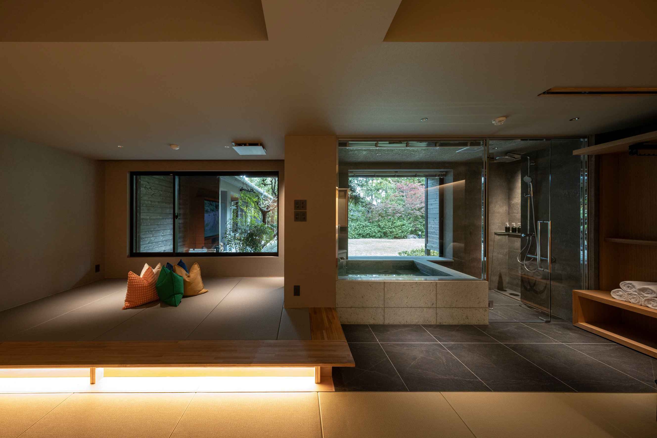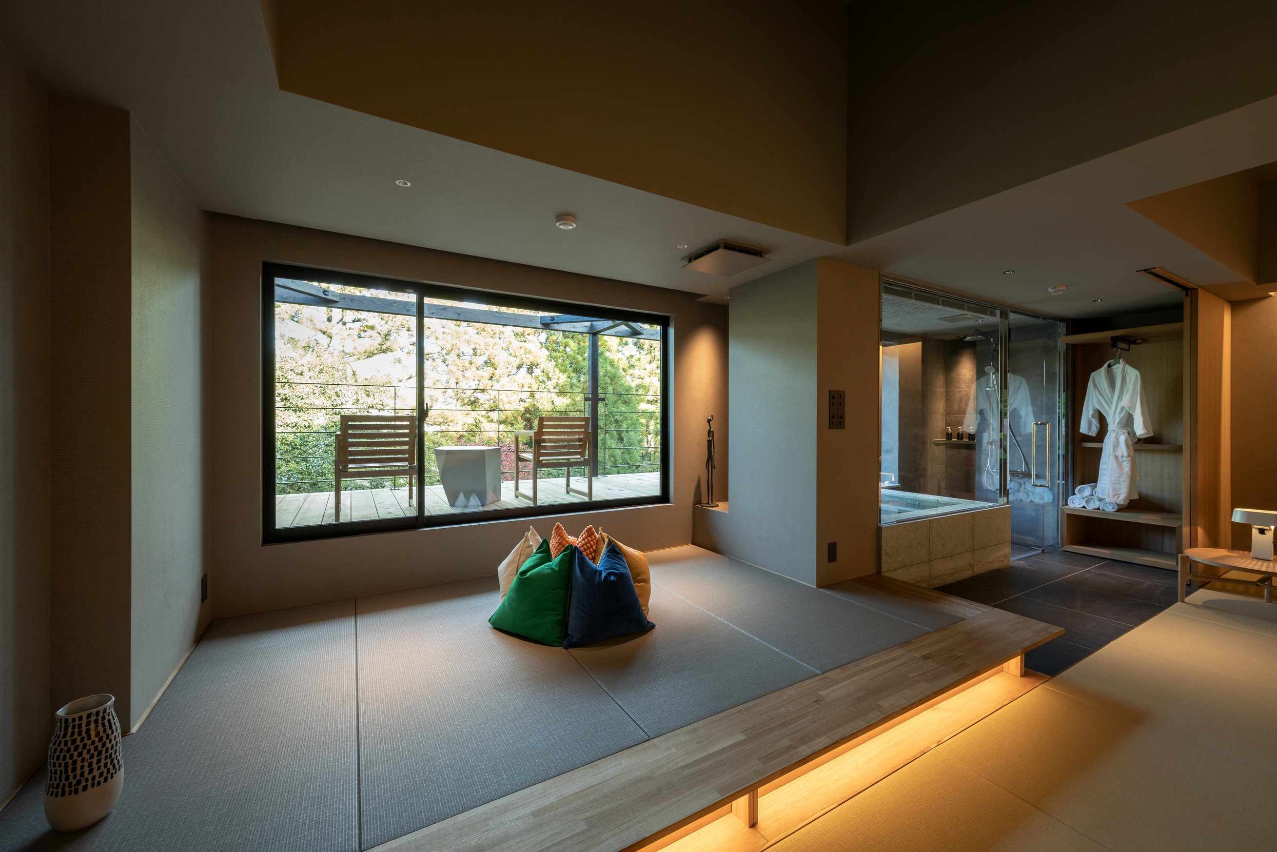 室内100平米、デッキなし。本館1階、庭の息づかいを間近に感じる特別な一室。畳の趣とプライベートサウナが織りなす上質な寛ぎの時間を。