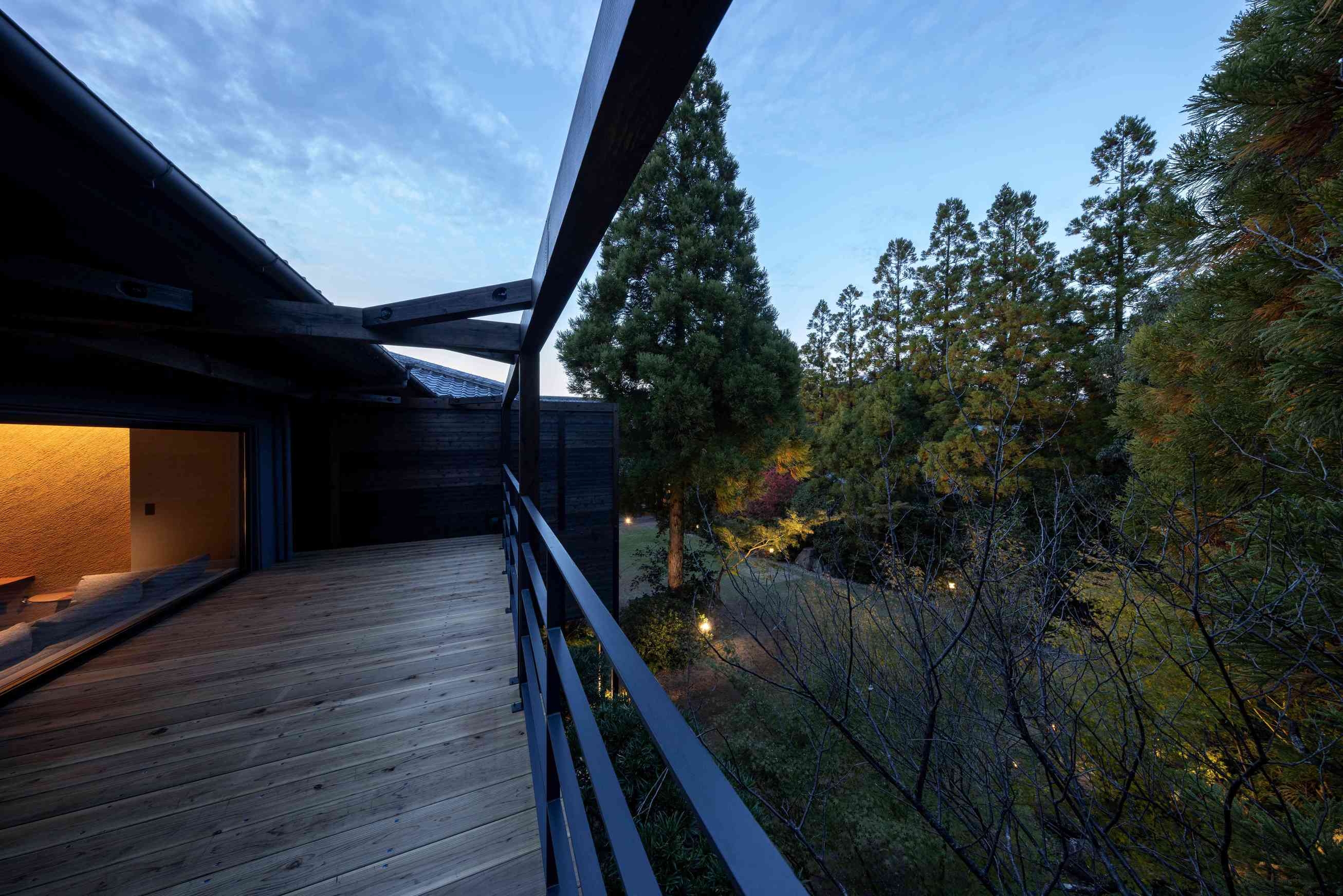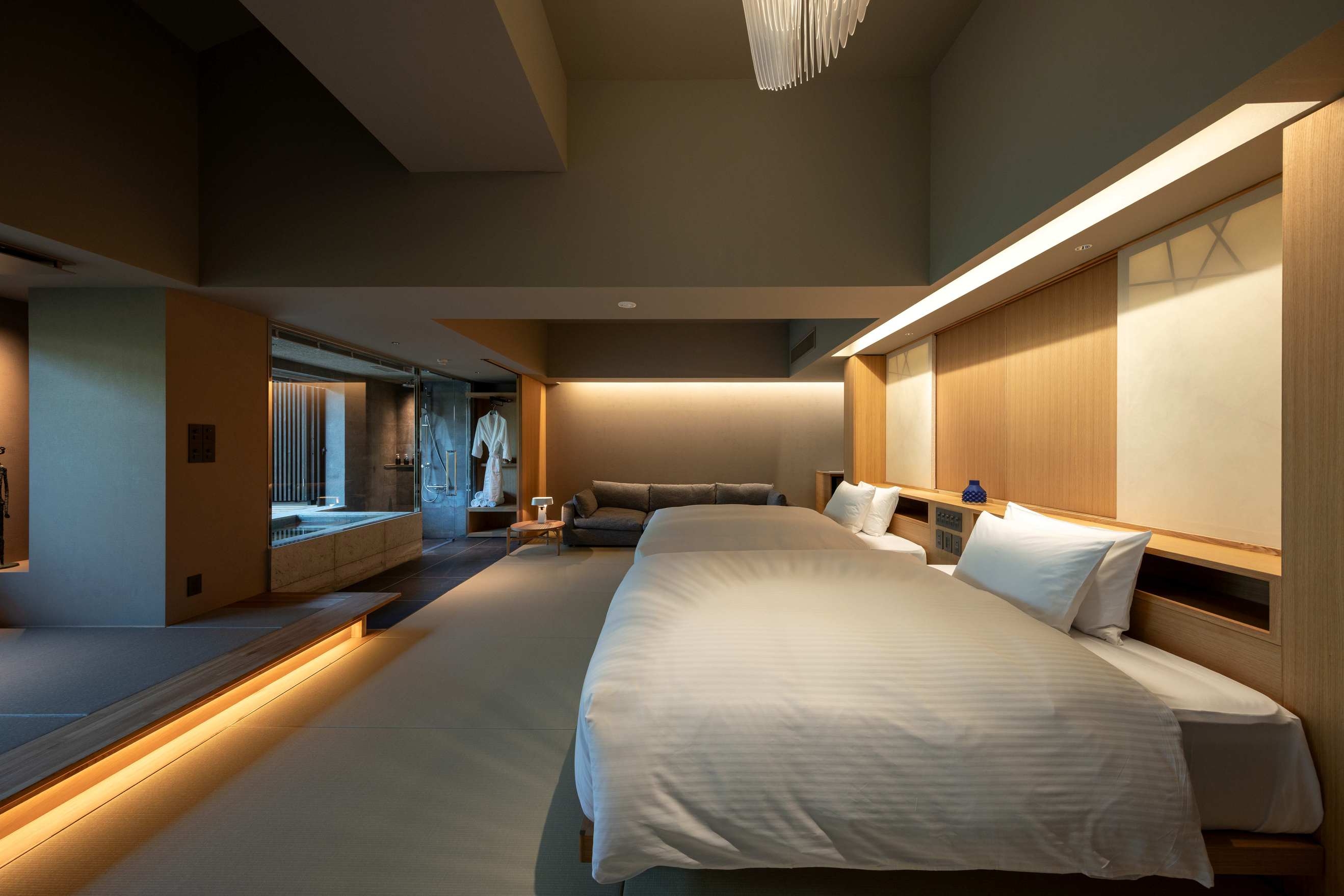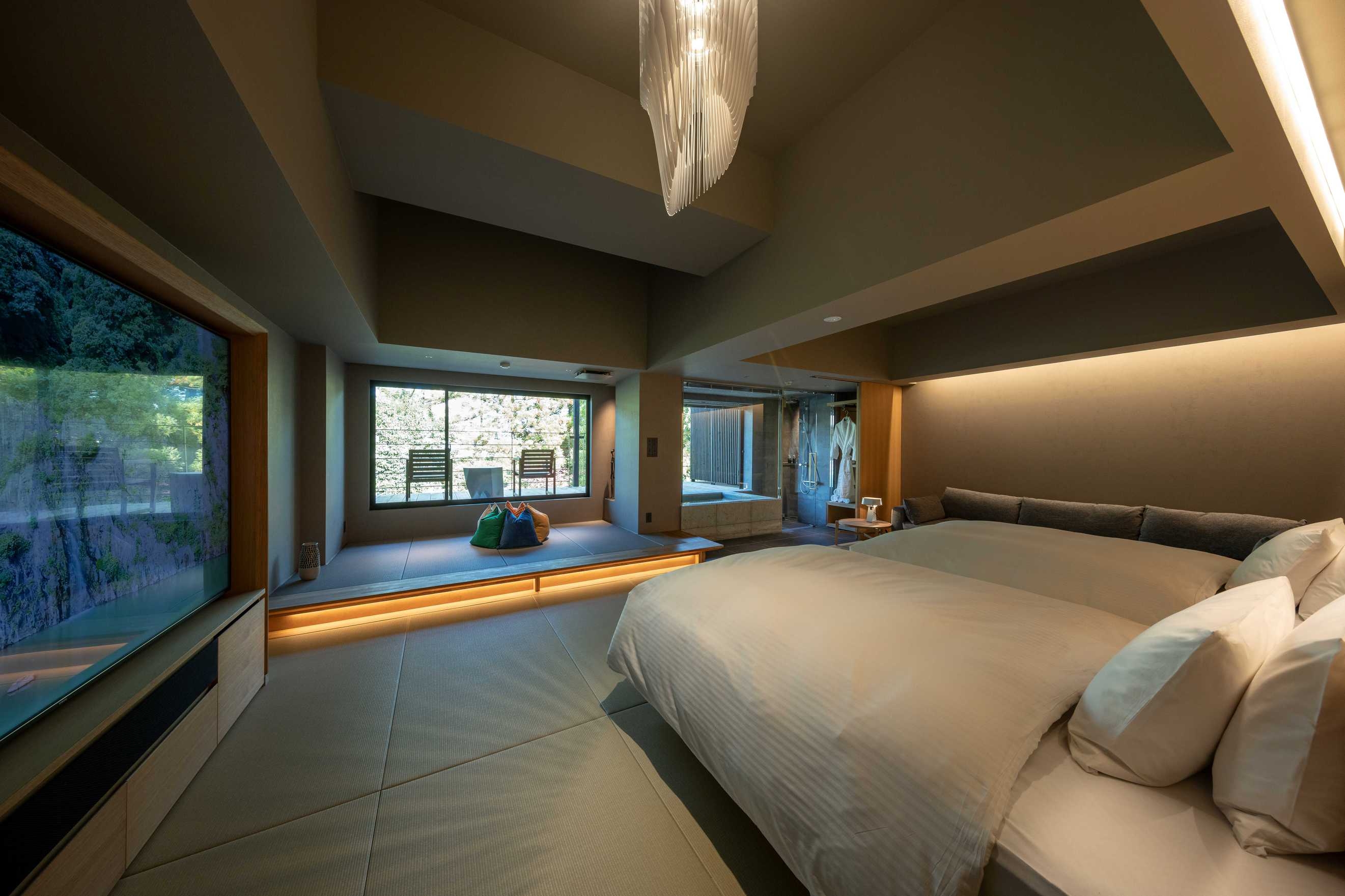 室内65平米+デッキ18平米。本館2階に佇む、和モダンの美を追求した一室。温泉の先に風の通るデッキが広がり、ザハ・ハディドの照明〈avia〉が空間にアートの輝き