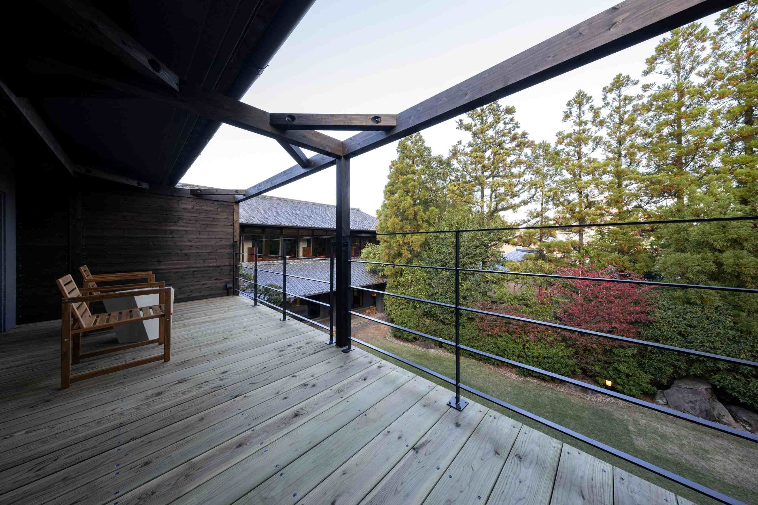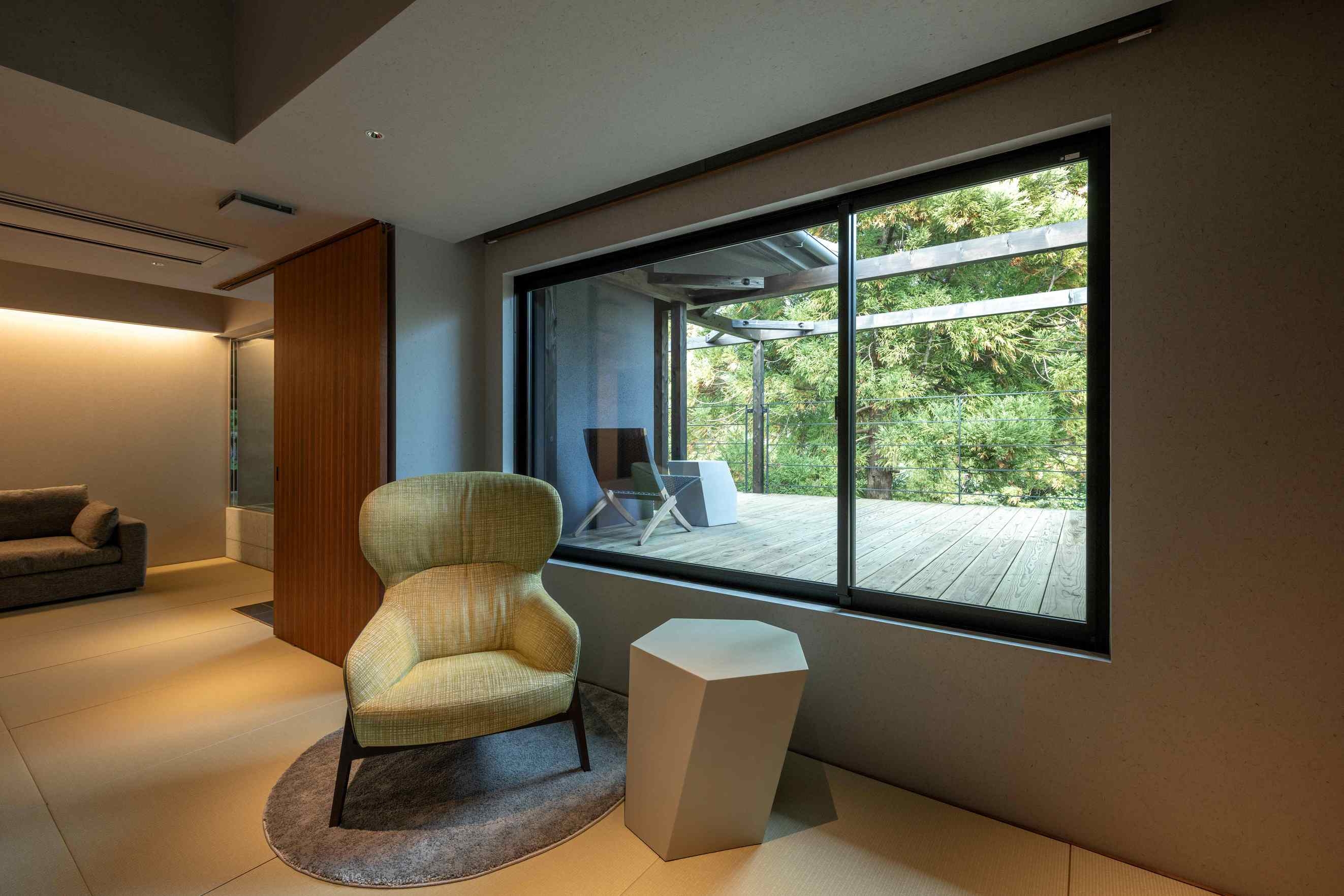 室内69平米+デッキ27平米。本館2階、庭を望む大きな窓が印象的な客室。シックな設えと温泉の先に広がるデッキが、上質な寛ぎを演出します。