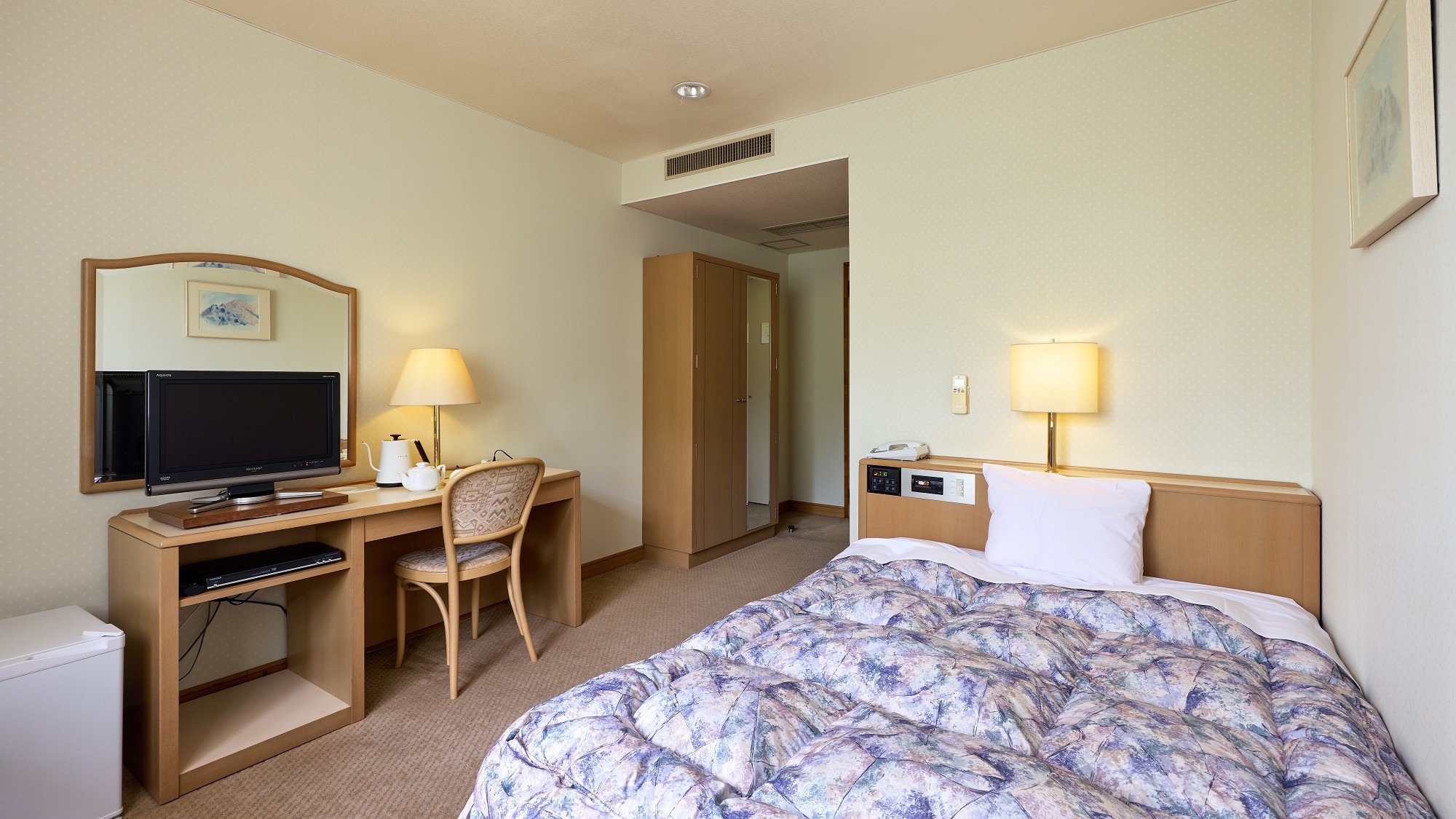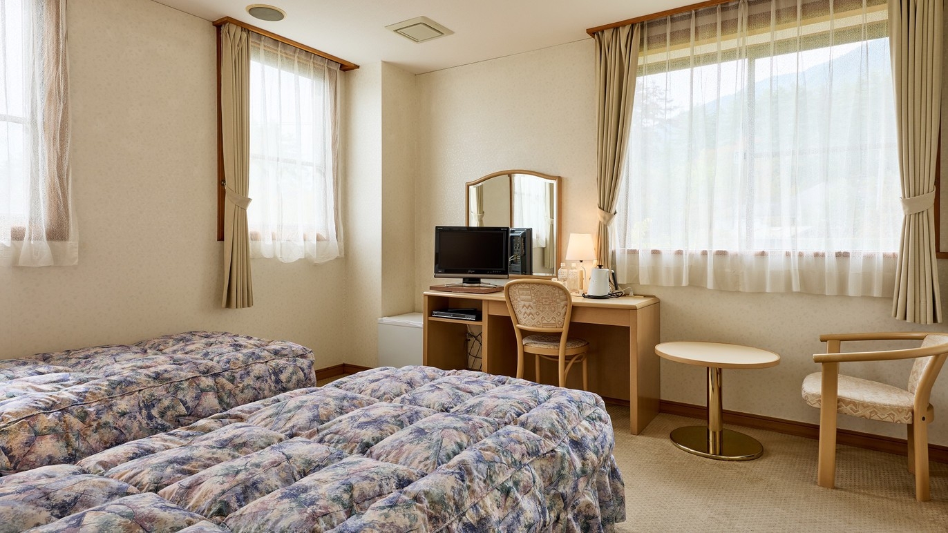 100幅シングルベッド一台、120幅セミダブルベッド一台のお部屋。 ※3名様利用の場合はエキストラベッドが入ります。こちらのお部屋は2階または3階にございます。