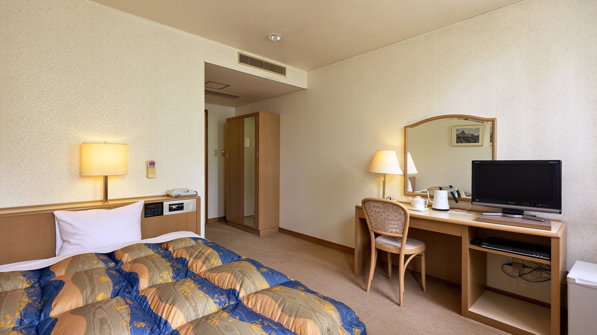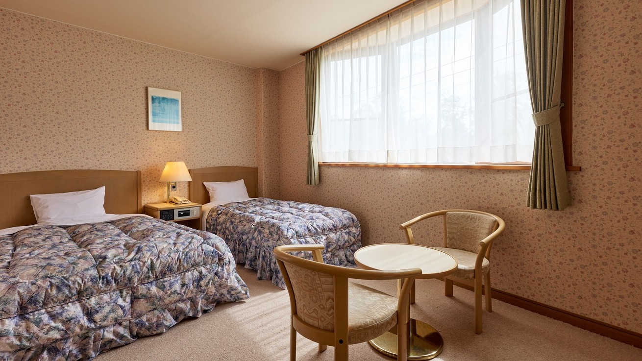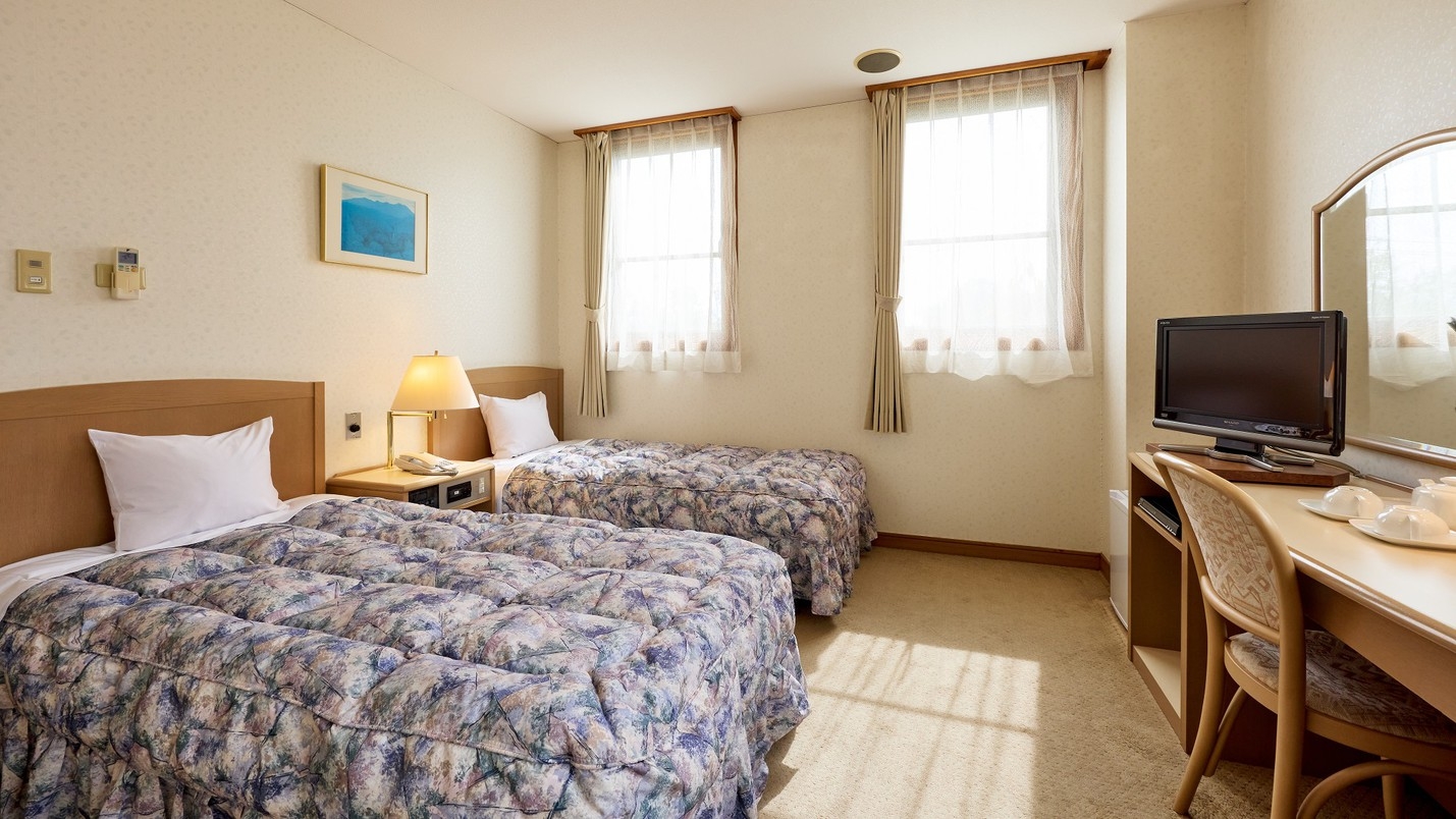 100幅シングルベッド2つのお部屋になります。 少しこじんまりした広さです。※当館にエレベーターはございません。 こちらのお部屋は3階にございます。