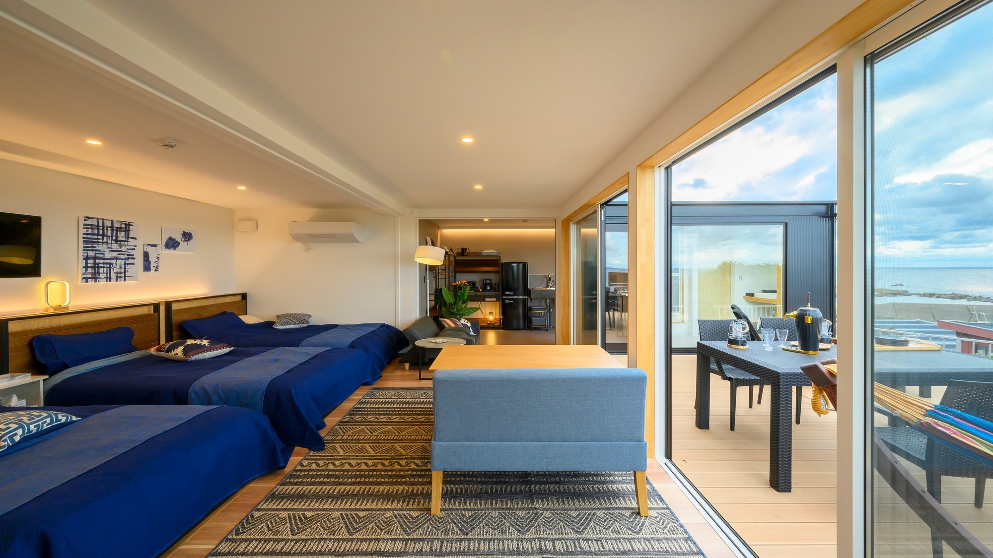 ブルーと黒を基調としたインテリアと 灯台まで見晴らす景色が魅力のお部屋です。