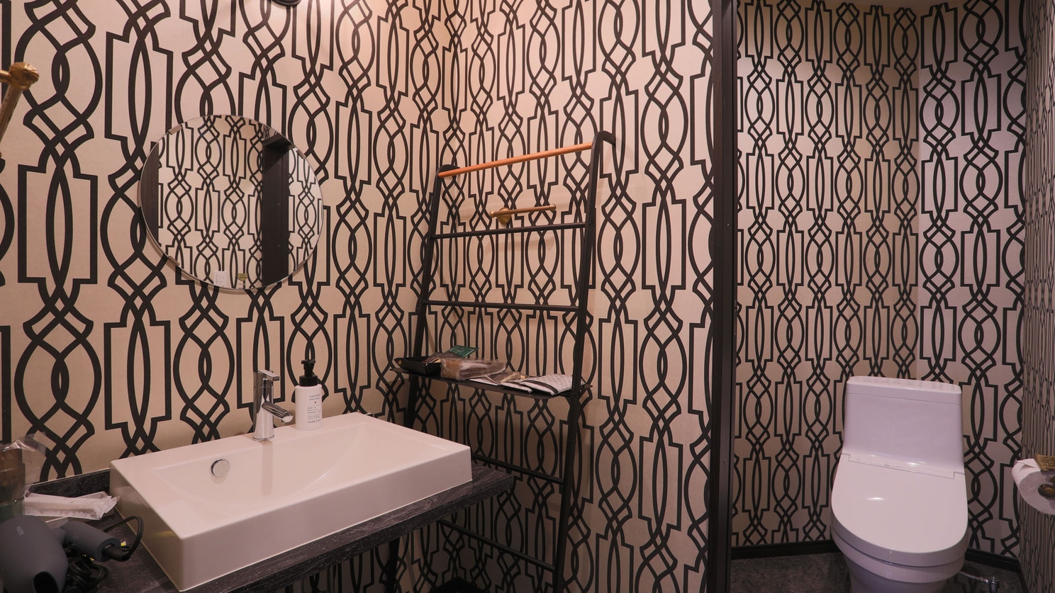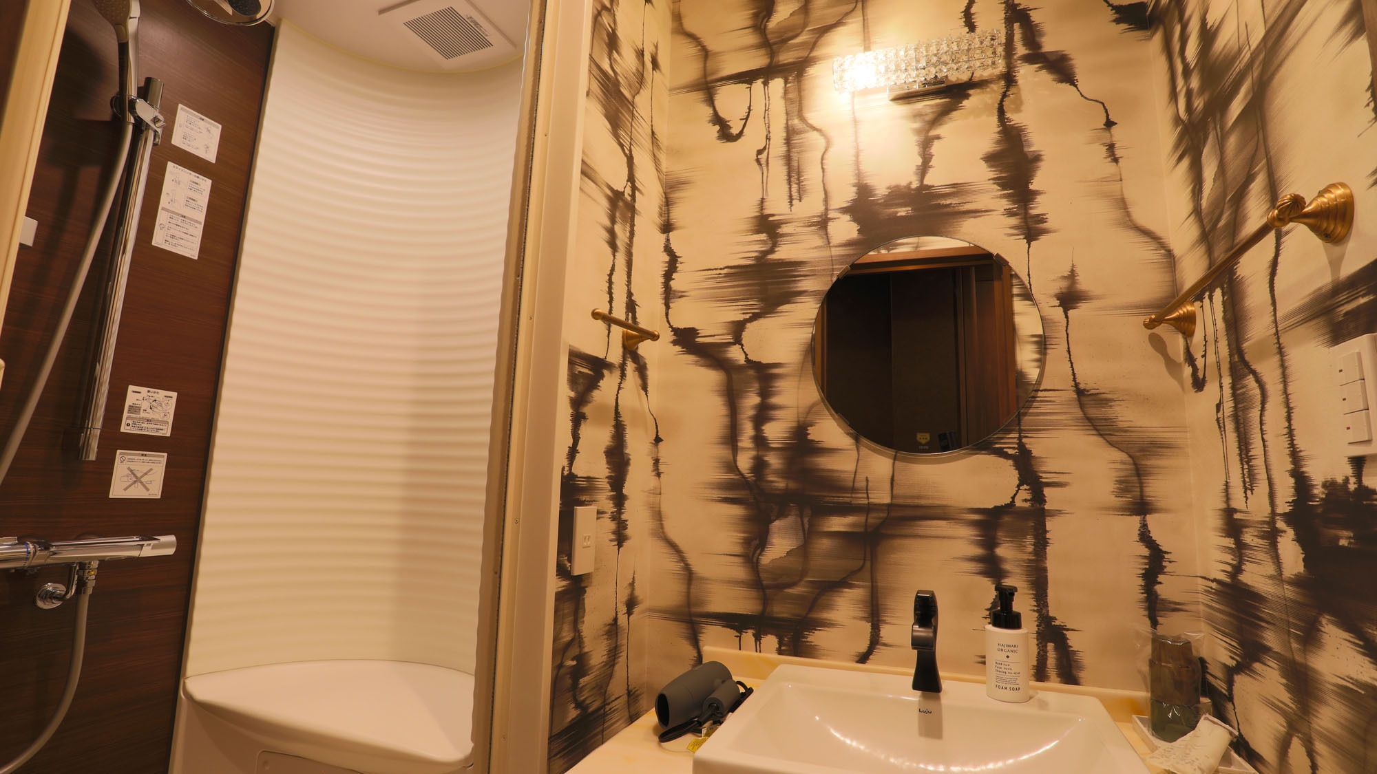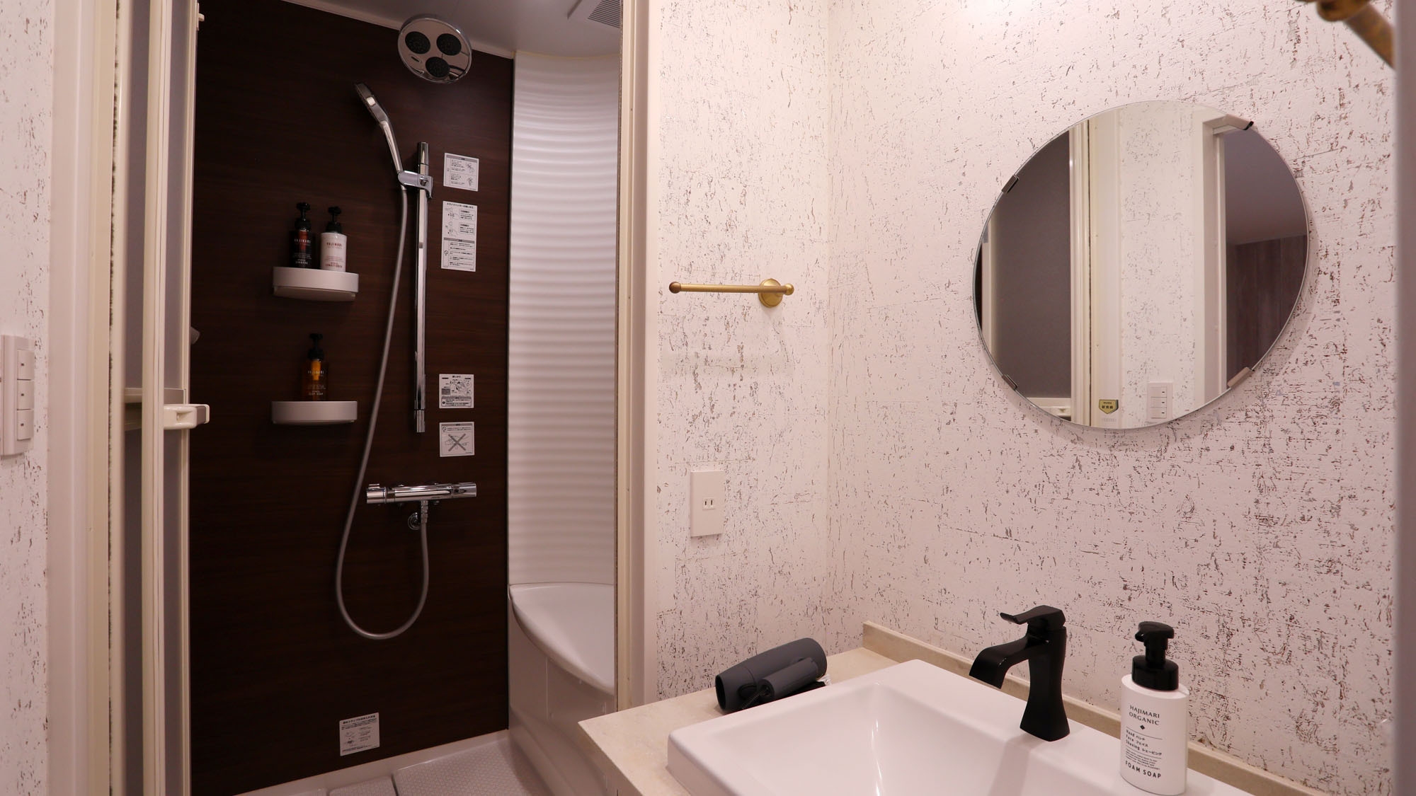ベッドは広々クイーンサイズ。 お部屋にはシャワーブース・温水洗浄機付トイレ・洗面付き。 部屋毎に異なる趣が面白いお部屋です。