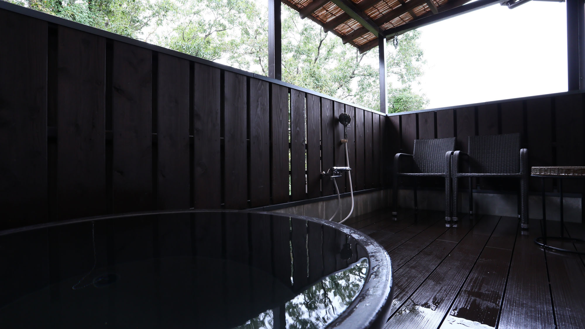 客室専用デッキには、ご宿泊毎に温泉を入れ替える陶器露天風呂。 フランスベッドのベッドルームにはセミダブルベッドが2台ございます。