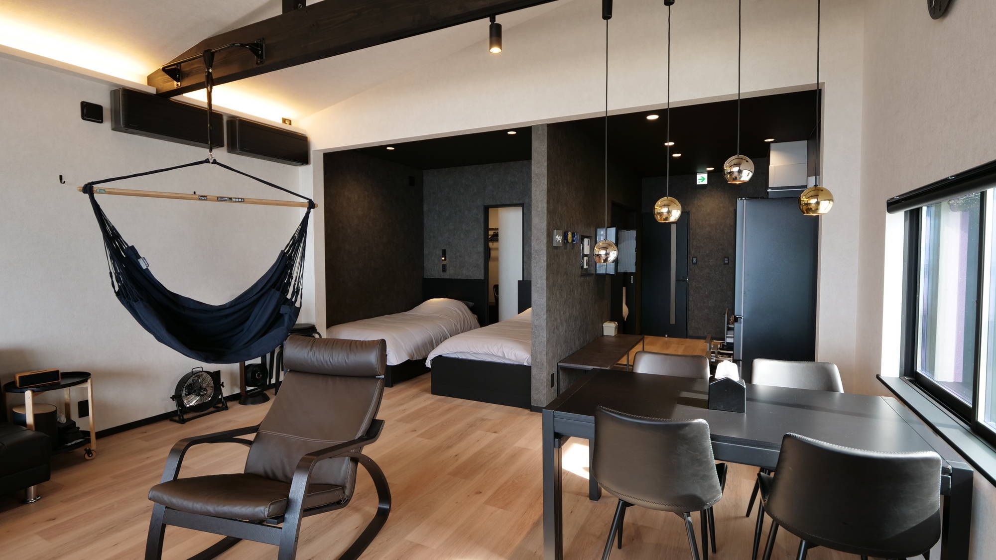モダンナチュラルな統一感のあるお部屋です。 リビングルームには、ハンモックや揺り椅子をご用意しております。座りながら海を眺めることもできます。