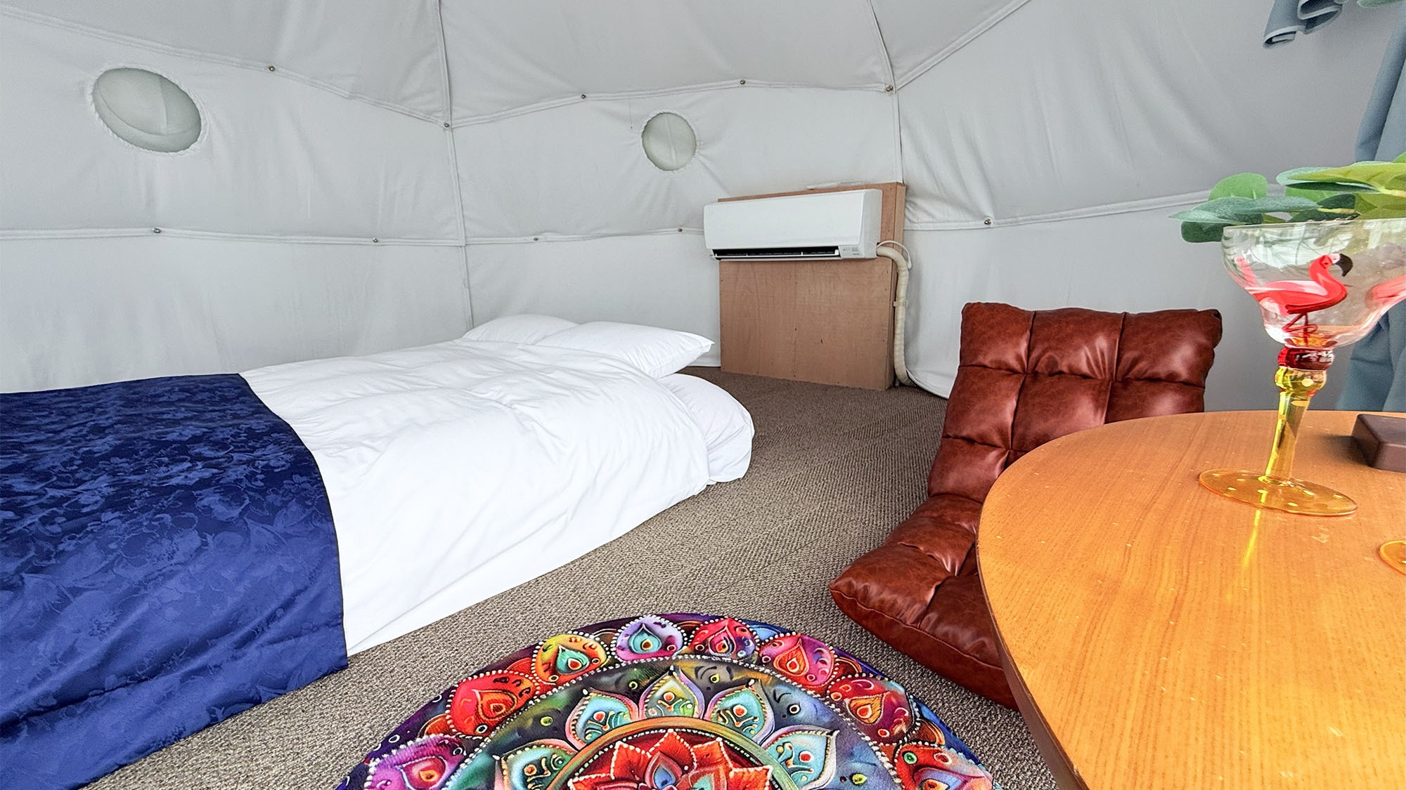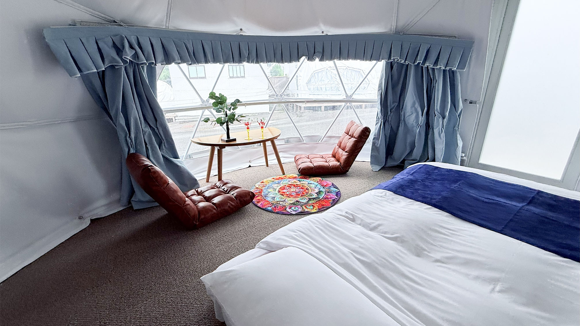【ドームテントとコテージの両方に滞在いただけるお部屋】ダブルベッド×2/ソファ/テーブル/冷蔵庫/電子レンジ/バストイレ洗面所3点独立型 客室内風呂の蛇口は温泉