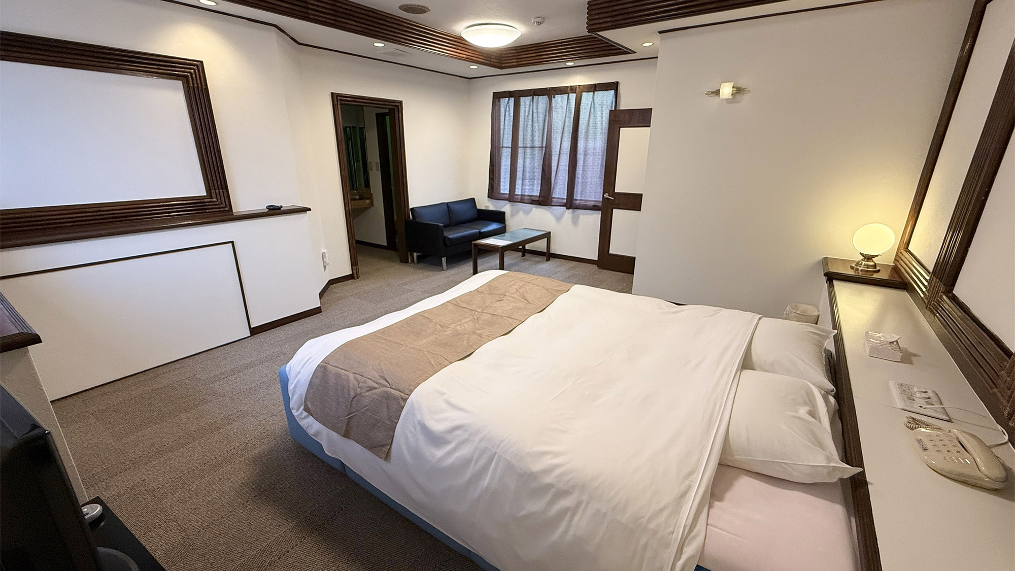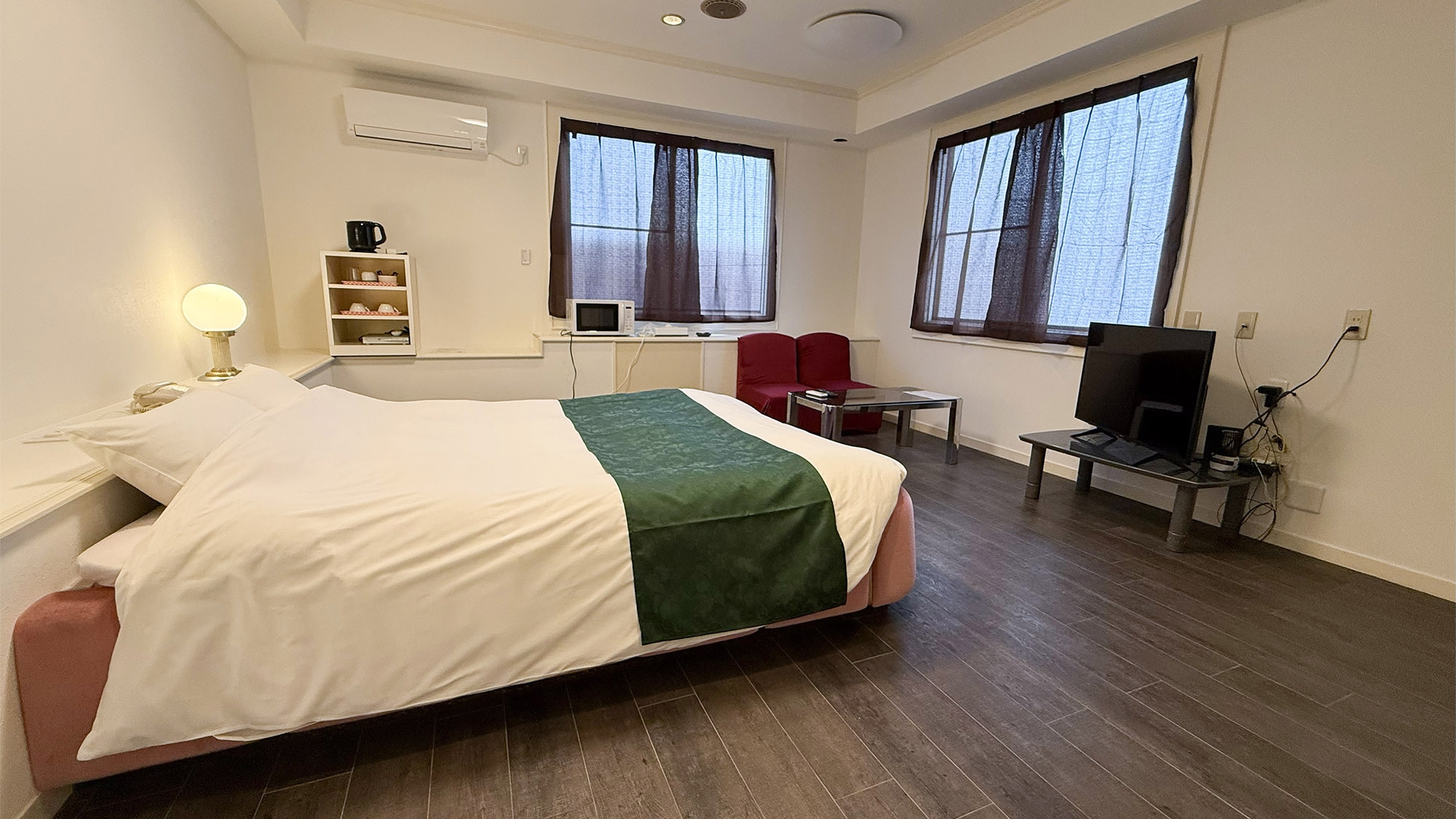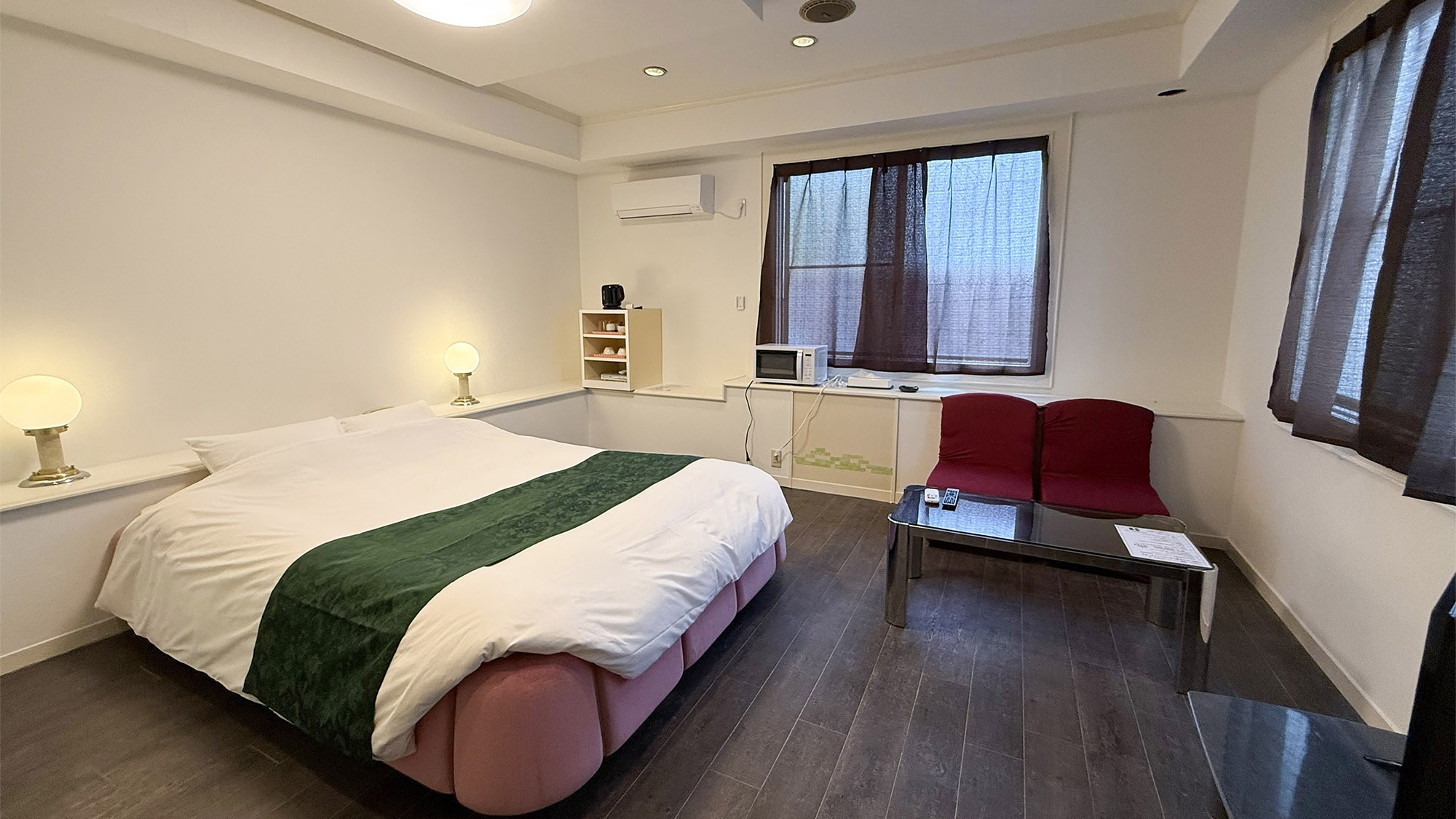 【隣の音が気になりづらい独立タイプ】ダブルベッド/ソファ/テーブル/冷蔵庫/電子レンジ/バストイレ洗面所3点独立型 客室内風呂の蛇口は温泉!