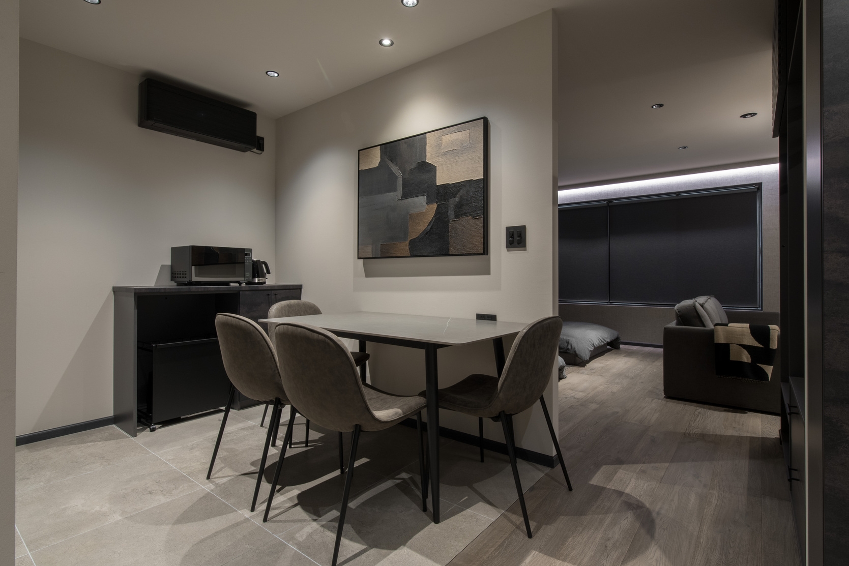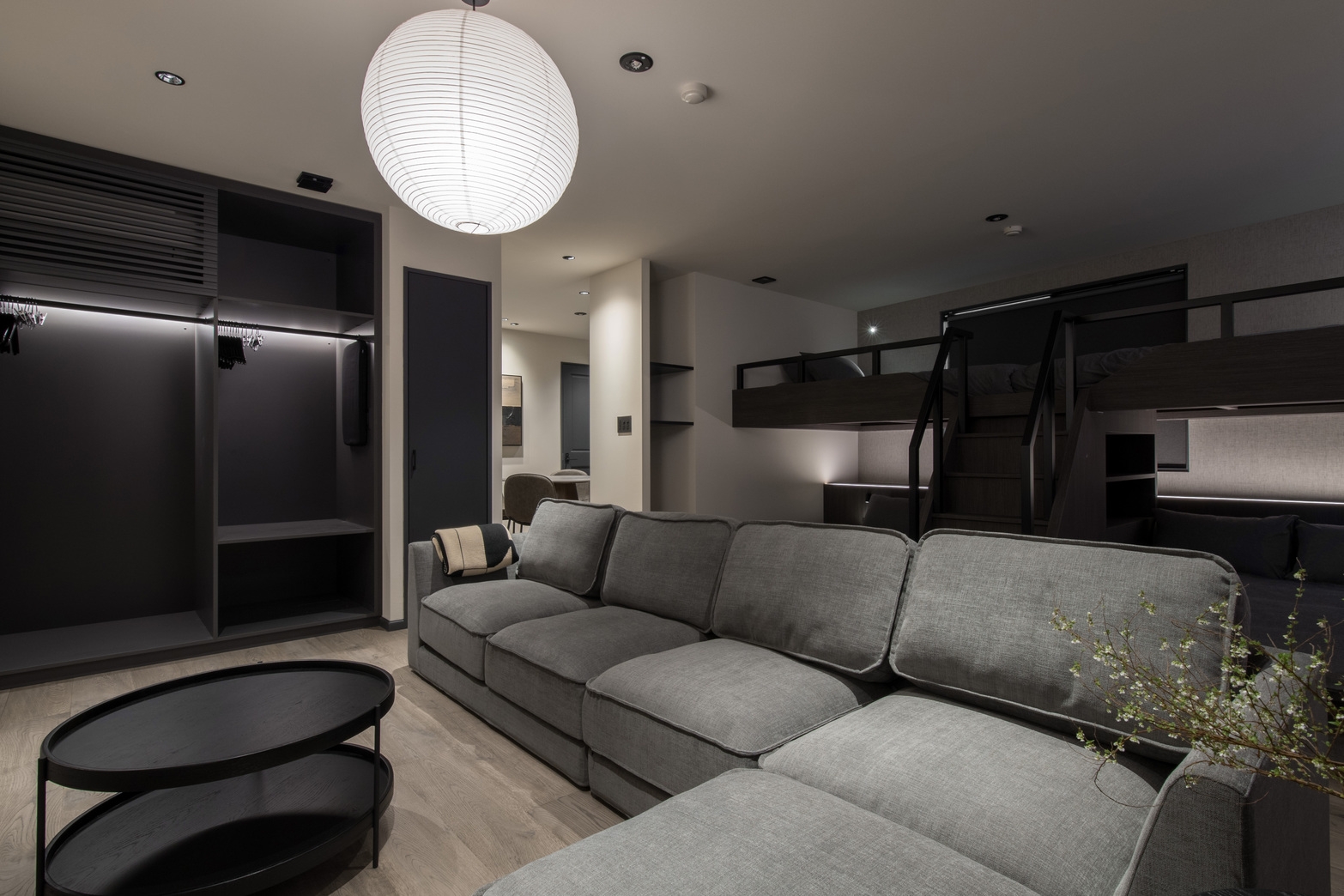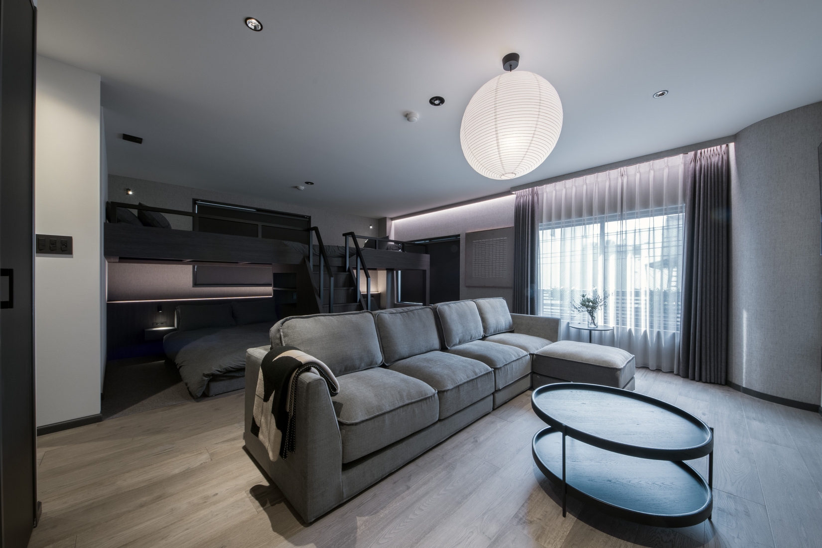 ・リビングとベッドエリアがシームレスに繋がる間取りは、それぞれが好きな場所で寛ぎながらも、同じ時を共有できるステイ体験