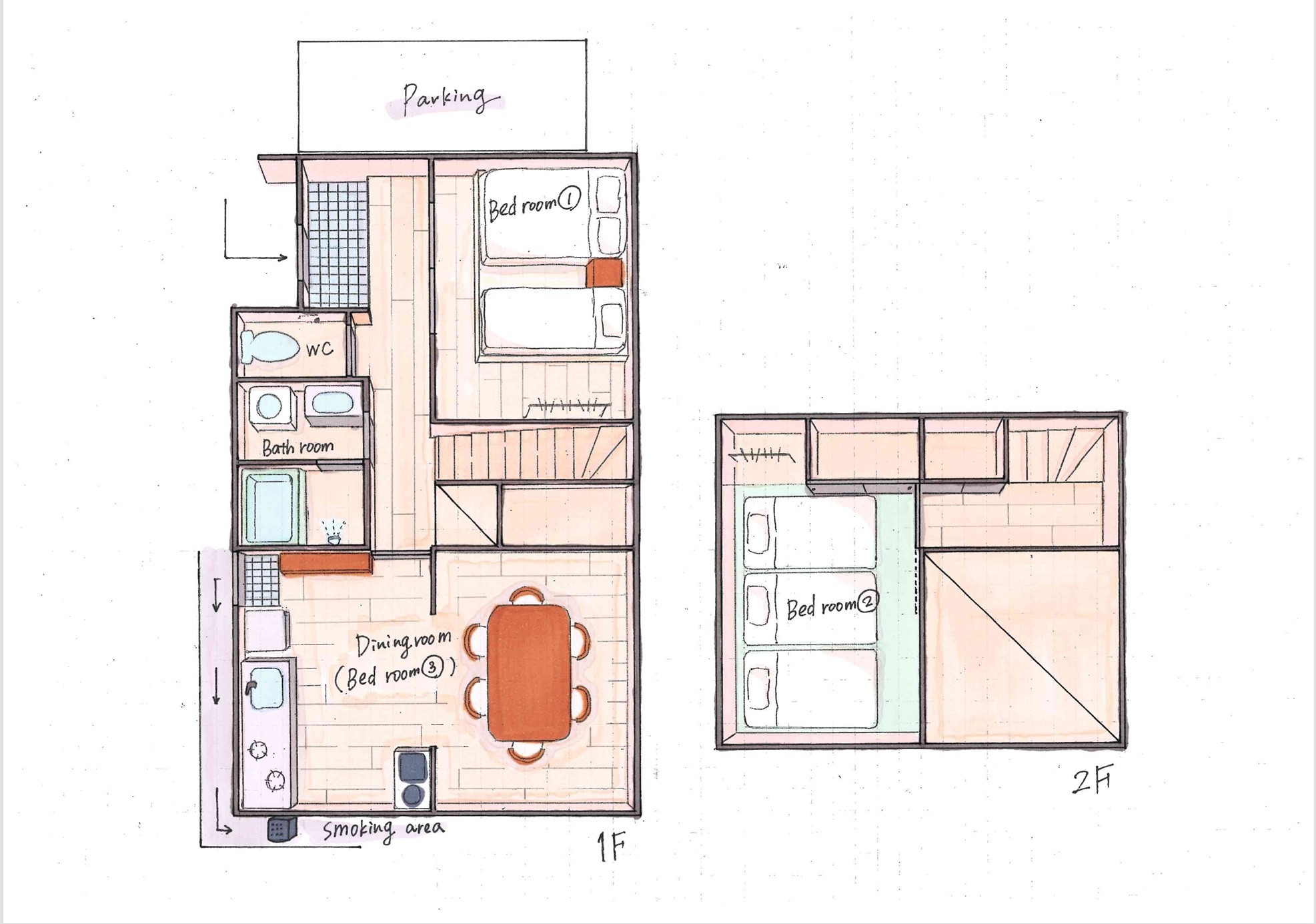 最大8名様まで宿泊可能の素泊まりプランです。宿泊人数が多いほどお得なプランとなっております。◆寝室1階洋室にはダブルベッド、シングルベッド1台ずつ。2階和室には布団3組。1階ダイニングにエキストラの布団を2組ご用意しています。※エキストラの布団をご使用になる場合は、お客様自身でダイニングテーブルを移動し、布団を敷いていただきますよう、よろしくお願い致します。◆キッチン設備システムキッチン(食洗機付、ガスコンロ2口)、冷蔵庫、電子レンジ、電気ケトル、食器、調理器具をご自由にお使いいただけます。◆無人チェックイン玄関の鍵の暗証番号を宿泊日前日にメールで送らせていただきます。◆連泊時の清掃について4日に1度リネン交換・清掃に入らせていただきます。※室内禁煙(喫煙される方は裏庭の喫煙スペースをご利用ください。)
