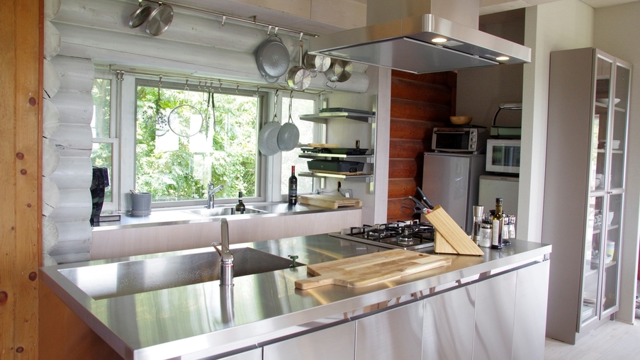 他の棟にもキッチンは完備しておりますが、テラス棟ではプロ仕様のキッチンですので、存分にお料理の腕を奮っていただけます。