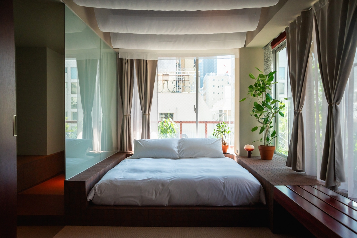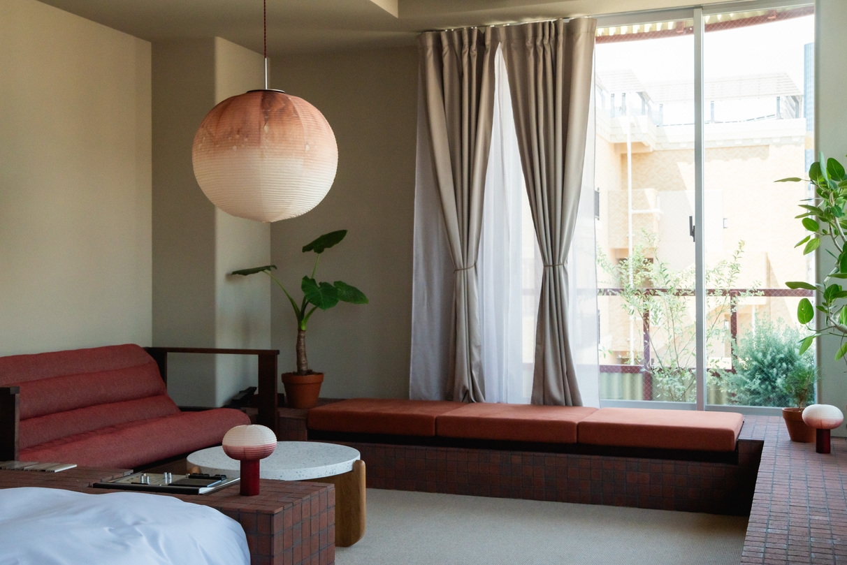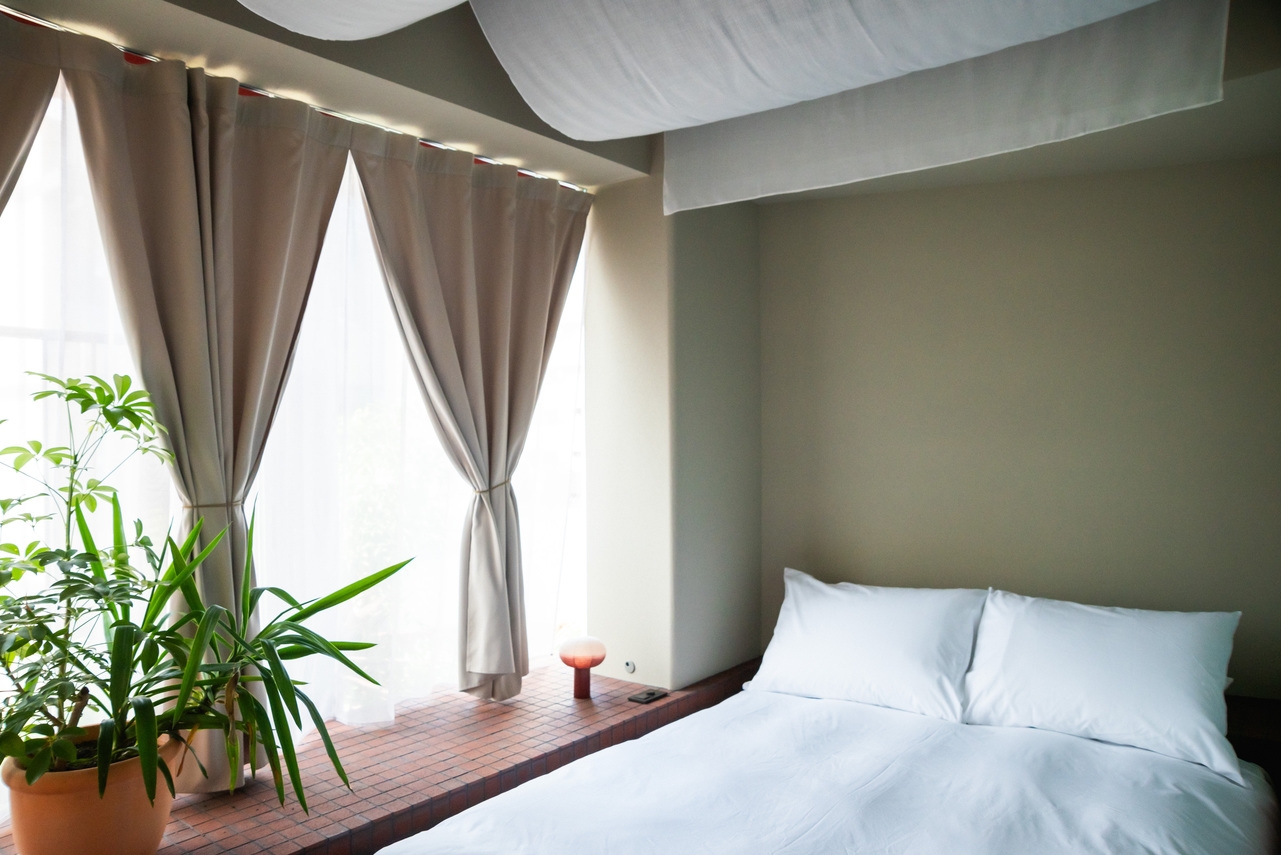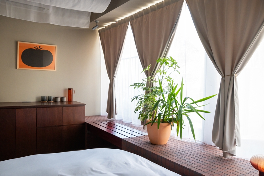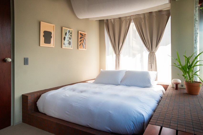 低層階に位置するスタジオタイプのクイーンルーム。2面の大開口からは路地の雰囲気や公園の緑が視界に入り室内にはクイーンベッドに加えソファとテーブルを備えています。