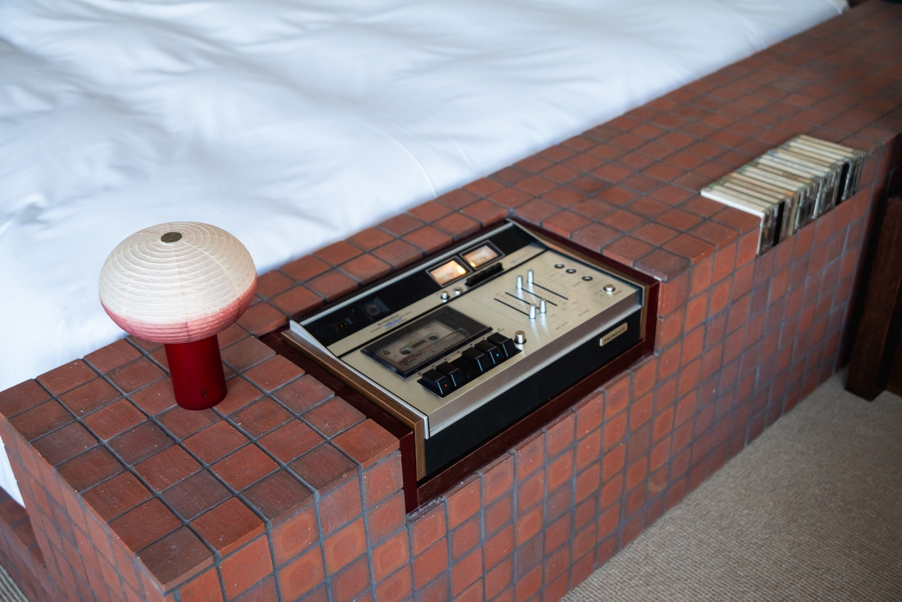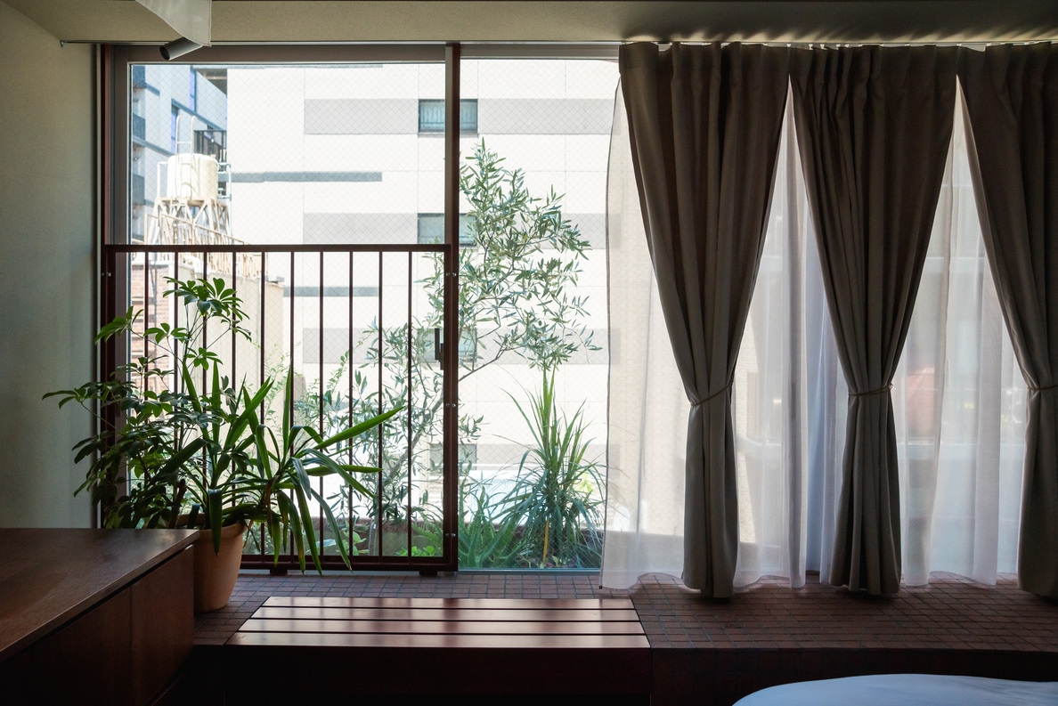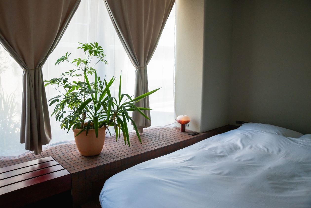 低層階に位置するスタジオタイプのクイーンルーム。2面の大開口からは路地の雰囲気や公園の緑が視界に入り室内にはクイーンベッドに加えソファとテーブルを備えています。