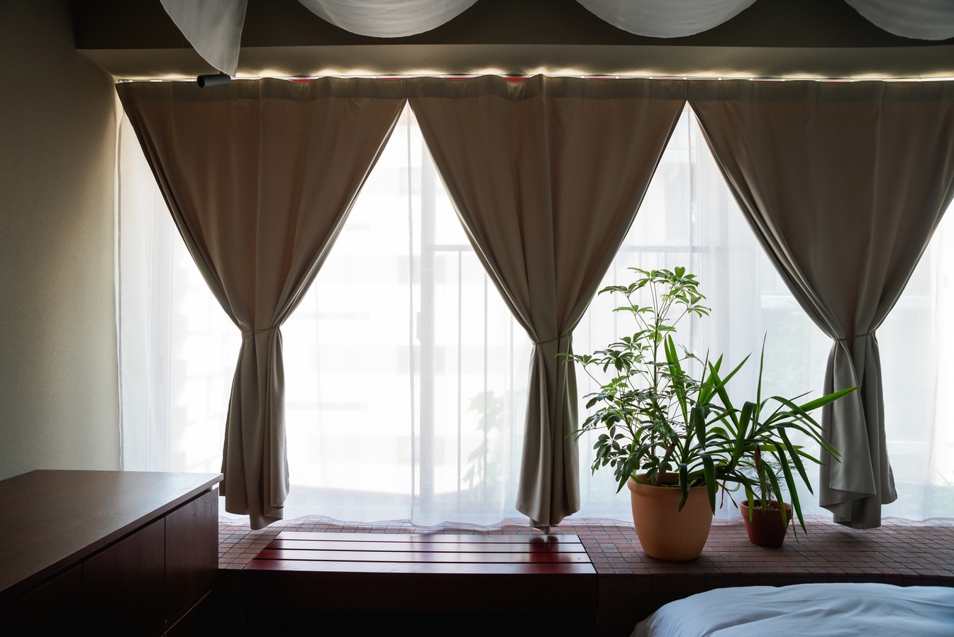 高層階の角に位置する、バスタブ付きのクイーンベッドルーム。大きな2面開口から自然光が入り、室内には明るさと抜けのある眺望が広がります。