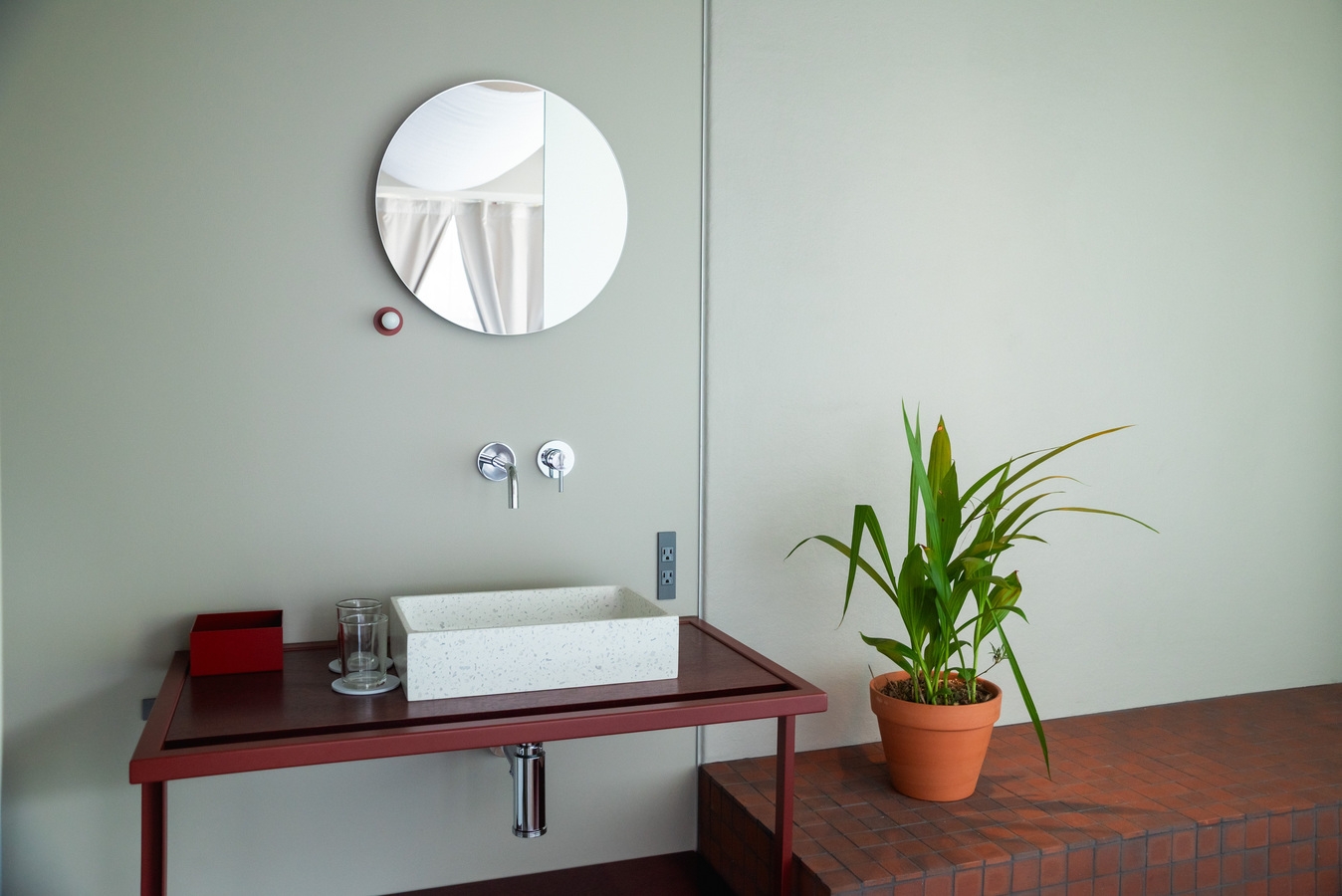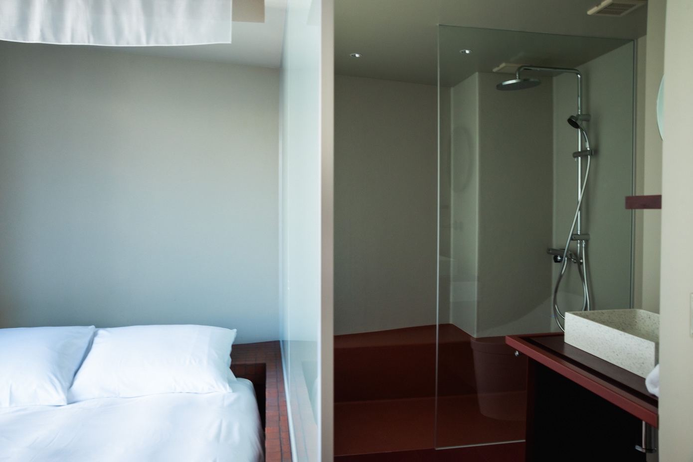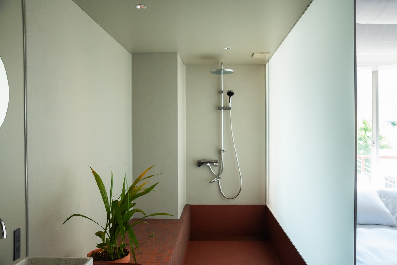 低層階に位置するダブルベッドルーム。 限られた空間ながら、ゆったりとしたシャワールームを備え、機能性と快適性のバランスがとれた設計です。