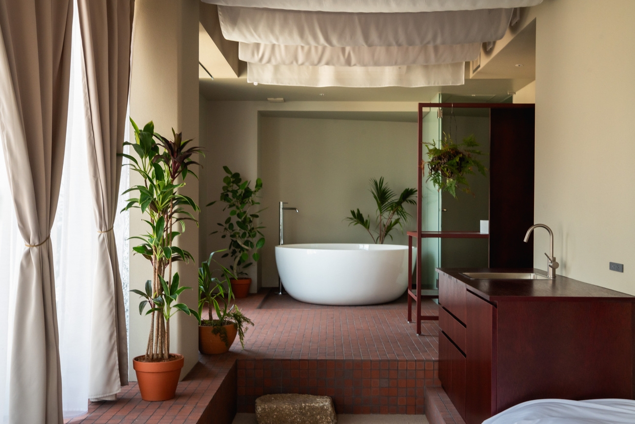 高層階に位置する、バスタブ付きのダブルベッドルーム。 コンパクトながらも浴槽を備え、旅の疲れをゆっくりと癒すことができます。