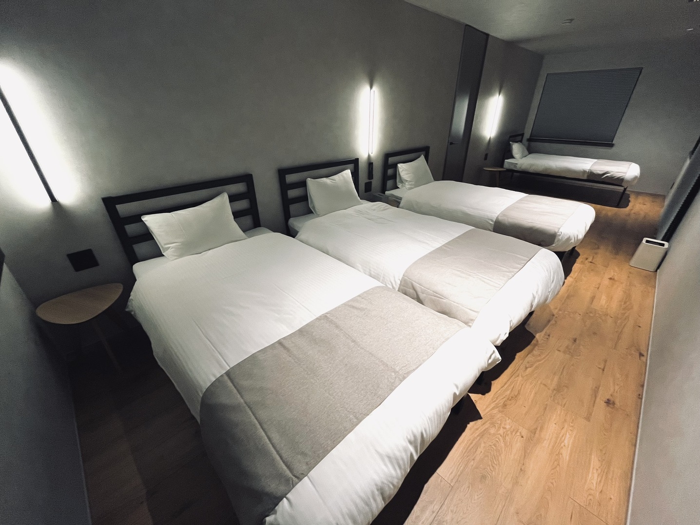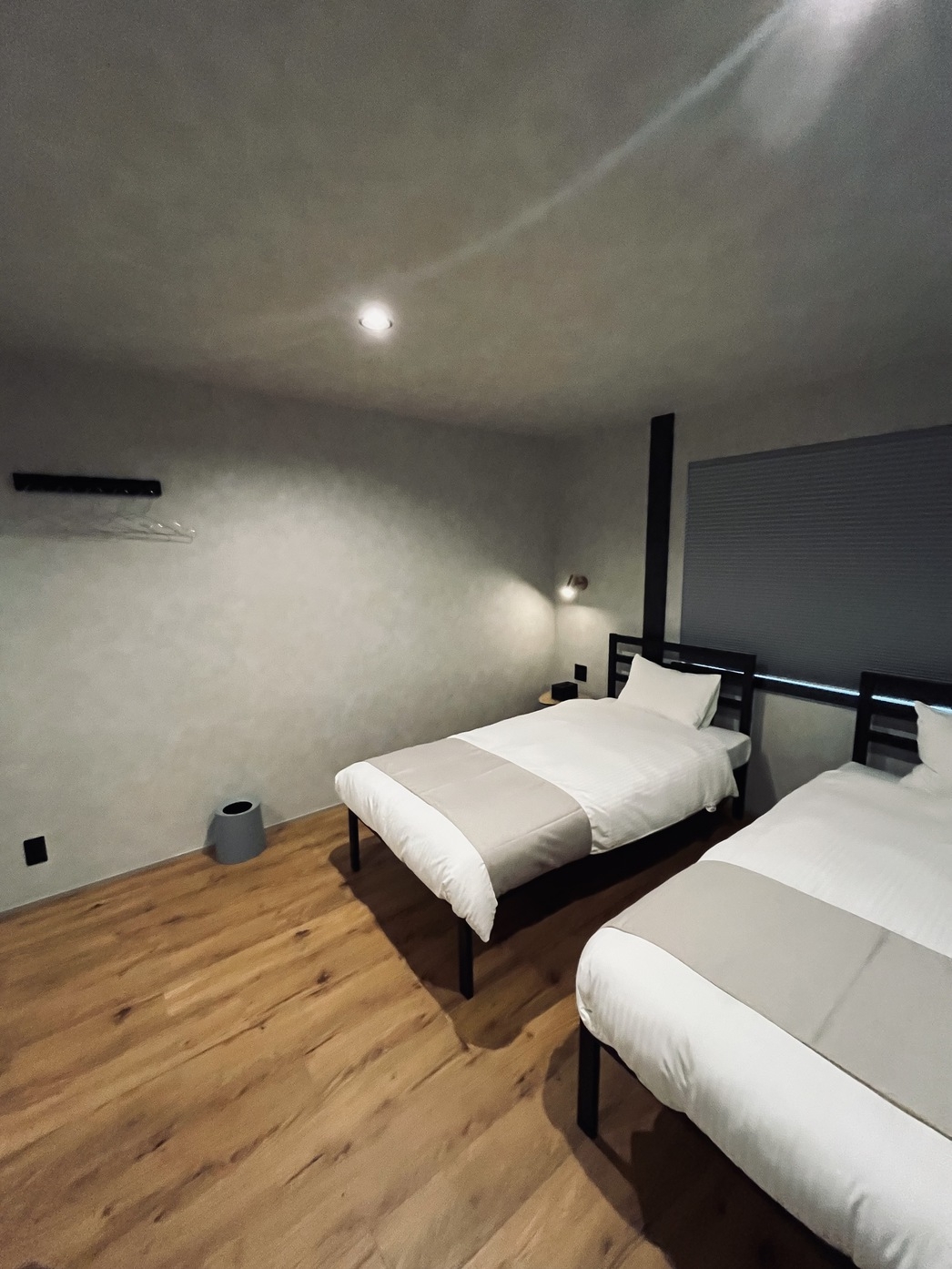 2ベッドルーム、バスルーム、洗面、トイレ2つ、シングルべッド7つ