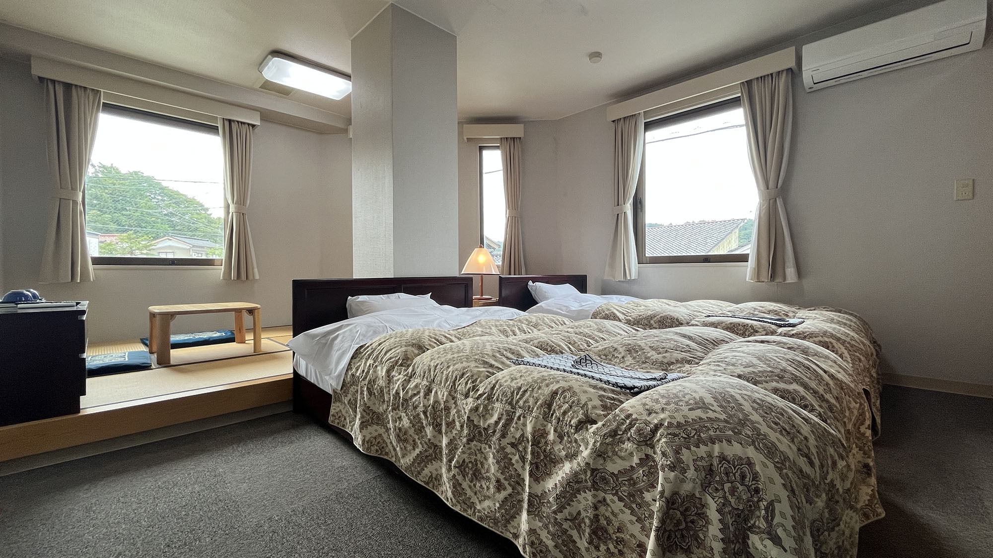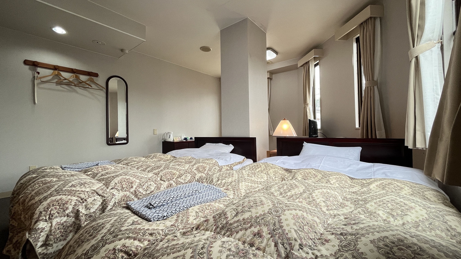 4名でご利用いただけるお部屋です。シングルベッド2台、布団2組でのご利用になります。ユニットバス付