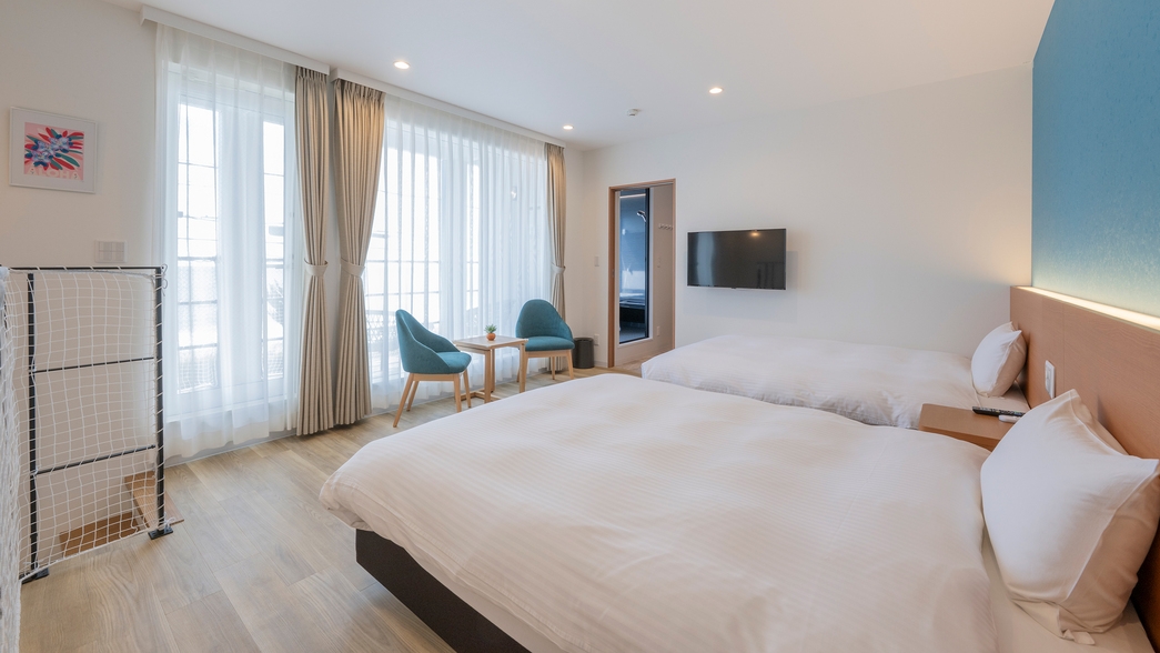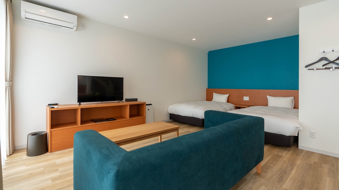 シモンズ製シングルベッド(W110×L195サイズ)2台をL字に配置。ミニテーブル・冷凍冷蔵庫・電子レンジを備えております!