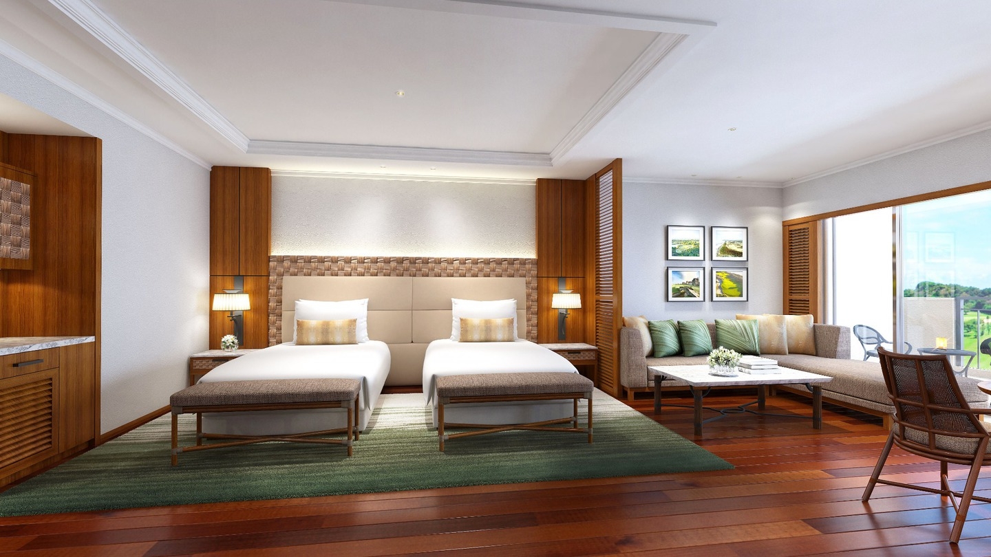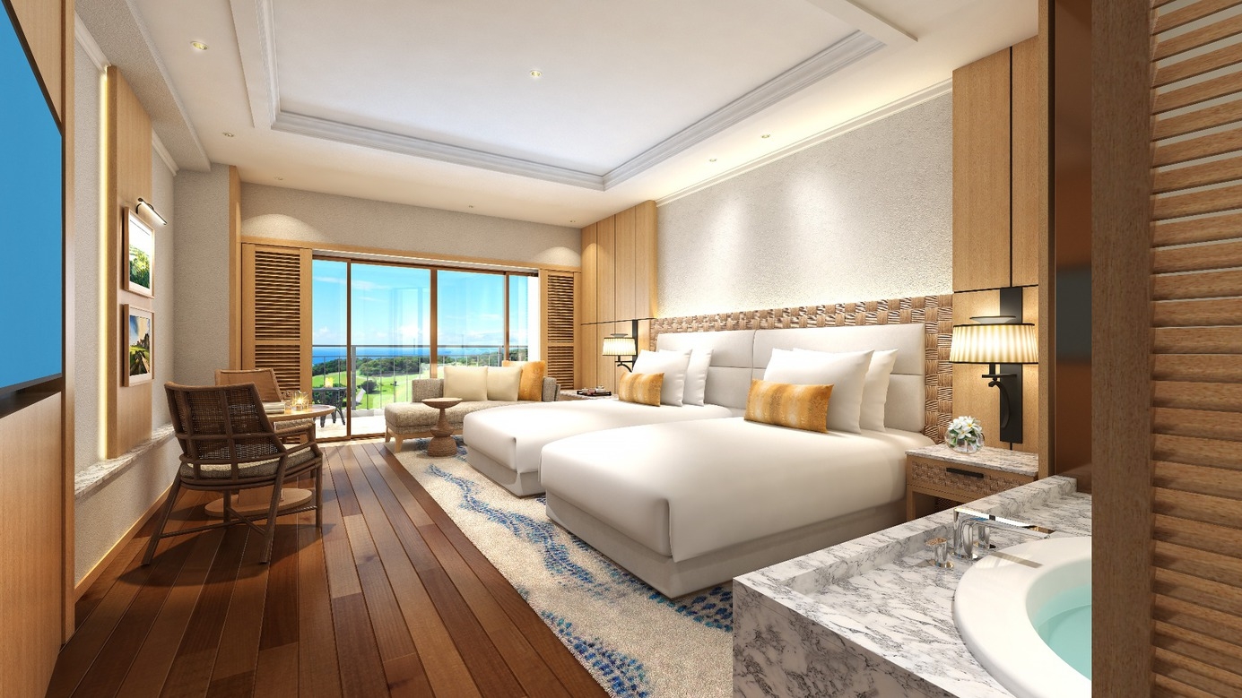 緑に包まれたゴルフコースと、その先に望む海を背景に、静けさと上質が調和した癒しの空間。シンプルでありながら洗練された客室では、時の流れさえもゆるやかに感じられます。